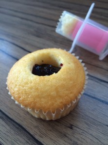 Eine super Füllung ist schlichtweg Marmelade! In diesem Fall Heidelbeermarmelade. Dazu entweder mit einem scharfen Messer oder Ausstecher aus den abgekühlten Cupcakes mittig einen Teil entfernen und mit einem Teelöffel etwas Marmalde hineingeben. Ein kleiner Klecks reicht schon aus! Über selbstgemachte Marmelade geht natürlich nichts, das muss ich schon erwähnen! Den ausgeschnittenen Deckel wieder drauflegen und schon kann das Frosting drauf.