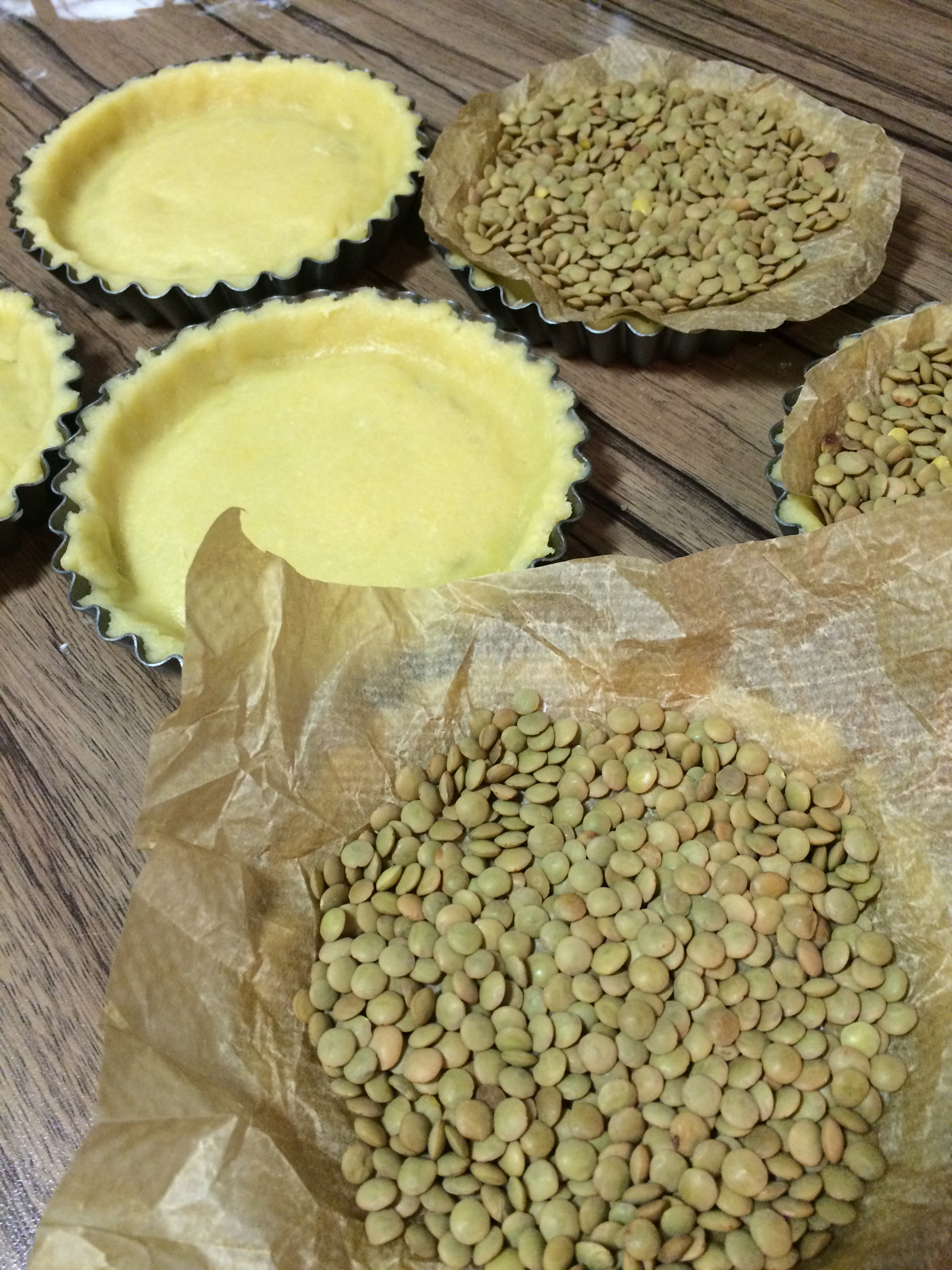 Die kleinen kalten Butterstückchen kommen zuerst in eine Rührschüssel. Puderzucker, Salz, Ei, Mehl und Mandeln folgen ihnen unauffällig. Die Zutaten entweder mit der Küchenmaschine oder einem Rührgerät und dem Knethaken zu einem glatten Teig verarbeiten. In Frischhaltefolie gewickelt, muss der leckere Mürbteig mindestens eine Stunde in den Kühlschrank gelegt werden. An der Stelle muss ich zugeben, dass Mürbteig echt nicht zu meinen Lieblingen zählt. Warum? Das weiß ich nicht, denn den Teig zu essen, das liebe ich. Bei diesem Versuch hatte ich wahnsinniges Glück: Eigentlich wollte ich mit meiner Mama zusammen backen und diesen Nachbackversuch starten. Das Schicksal meinte es aber gut mit mir und so kam der fertige, gekühlte Mürbteig am Abend per Taxi Mann zu mir, da es mir nachmittags nicht reichte, zu meiner Mama zu fahren. Tapfer übernahm ich den Teig und backte zu Hause allein weiter. Der Teig muss blind gebacken werden. Dazu teilte ich ihn zunächst in 6 Teile (6 Tartelettes) und wellte diese auf der gemehlten Arbeitsfläche ungefähr in die Größe der Förmchen aus. Für das Einfetten der Förmchen kann ich nur Backtrennspray empfehlen! Den Mürbteig dann in die gefetteten Förmchen drücken und mit Backpapier zudecken. Das Backpapier ist ja für gewöhnlich eher störrisch, daher einmal gut zerknüllen und sein Wille ist gebrochen. Auf das Backpapier kommen dann zum Beschweren getrocknete Erbsen, Bohnen oder wie bei mir: Linsen.