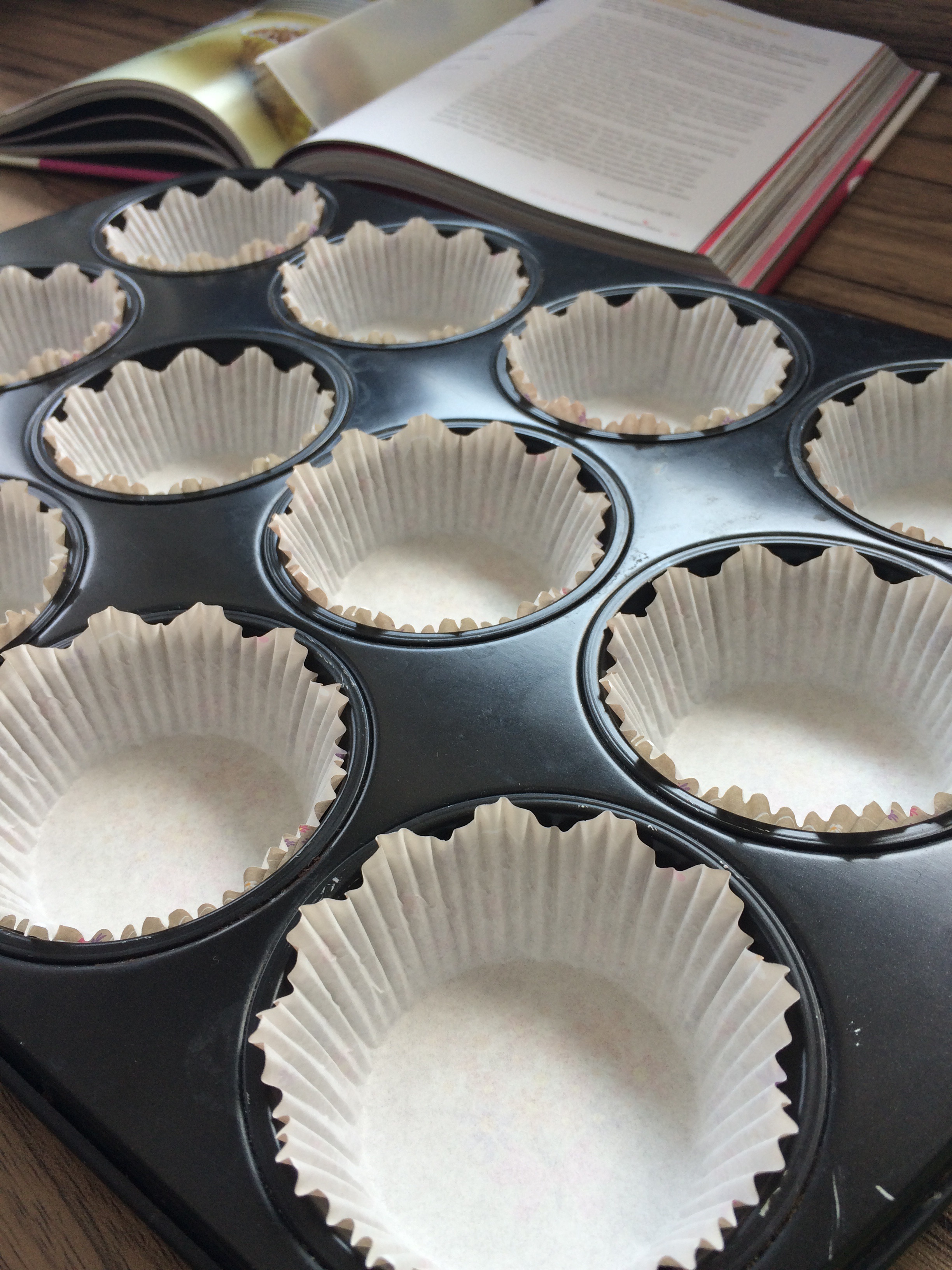 - Den Backofen heizt ihr auf 175 Grad Ober/Unterhitze vor und die Papierförmchen können auch schon ins Blech.
