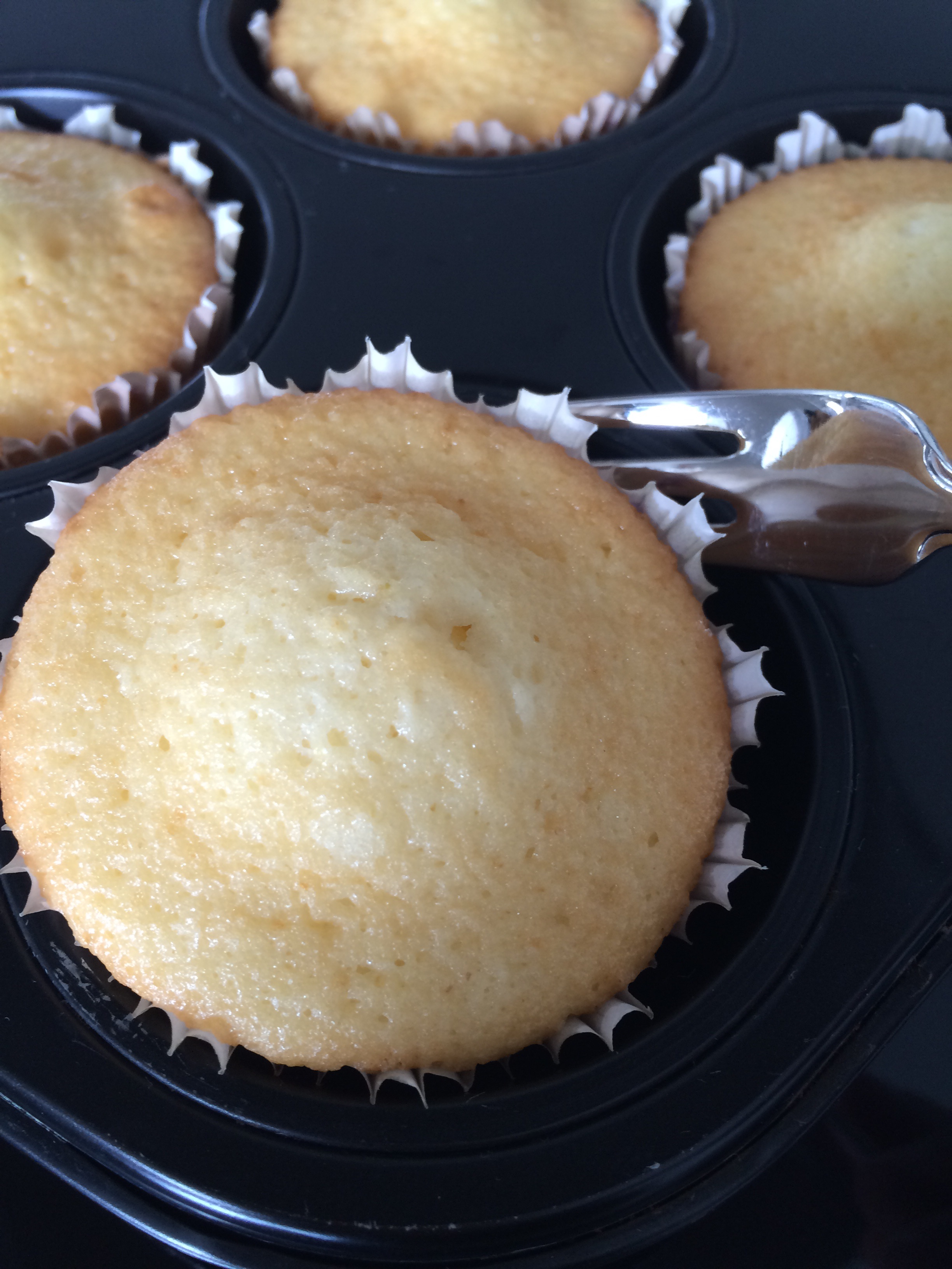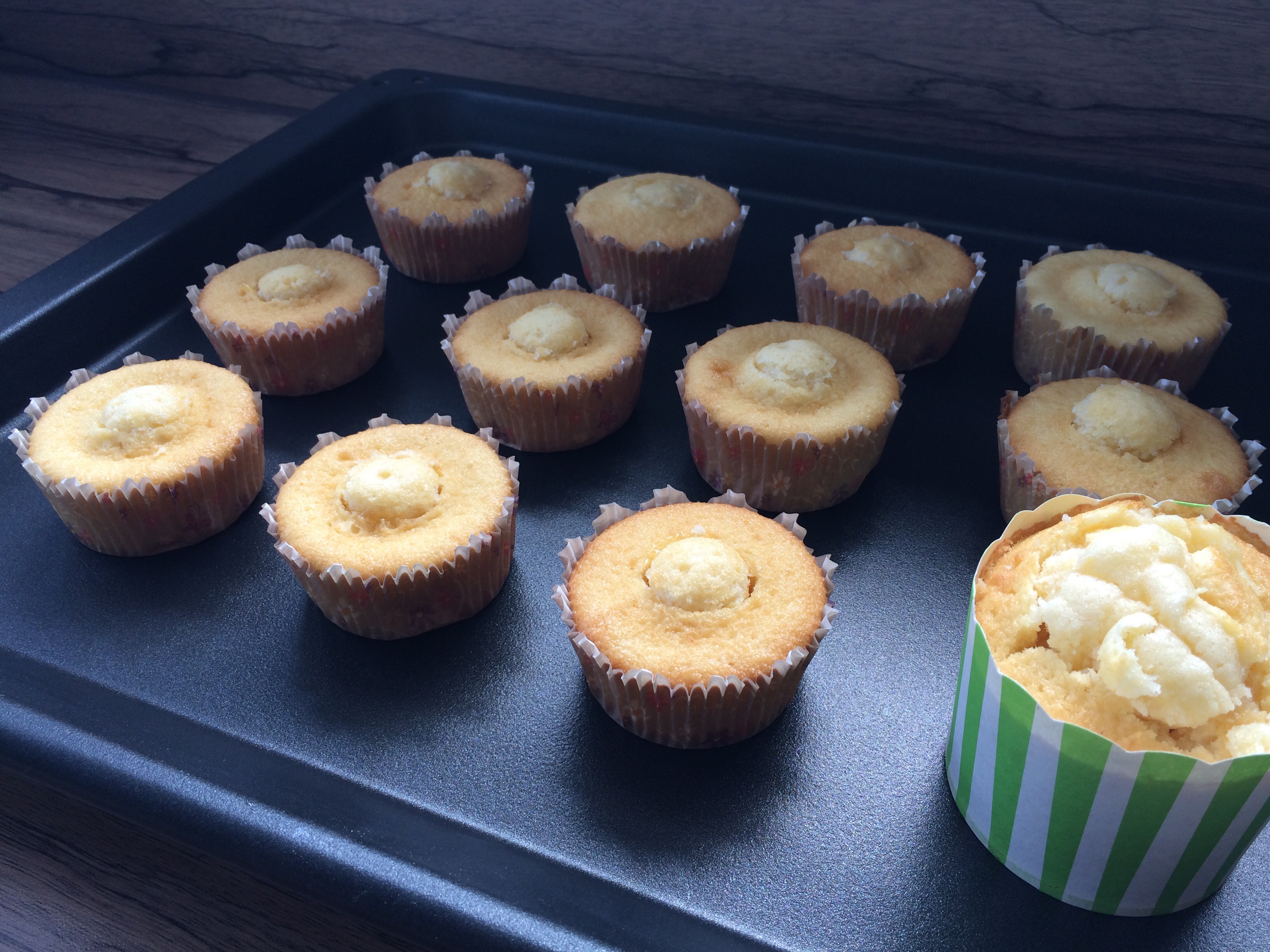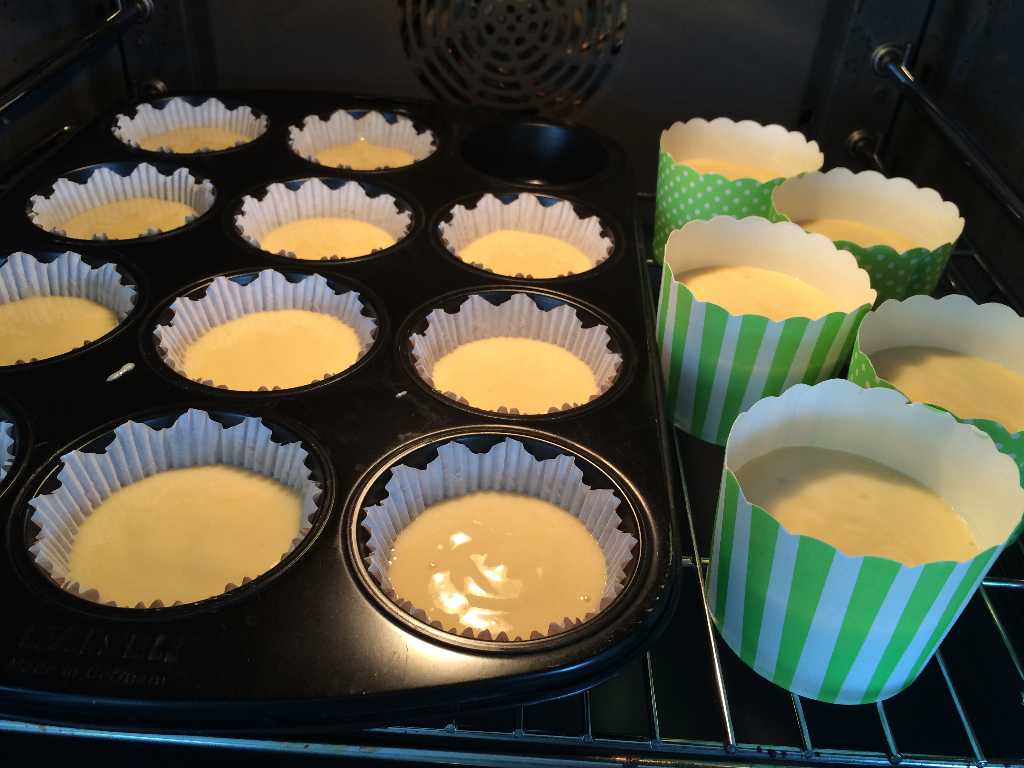 - Der Teig reicht für ca. 22-24 Cupcakes, diese kommen nach 17 Minuten duftend aus dem Ofen. Der Stäbchentest ist immer sinnvoll, denn jeder Ofen backt ja etwas anders. Die Farbe ist eher blass bis hellgelb, erwartet keine Bräunung, dann sind sie nämlich zu lang drin gewesen.