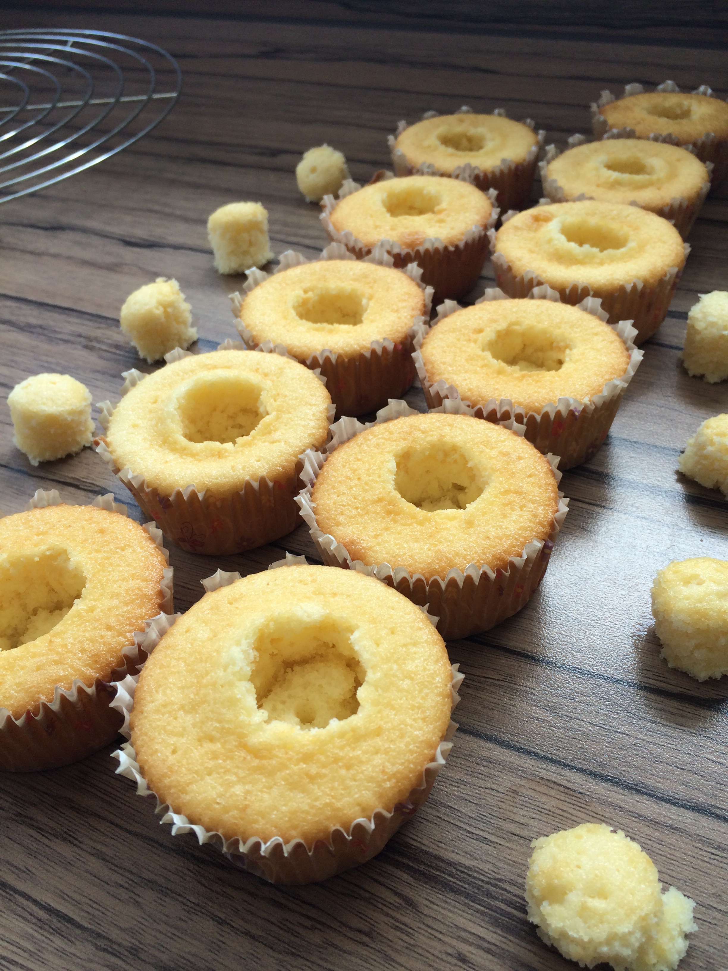 Die Cupcakes abkühlen lassen, aus der Form nehmen und dann für die Füllung mit dem Messer ein Stückle herausschneiden aus der Mitte, ca. 3cm tief und 2cm breit/rund…ihr wisst, was ich meine 🙂 oder einfach einen Ausstecher nehmen.