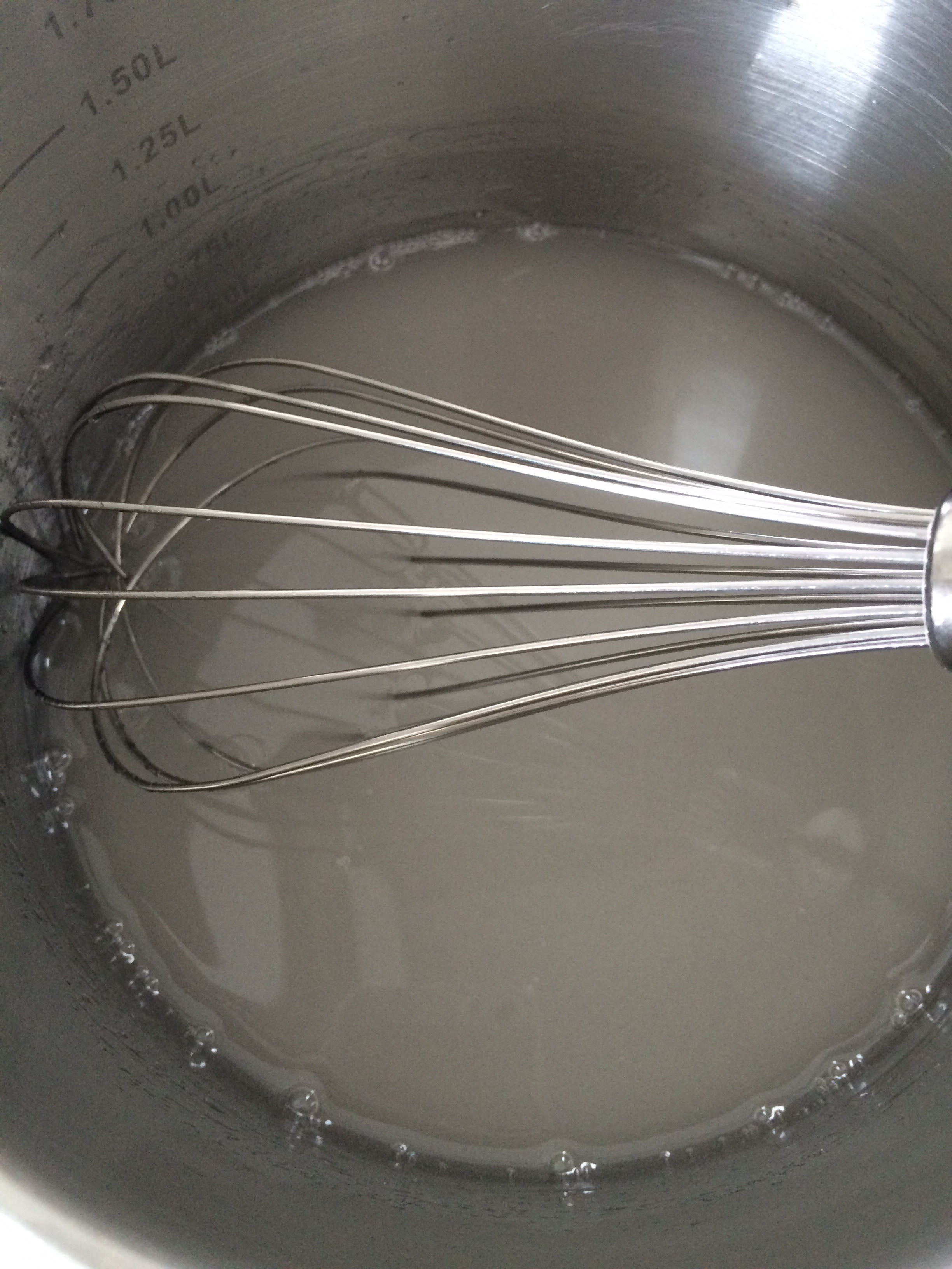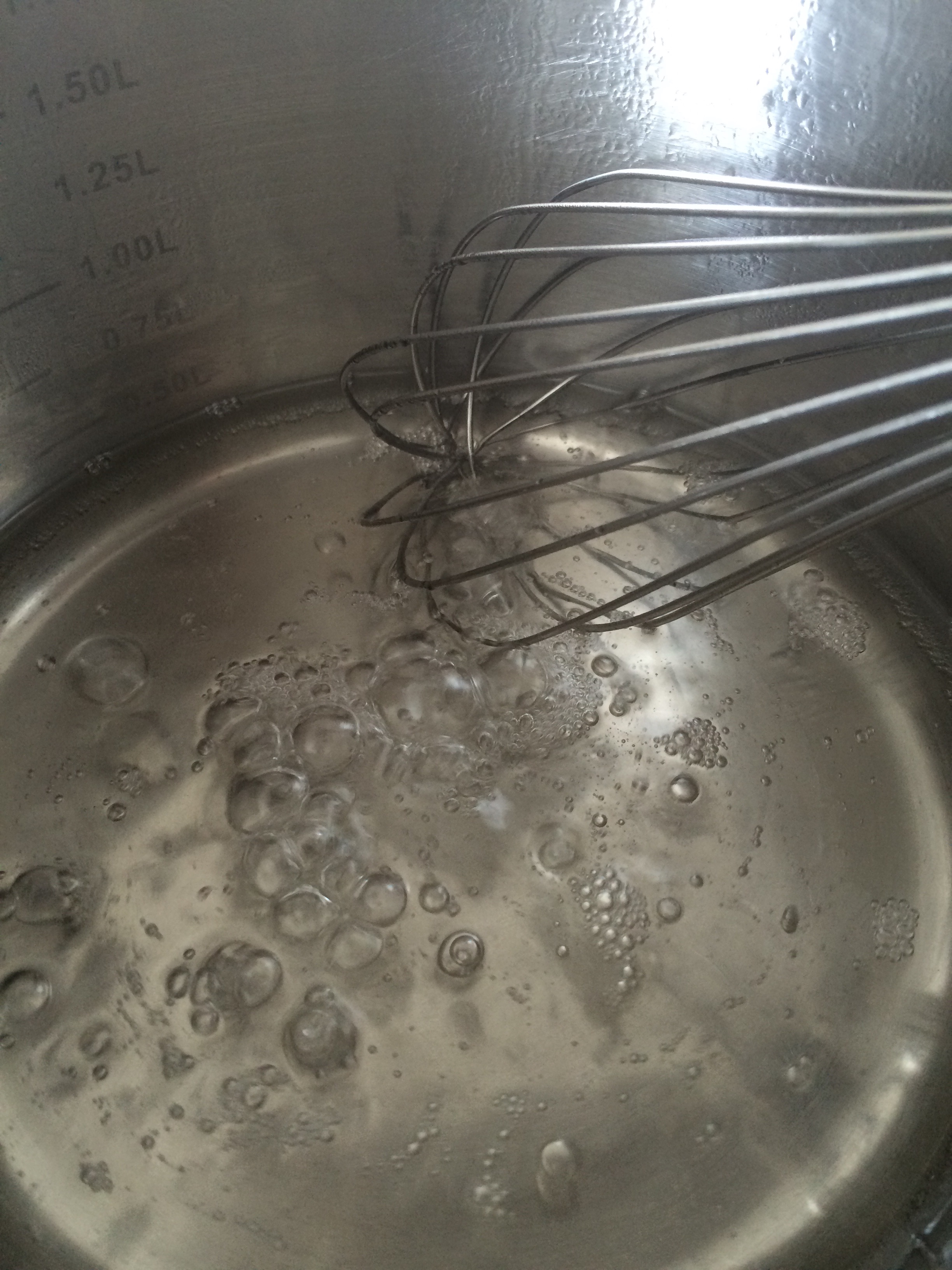 - Für das Baiser 75ml Wasser mit dem Zucker in einem Topf aufkochen und 10-12 Minuten köcheln lassen.