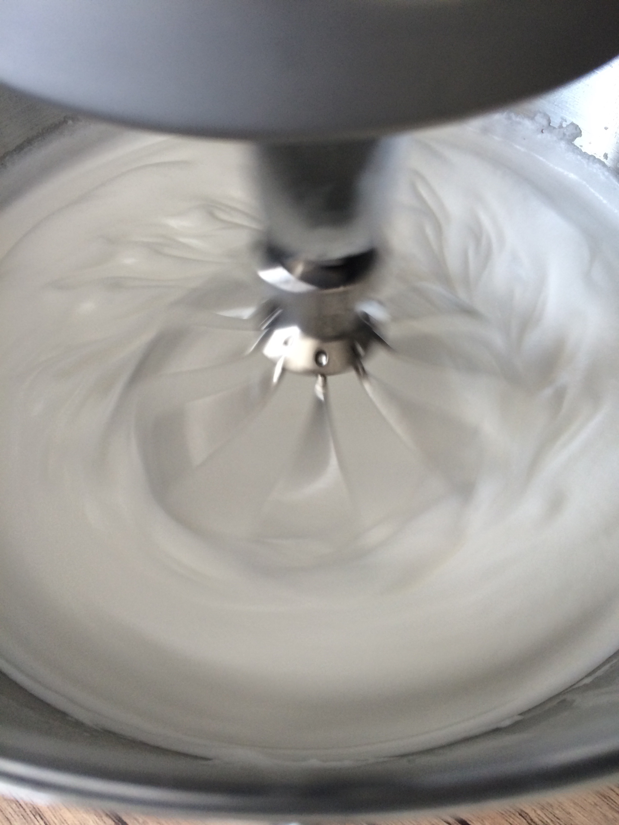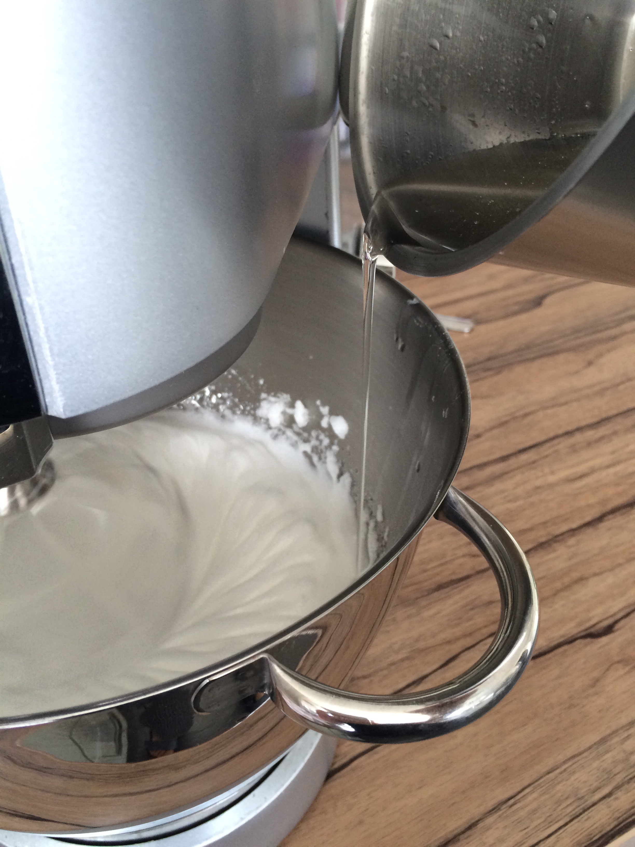 - Die Zuckersirup gießt ihr nun langsam in den Eischnee, während dieser weiter geschlagen wird.