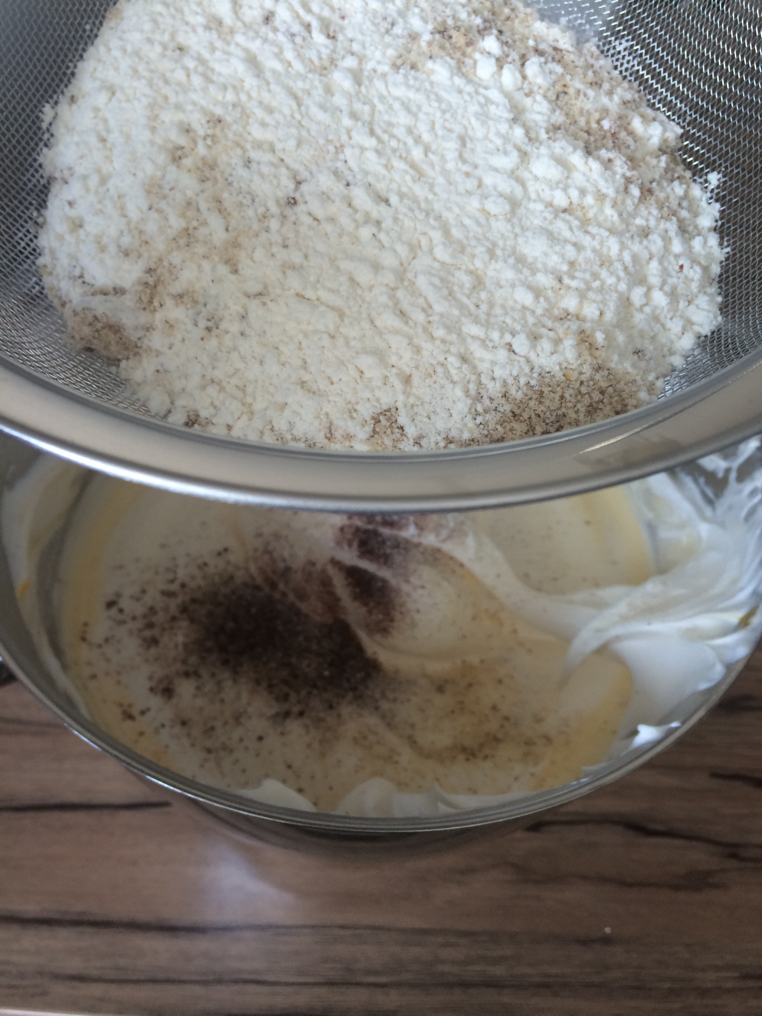 - Das Mehl, die Mandeln und der Kakao werden in einer extra Schüssel gewogen, dann in die Eier-Zucker-Masse gesiebt und dann unter den Teig gehoben.