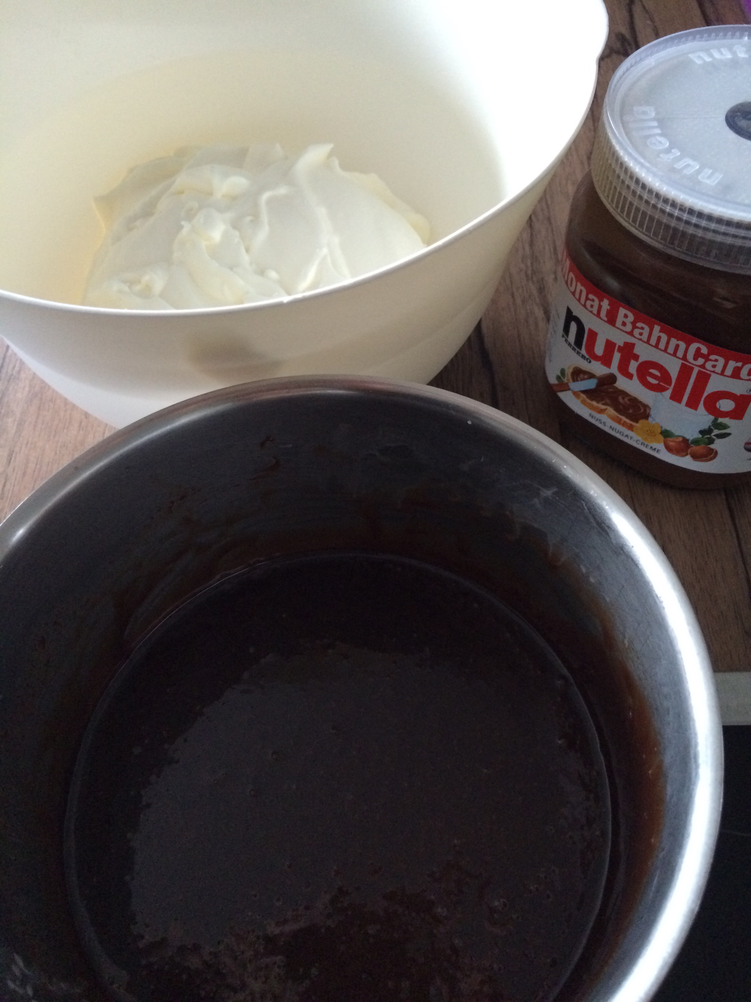Von der Sahne füllt ihr 150g in einen Topf und kocht diese kurz auf. Den Topf zieht ihr dann von der Platte und gebt 2 EL Nutella rein und rührt diese mit dem Schneebesen unter. Je nach Bedarf könnt ihr auch noch einen weiteren Esslöffel dazutun 😉 Nun lasst ihr die Masse stehen, damit sie etwas auskühlen kann. In der Zeit schlagt ihr die restlichen 250g Sahne steif und lasst dabei ein Päckle Vanillezucker einrießeln.