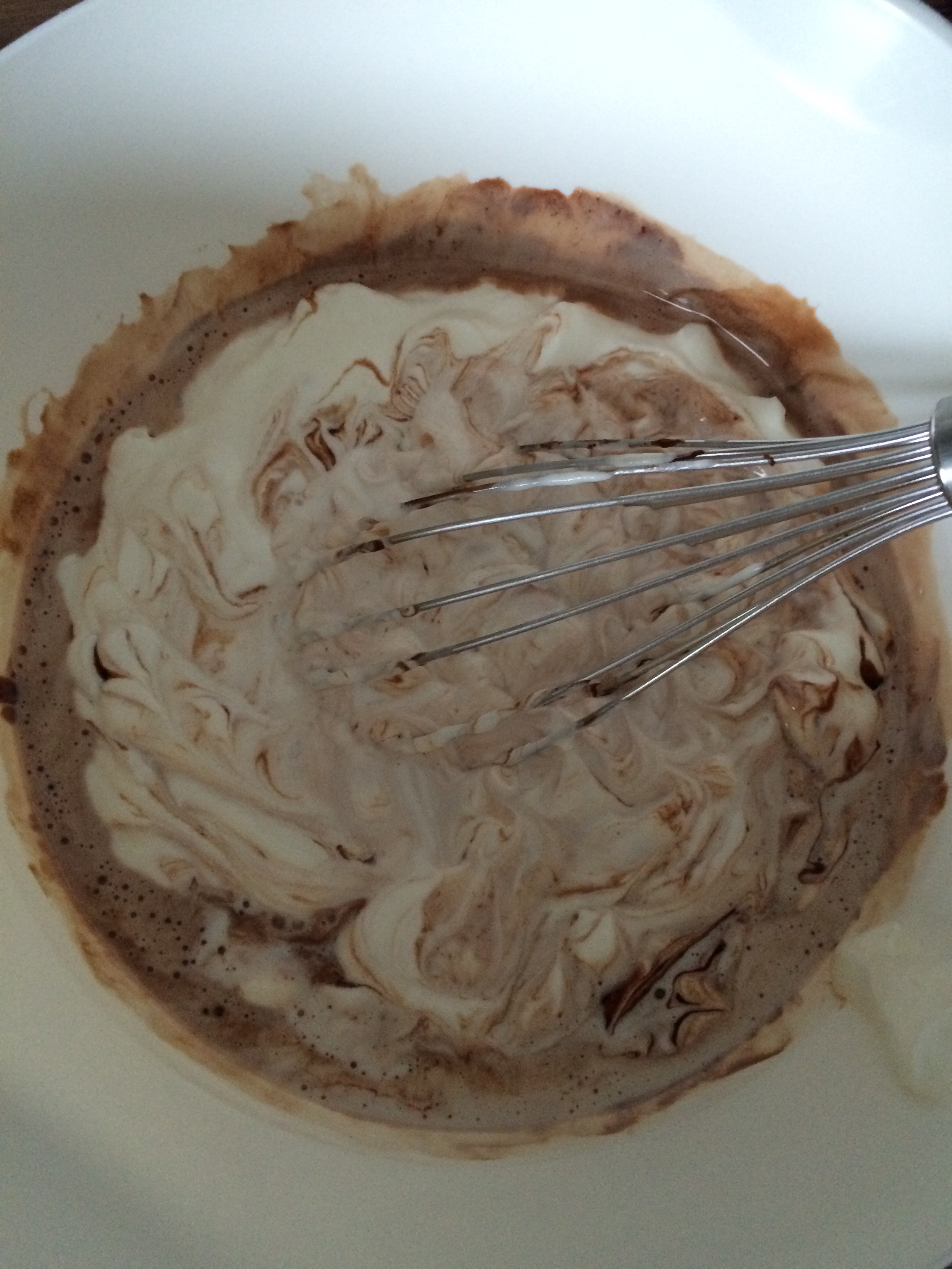 Nun kommt die geschlagene Sahne in die Nutellamischung und ihr rührt sie solange um, bis eine homogene Masse entstanden ist. Nun gebe ich einen gehäuften Teelöffel Kakaopulver dazu und rühre auch diesen unter. Fertig!