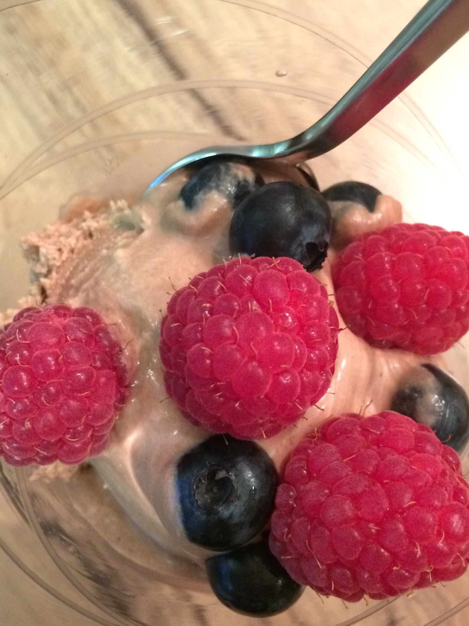 Scherzle 😉 Für 4 Portionen oder ca. 6 Kugeln Eis reicht diese Menge bei mir. Wir haben leckere Himbeeren aus Opa Helmuts Garten dazu genossen und ein paar Heidelbeeren (aus dem Supermarkt).
