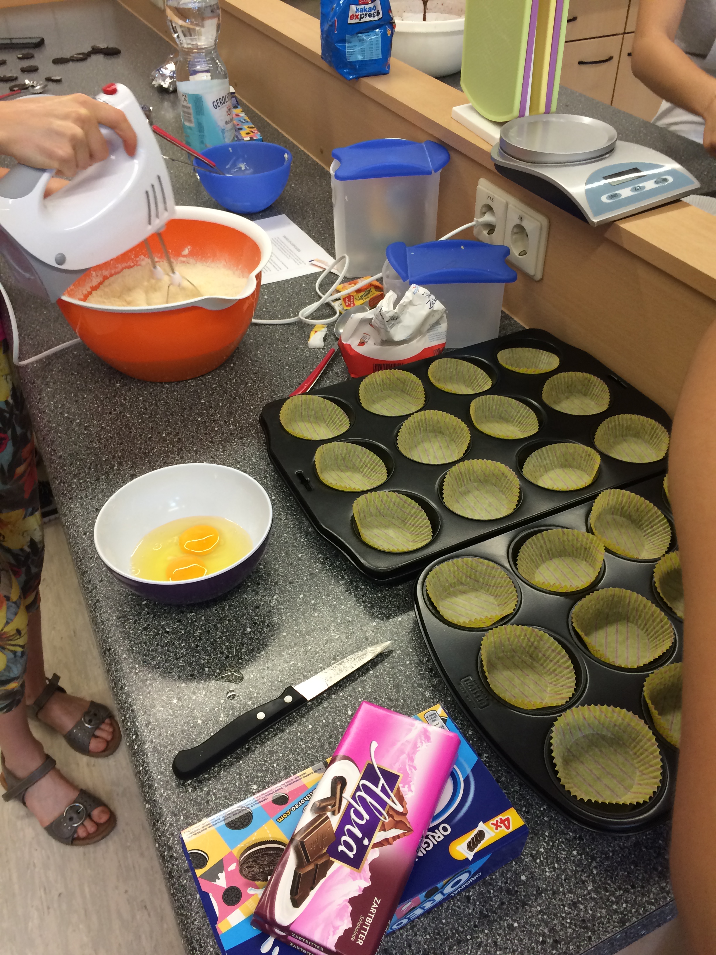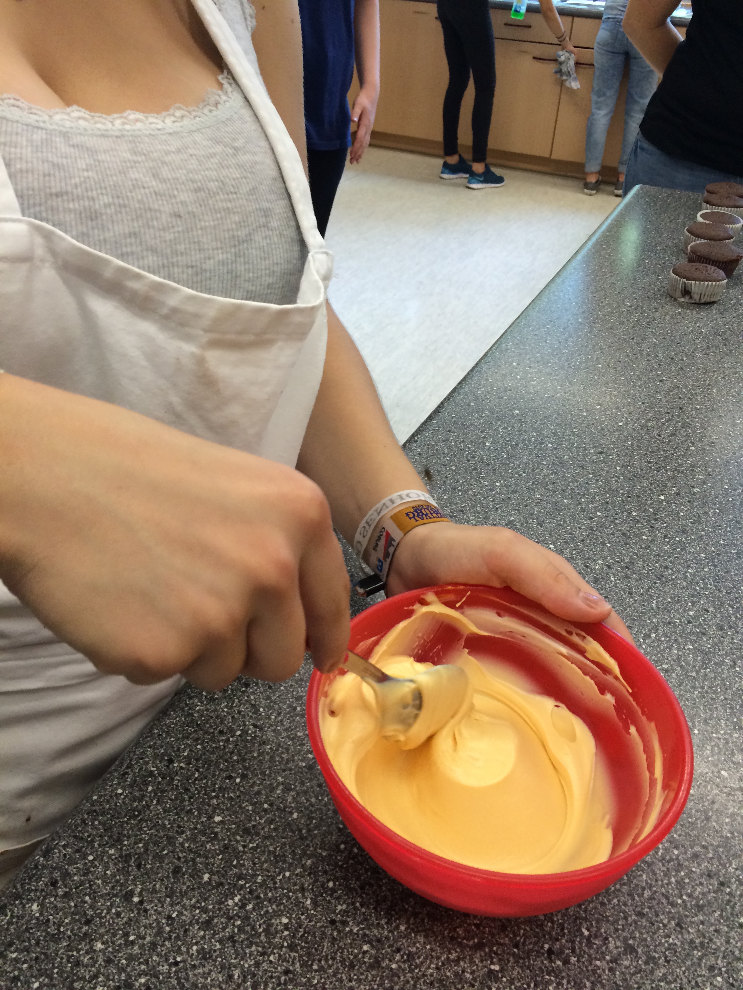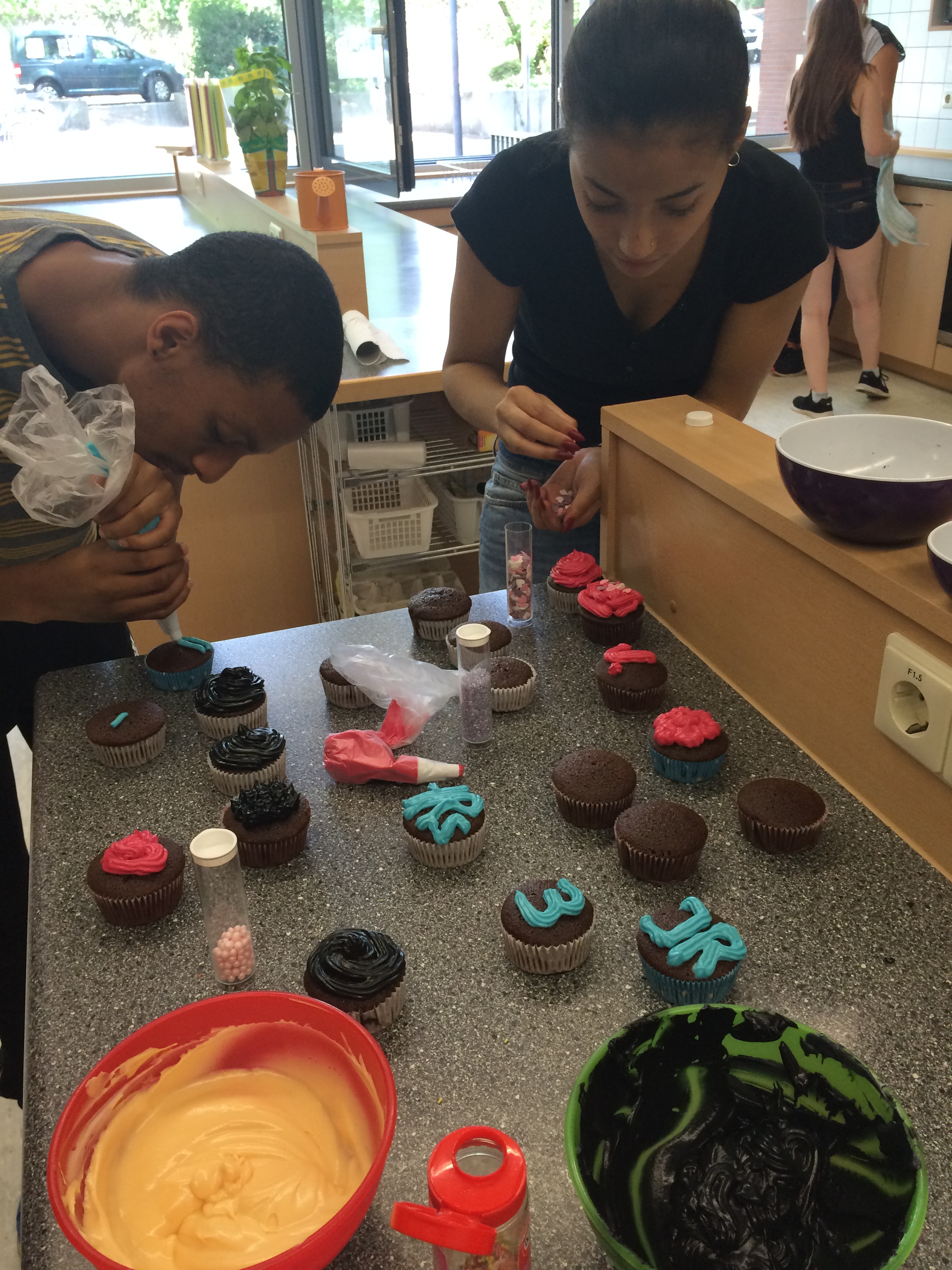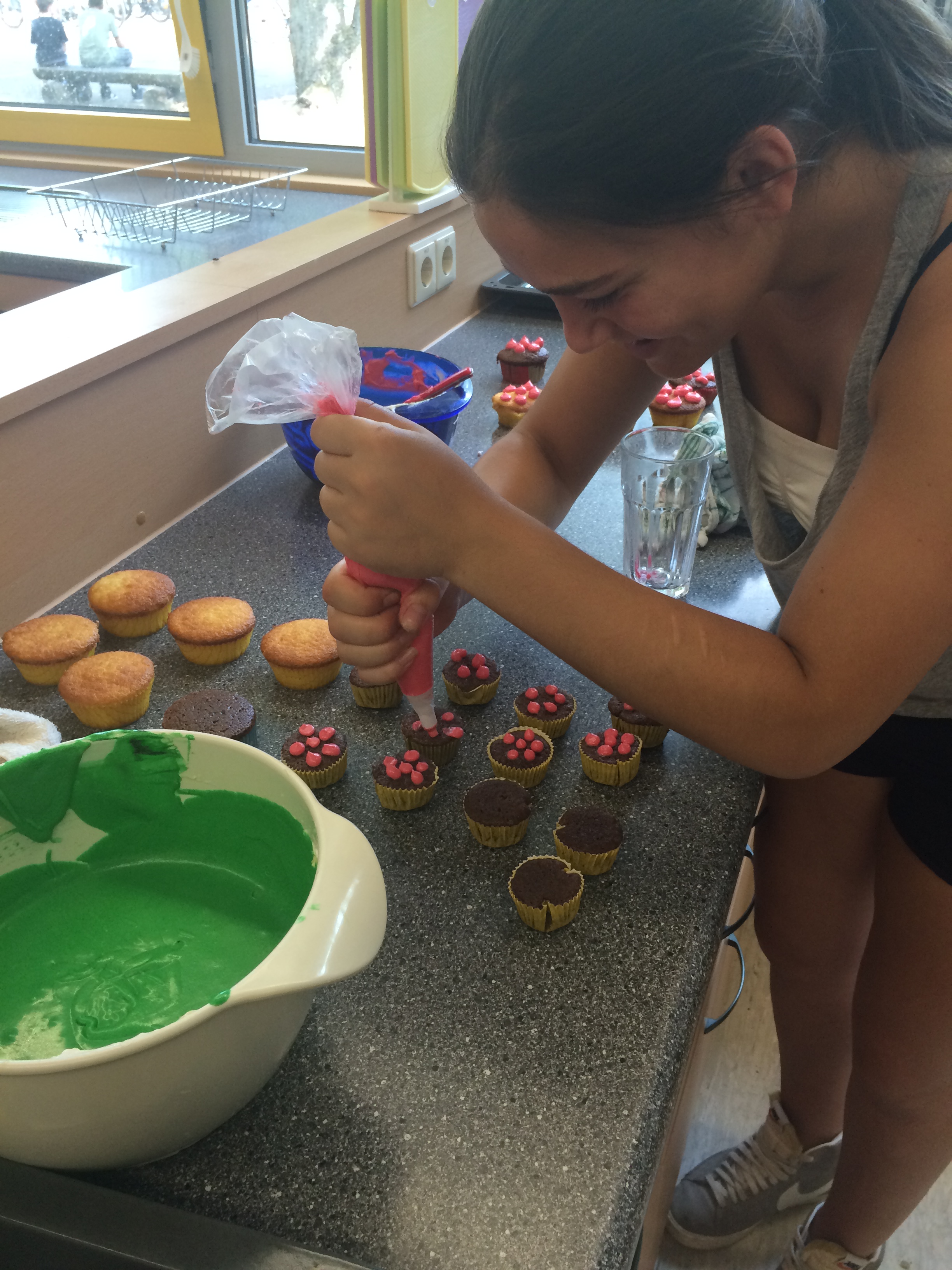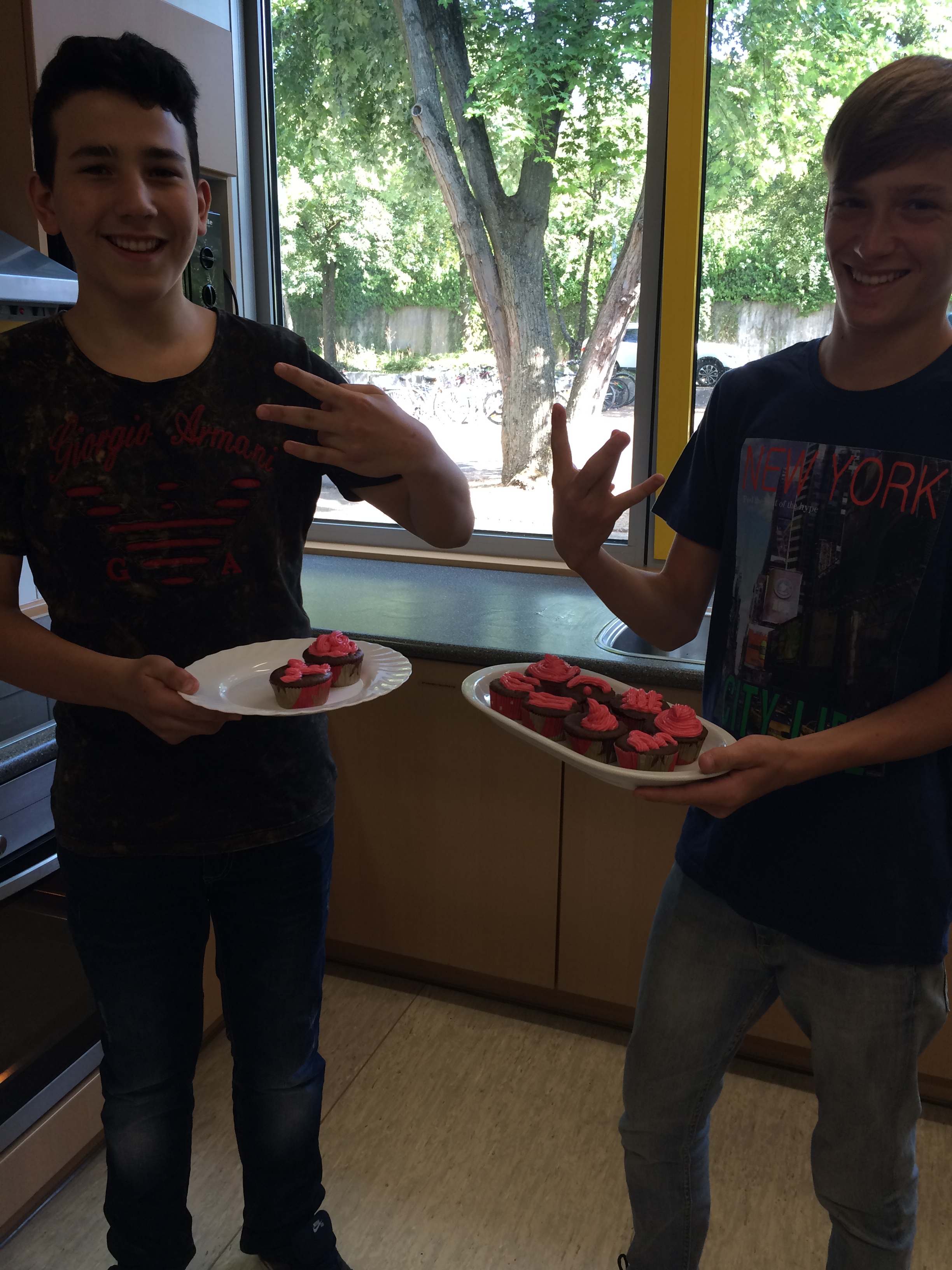 Der zweite Tag war dann für Cupcakes reserviert. Die 4 Gruppen suchten sich verschiedene Rezepte aus und backten wie die Weltmeister! Schoko-, Vanille- und Oreo-Cupcakes mit verschiedenen Frostings waren das Ergbnis, das sich echt sehen lassen konnte. Meine Kollegin und ich waren dermaßen überrascht wie fleißig unsere Projektgruppe war, denn selbst das Kücheputzen war kein Thema. Nach 180 Minuten war zwar die Geduld und die Freude etwas am Ende, was wir aber voll nachvollziehen konnten: Denn es war zu aller Arbeit schrecklich heiß an dem Tag!