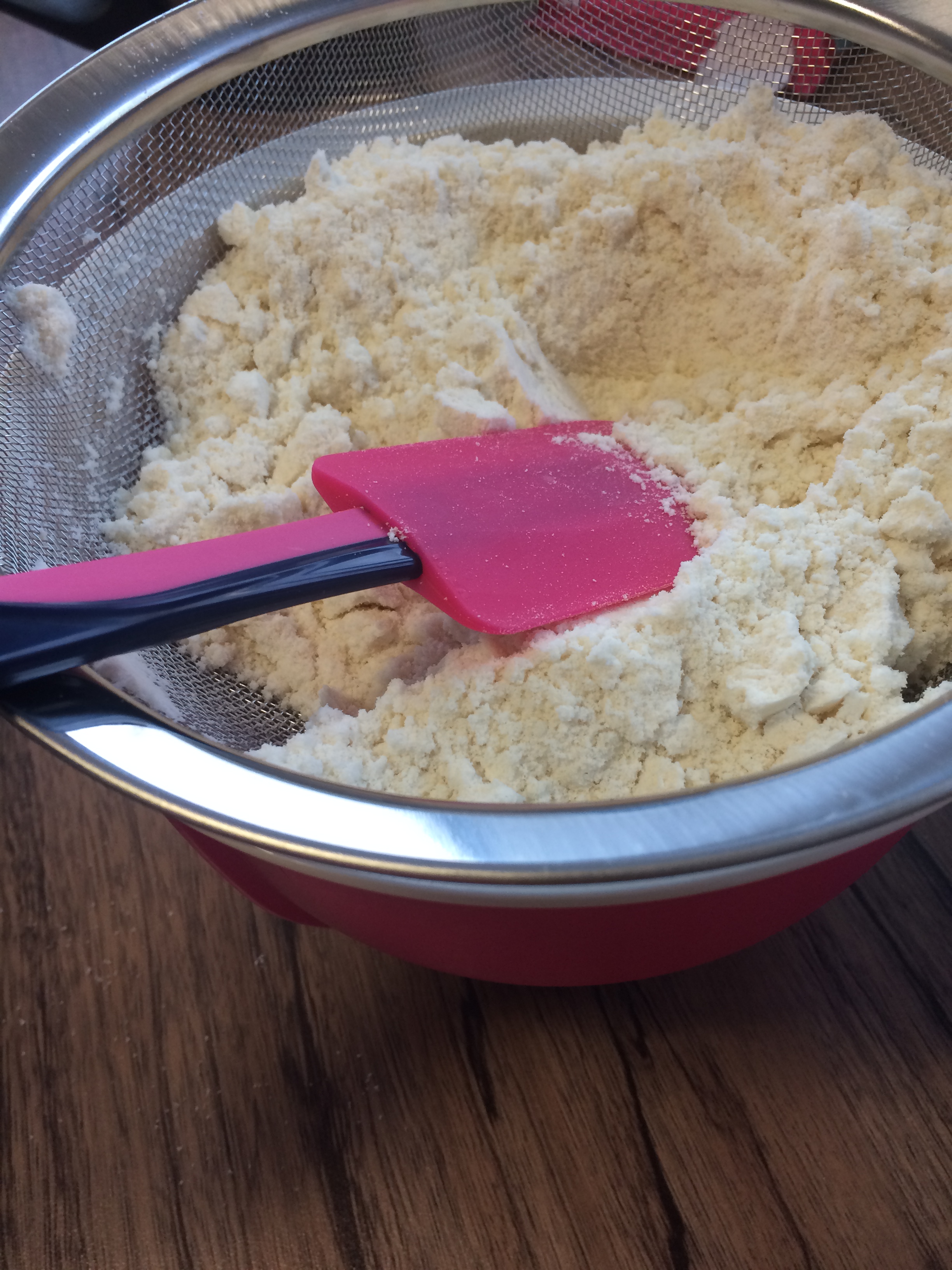 Die Mandeln mit dem Puderzucker mischen und mehrmals gut sieben. Wer einen Thermomix besitzt, 10 Sekunden auf Stufe 10 – dann ist die Masse fein gemahlen und vermischt! Es sollen keine Stückchen mehr drin sein. Ich sieb die Masse selbst nach der Thermomixvariante sogar noch einmal.