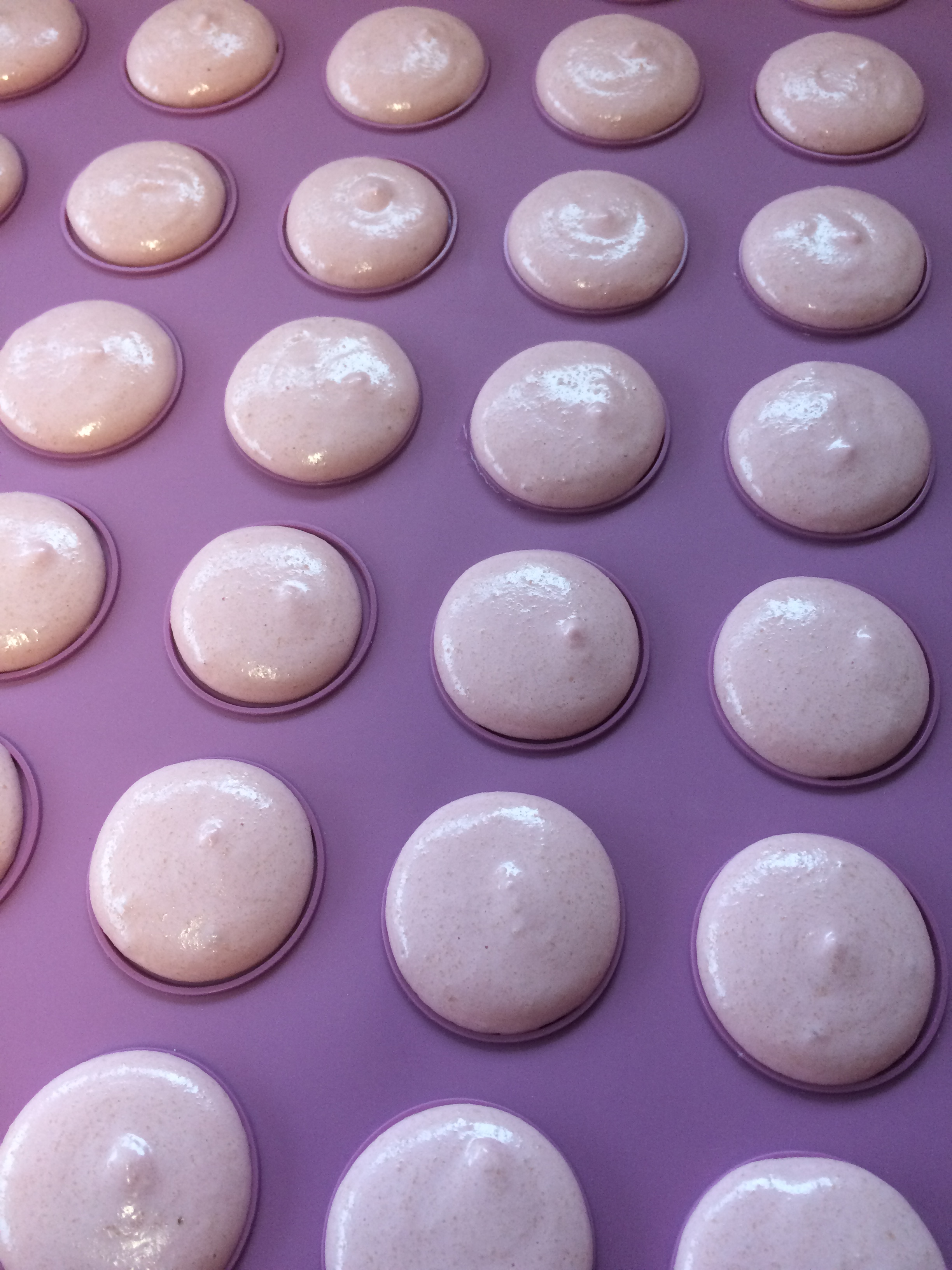 Das Spritzen ist eigentlich easypeasy. Einfach von der Mitte eines Kreises den Teig aufspritzen, also keine Kreisbewegungen oder so starten. Wenn alle Kreise gespritzt sind, klopft ihr das Blech mehrmals auf die Arbeitsplatte und schlagt mit der flachen Hand von unten gegen das Blech. Das Blech lasst ihr nun 30 Minuten stehen und schaut, dass es nicht zieht 😉 Der Backofen kann nach 20 Minuten vorgeheizt werden auf 130 Grad Umluft. Gebacken werden sie dann knapp 20 Minuten. Sobald die Macarons im Ofen sind könnt ihr auf 125 Grad zurückgehen. Aber: lernt Euren Ofen kennen. Einer backt stärker, ein anderer schwächer.