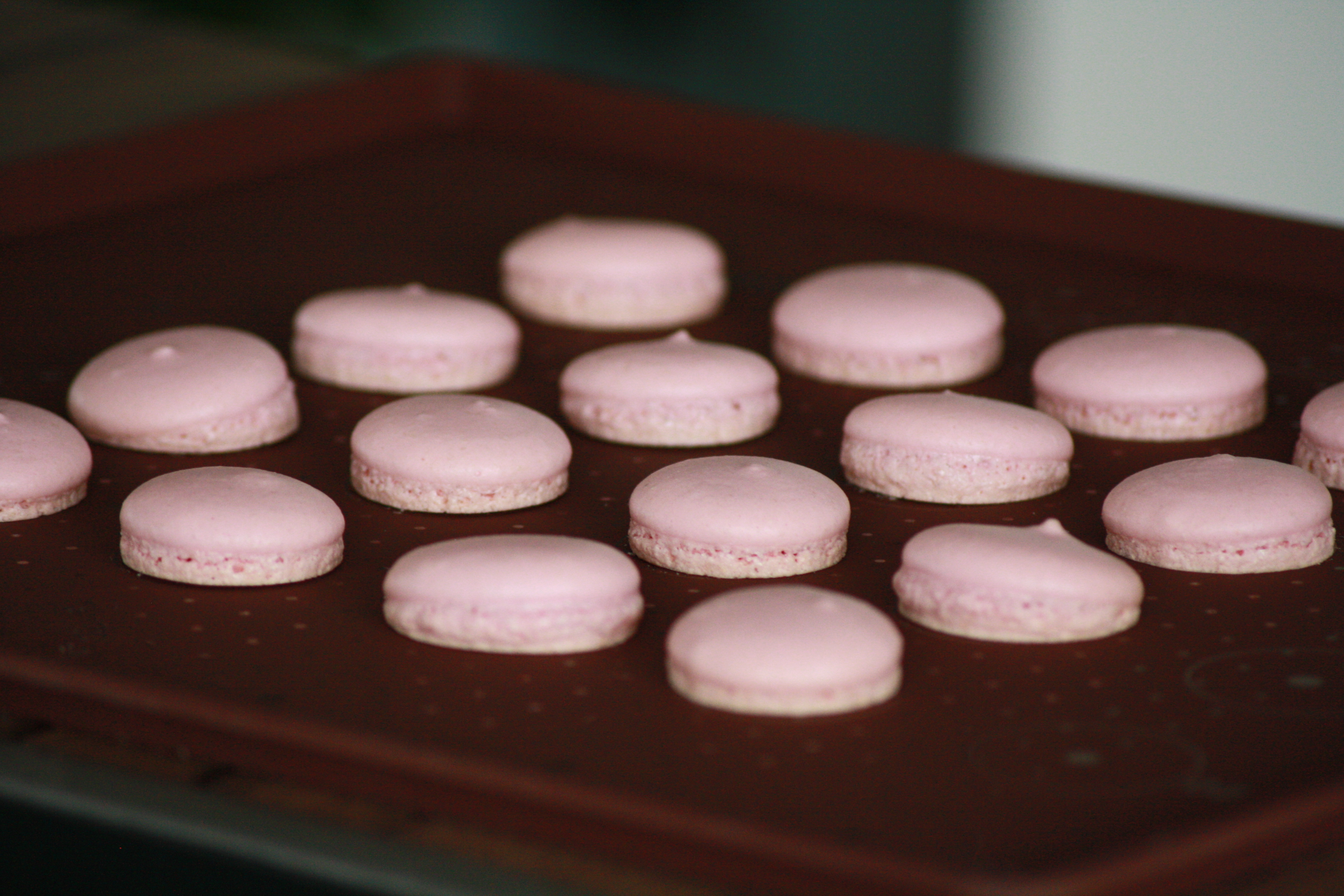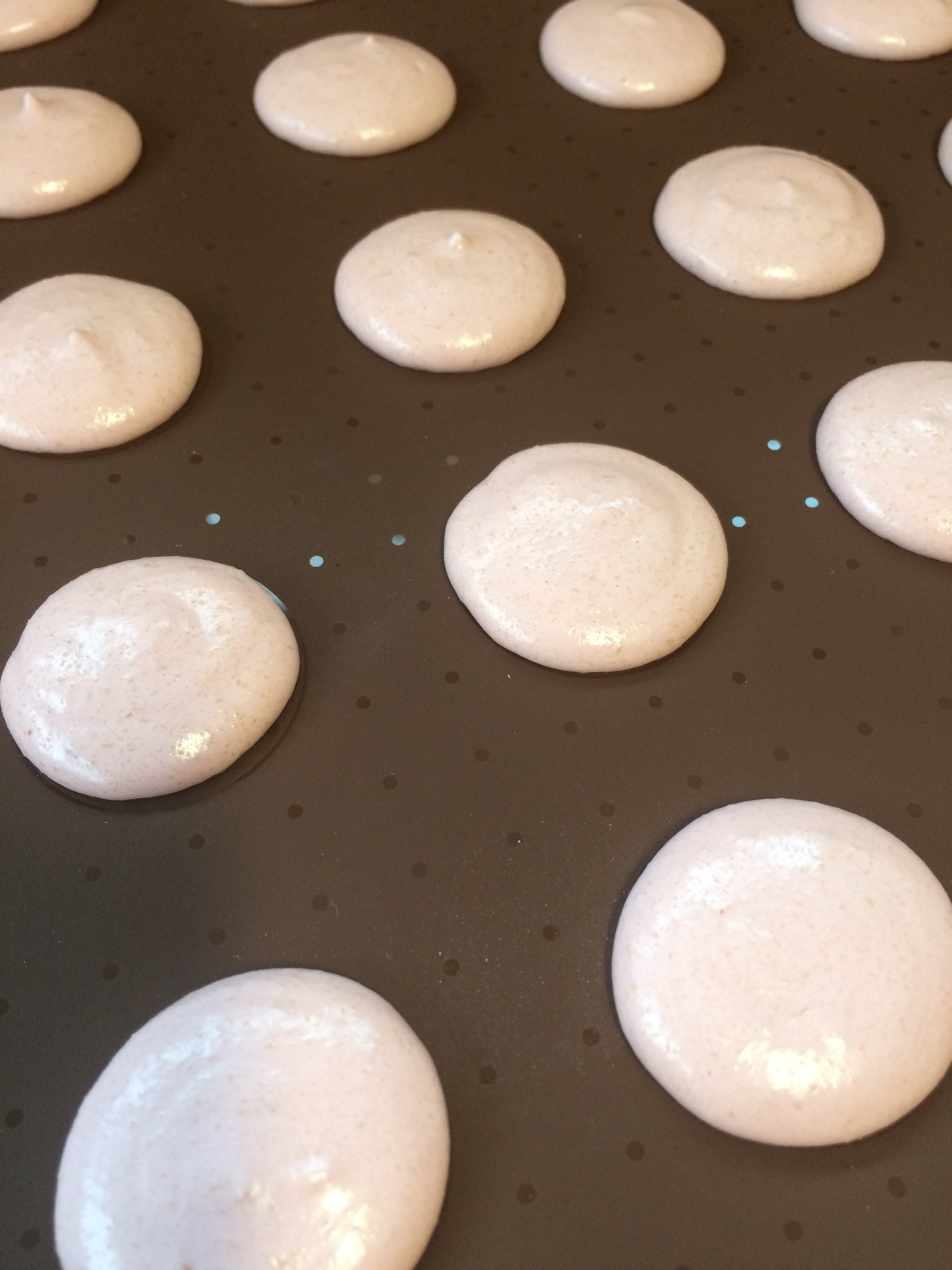 Mein erster Versuch Macarons, das muss ich jetzt echt kurz erzählen, der dauerte ewig! Ich hab nämlich keine Backmatte besessen und darum alle Kreise auf Backpapier gezeichnet. Das dauerte fei echt lang 🙂
