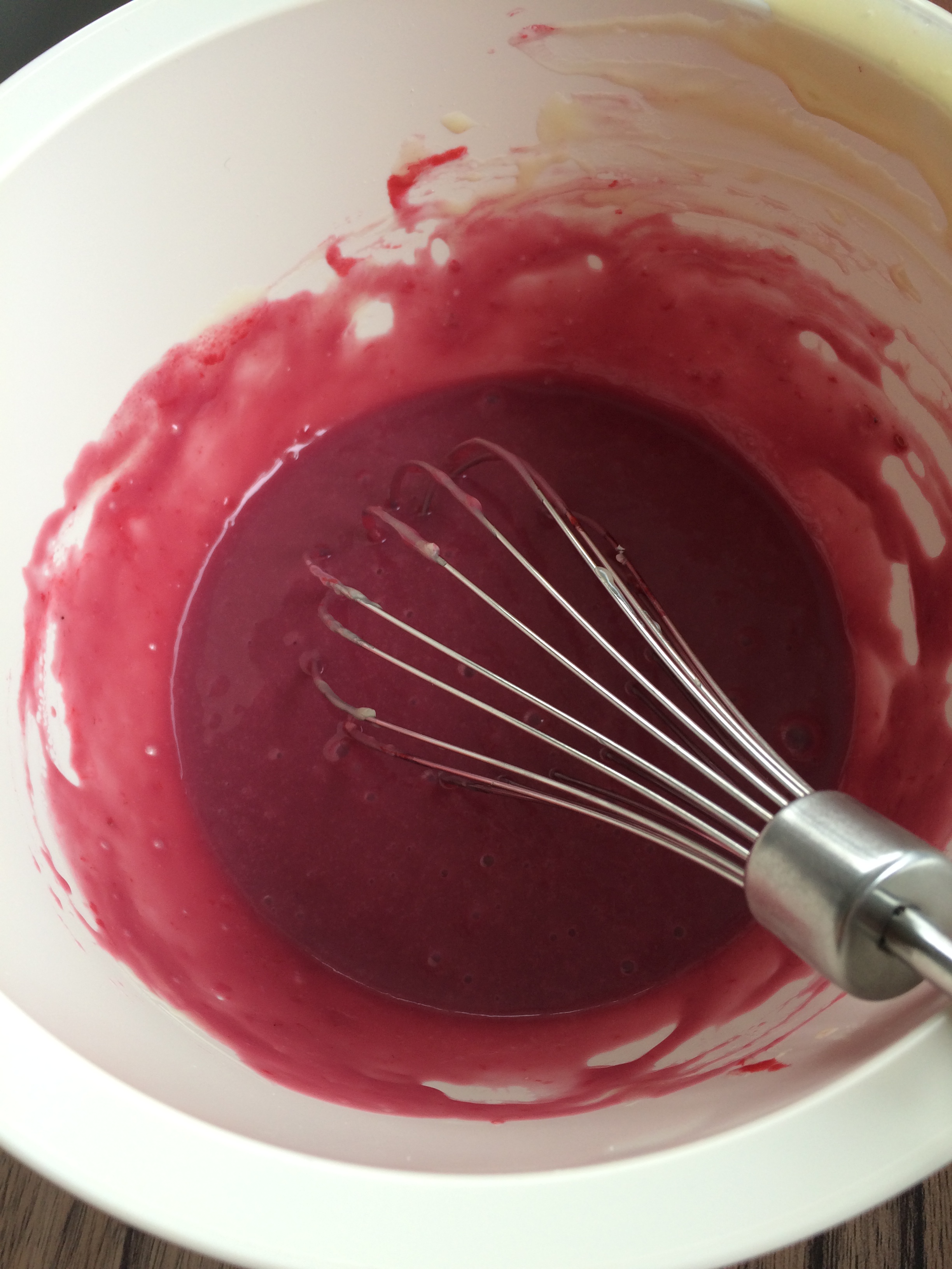 Die Kuvertüre zerkleinert ihr mit nem großen Messer. Die Sahne kocht ihr in einem kleinen Topf auf, nehmt sie vom Herd und gebt dann die Kuvertüre dazu. Sollte die Kuvertüre nicht ganz schmelzen, stellt ihr sie nochmal kurz auf die heiße Platte zurück und rührt weiter. Das Himbeermark mach ich meist auf gefrorenen Himbeeren. Ihr taut die gefrorenen Himbeeren auf – ich stell sie immer in die Mikrowelle. Wenn sie richtig heiß sind, lassen sie sich gut durch ein Sieb streichen. Das Himbeermark kommt nun auch in den Topf. Es sollte nicht zu heiß sein, wenn ihr es in die Sahnemischung gebt.