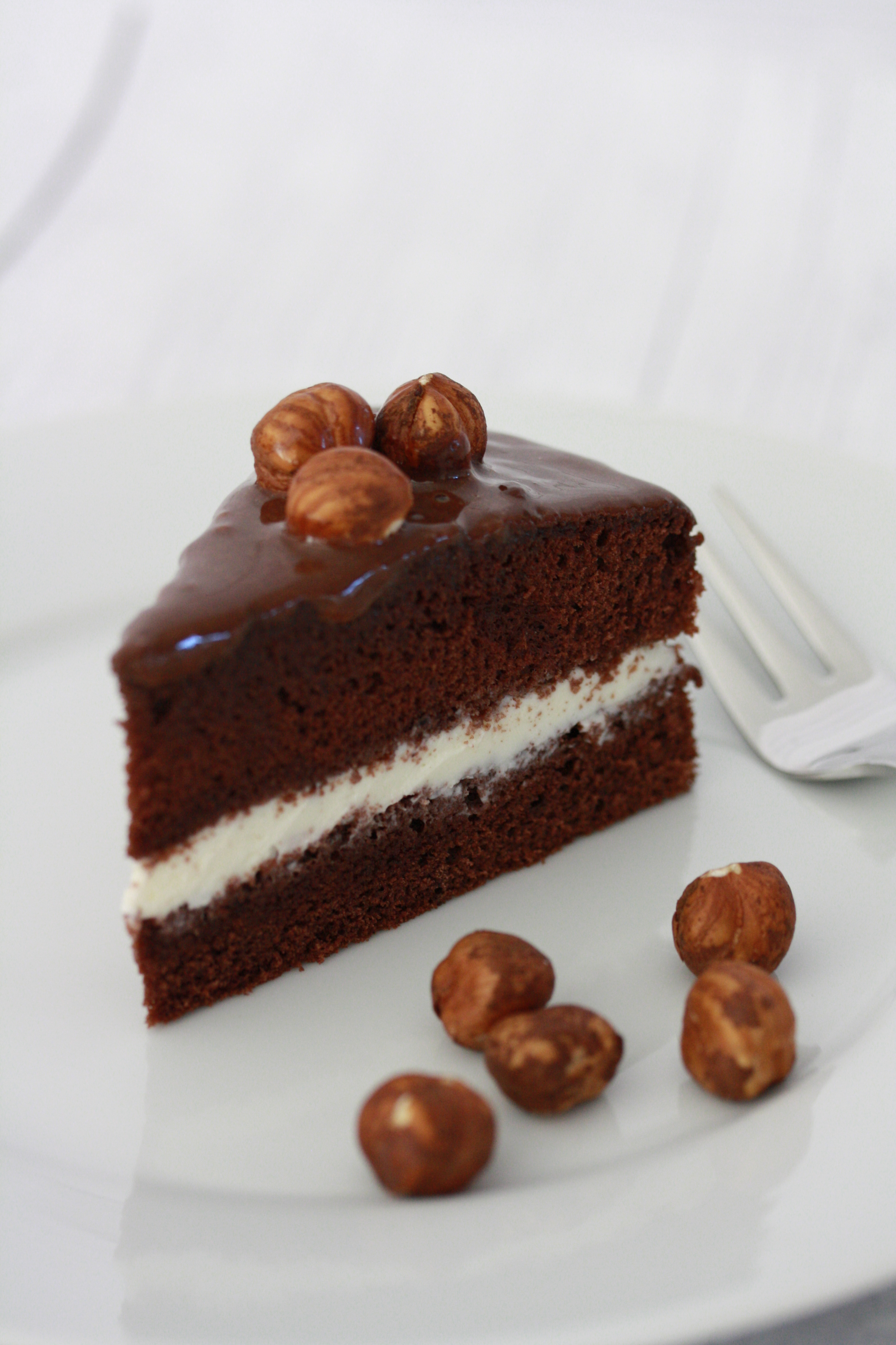 Die Garnierung besteht aus 2 Teilen: zum einen aus der Schokoladenglasur und zum anderen aus Haselnüssen (eigentlich sollen es karamellisierte Haselnüsse sein).
