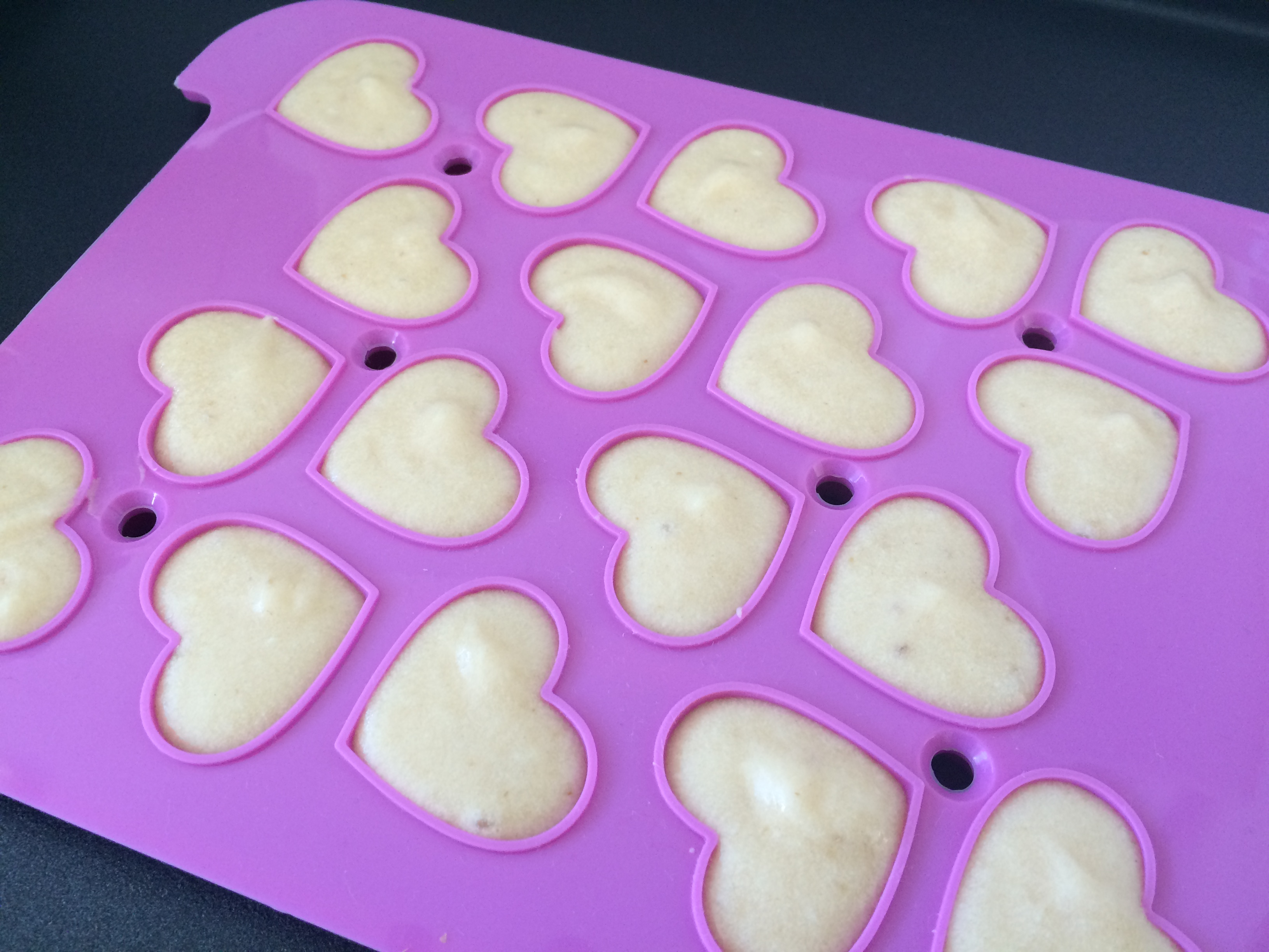 Wenn die Herzen aus dem Ofen kommen, lasst ihr sie kurz stehen und löst dann den oberen Teil der Form ab. Dazu ein Geschirrtuch nehmen, denn die Form ist sehr heiß. Nach weiteren 5 Minuten könnt ihr sie ganz aus der Form lösen und erkalten lassen. Solltet ihr einen kleinen Rand haben durch die zwei Hälften der Form, den kann man in abgekühltem Zustand einfach vorsichtig abbröseln. So hab ich das gemacht.