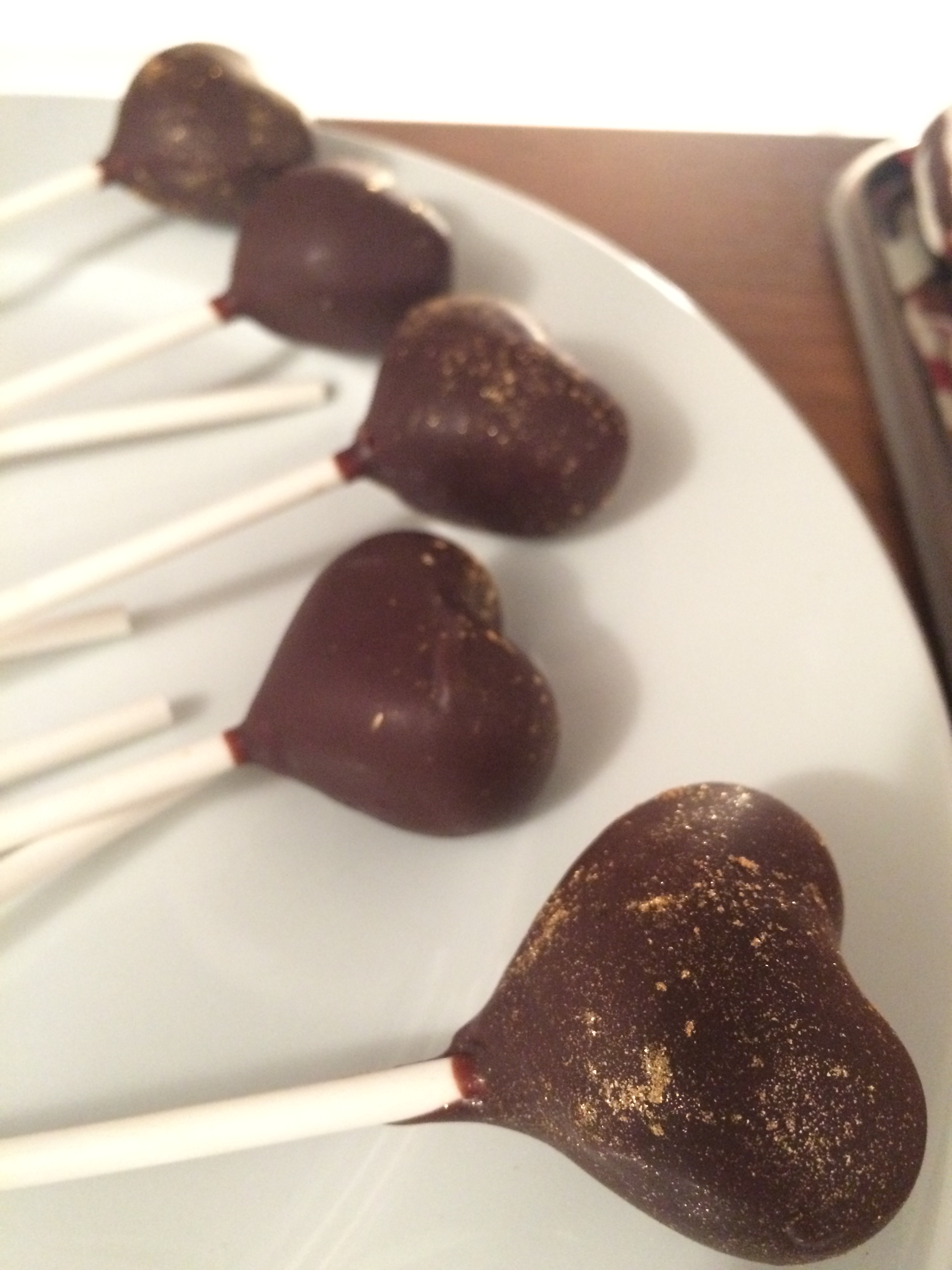 Anschließend die ganzen Herzen in die Kuvertüre tauchen und langsam drehen und am Stiel abklopfen, dass es keine „Nasen“ gibt. Entweder in ein Stück Styropor zum Trocknen stecken oder in einer Schüssel mit Reis gefüllt. Da rutschen sie aber eher mal.