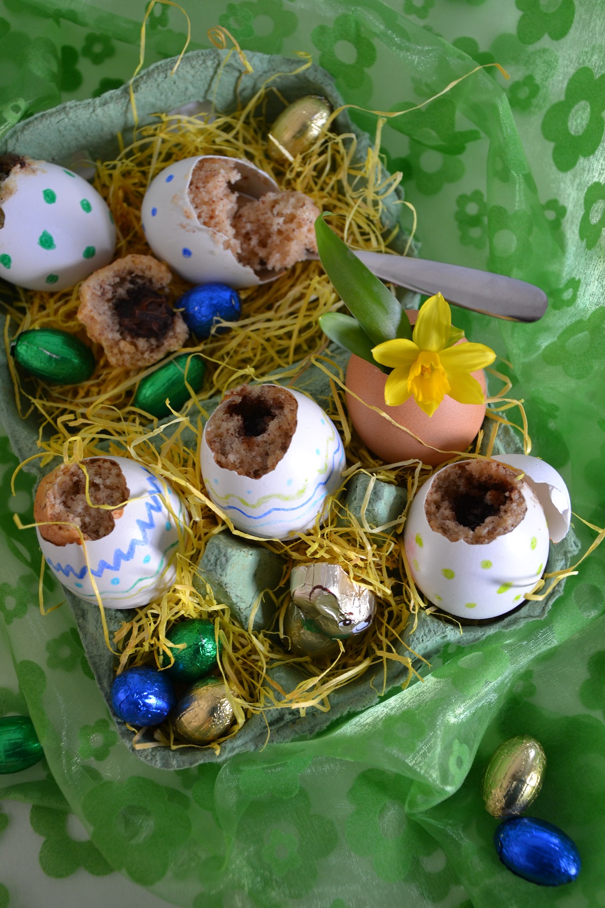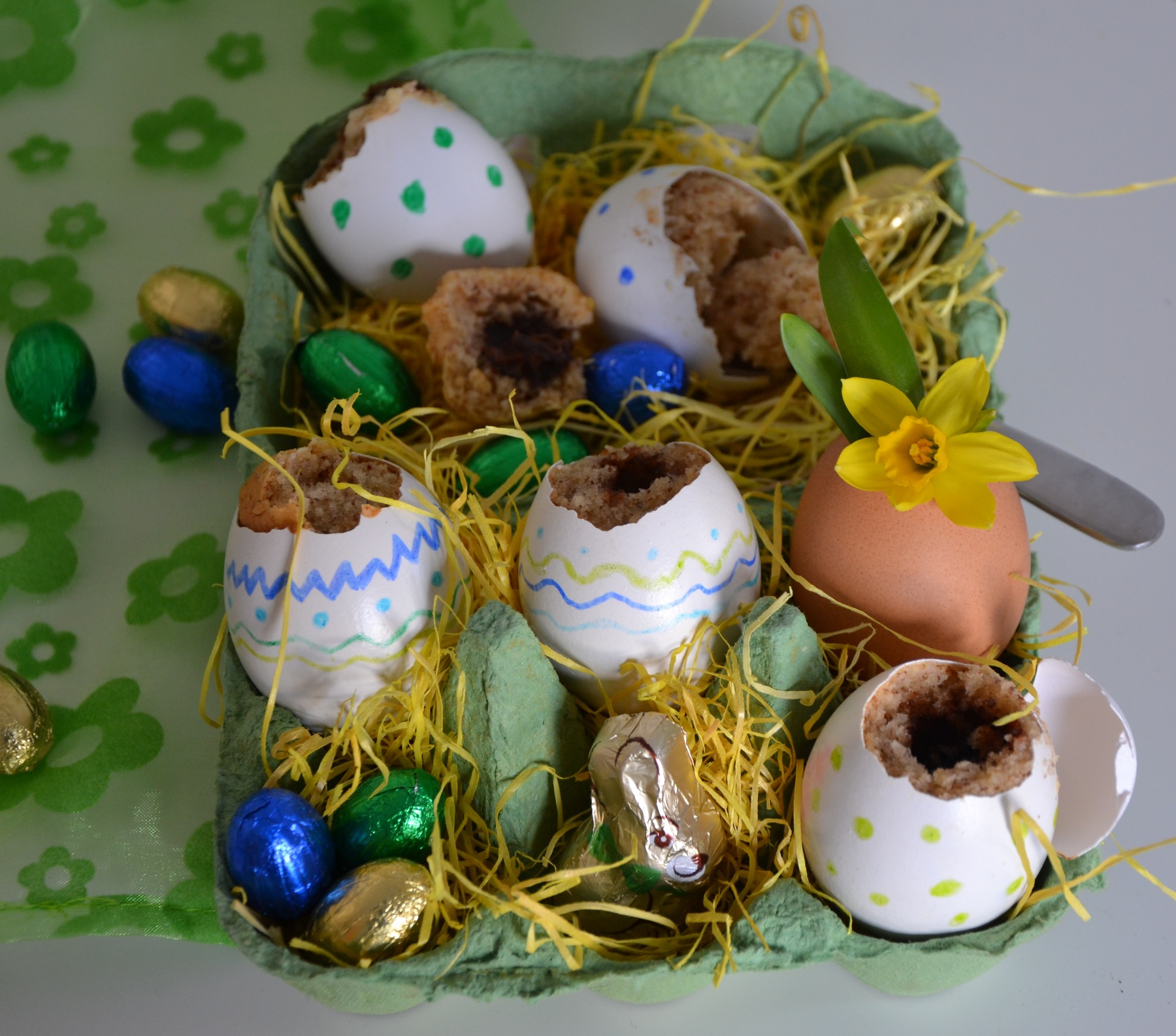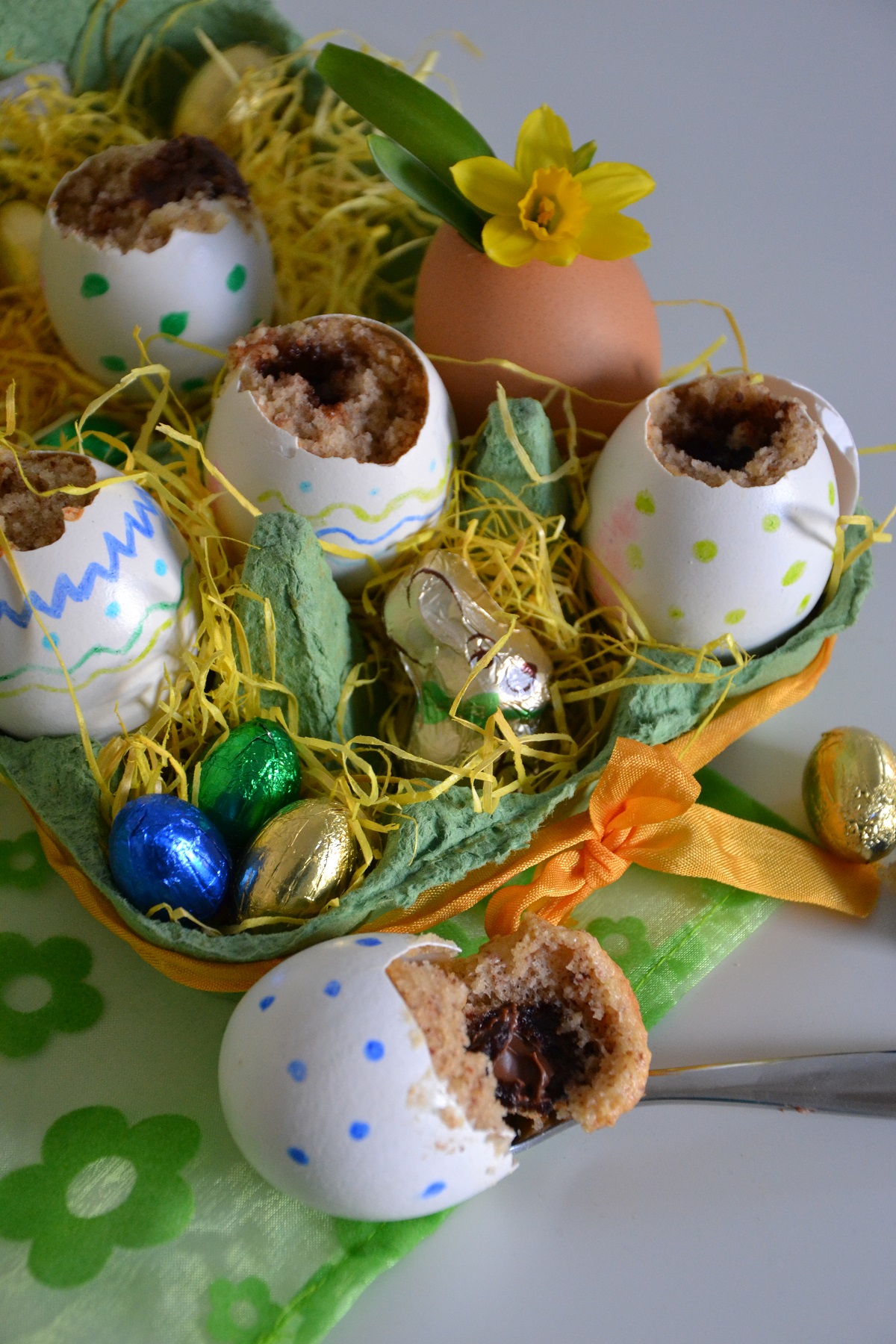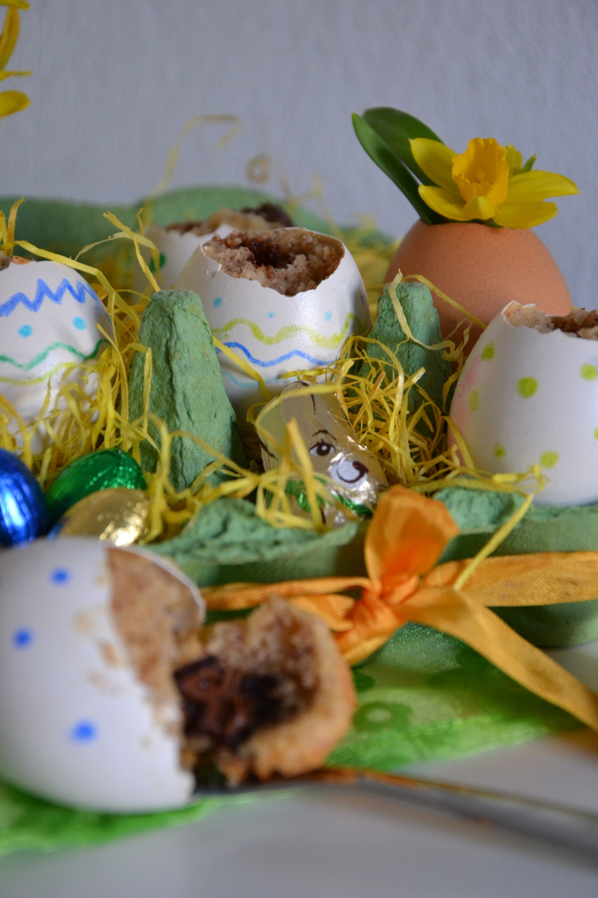 5. Nun aus Alufolie kleine „Nester“ formen, diese in ein Muffinblech legen und in jedes „Nest“ ein Ei mit der Öffnung nach oben setzen. So fallen die Eier beim Teigbefüllen und Backen nicht um.