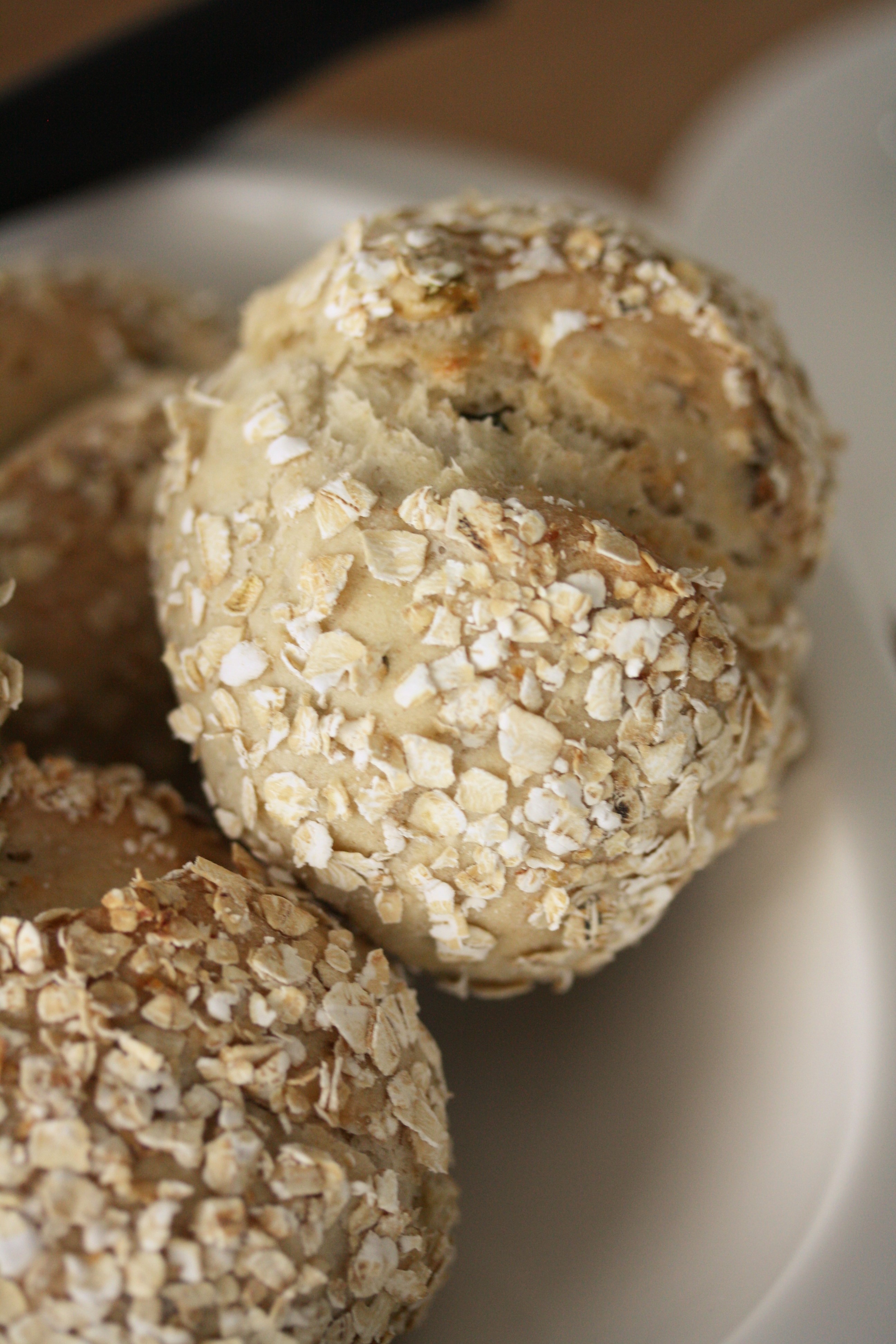 - Die Teiglinge taucht ihr nun erst in das Wasser und dann wälzt ihr sie in den Haferflocken und setzt sie auf ein mit Backfolie ausgelegtes Backblech.