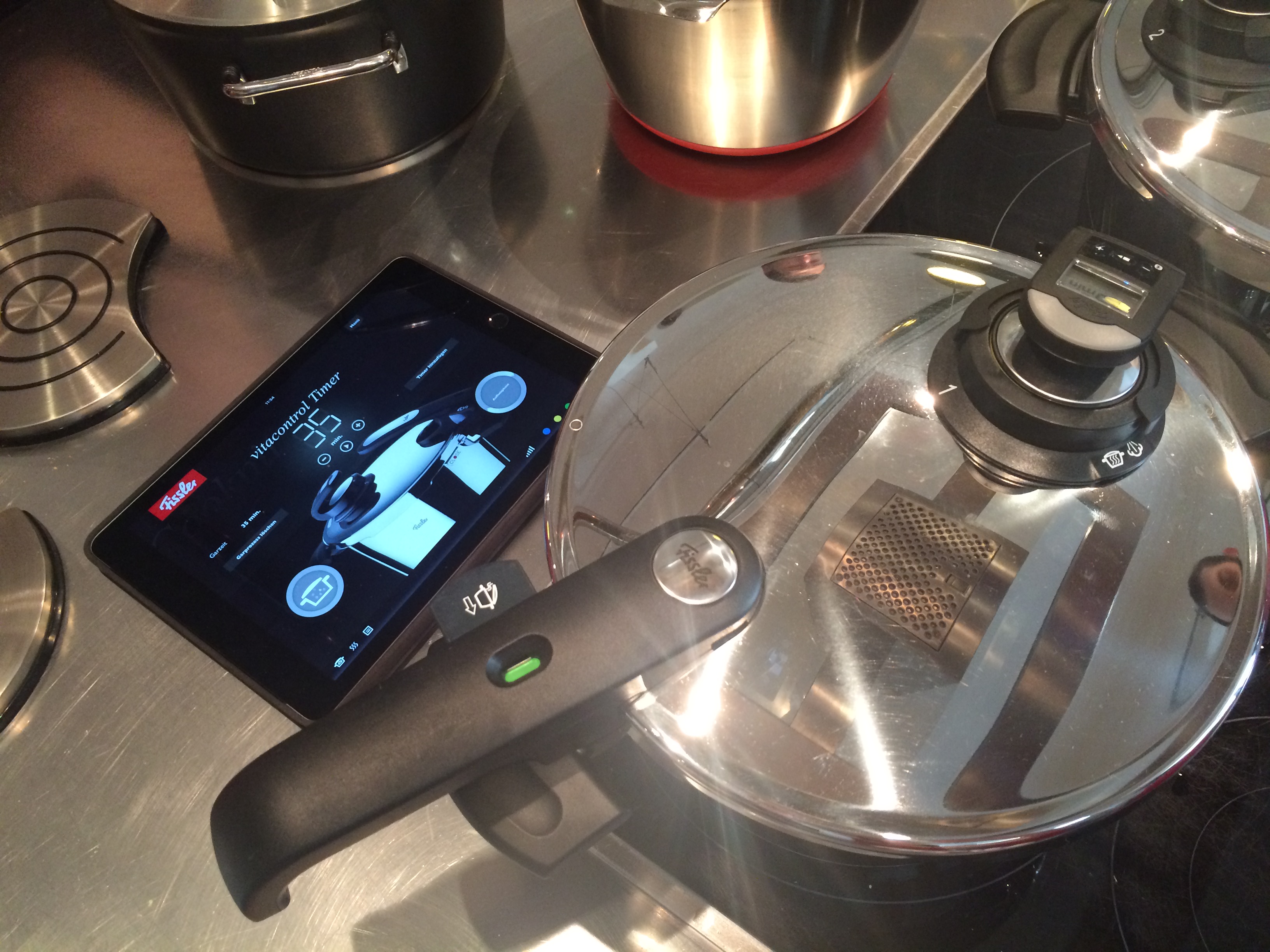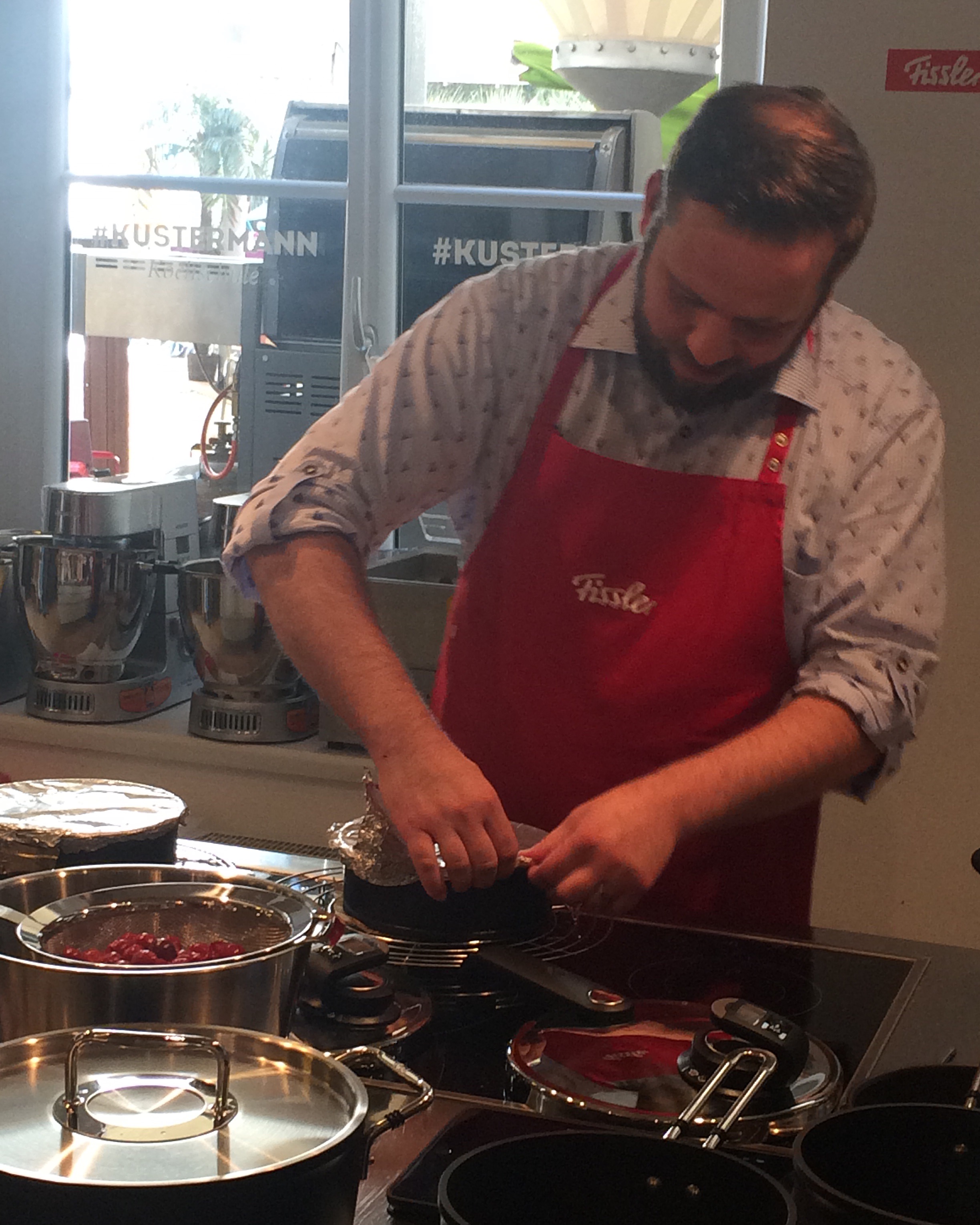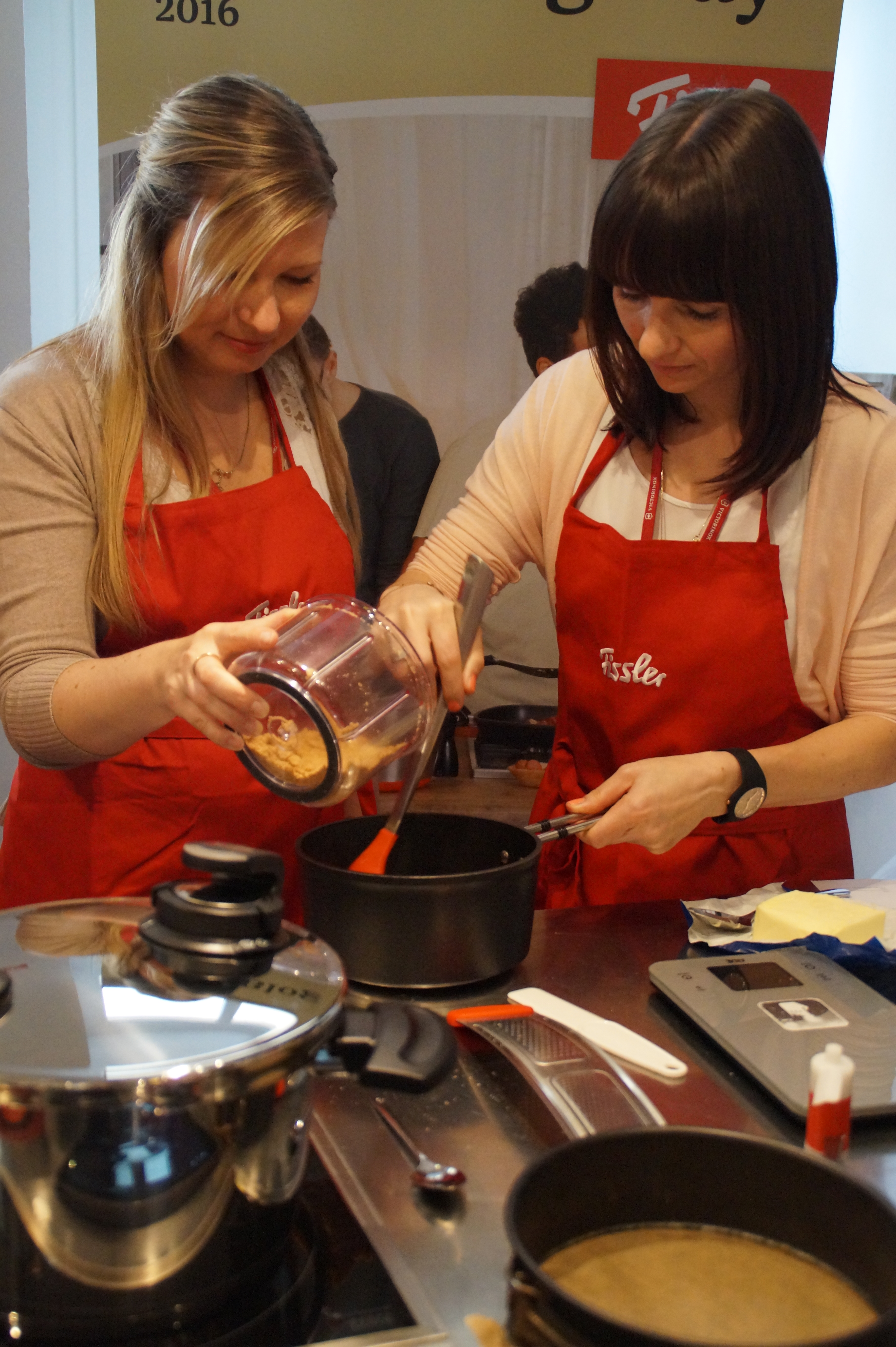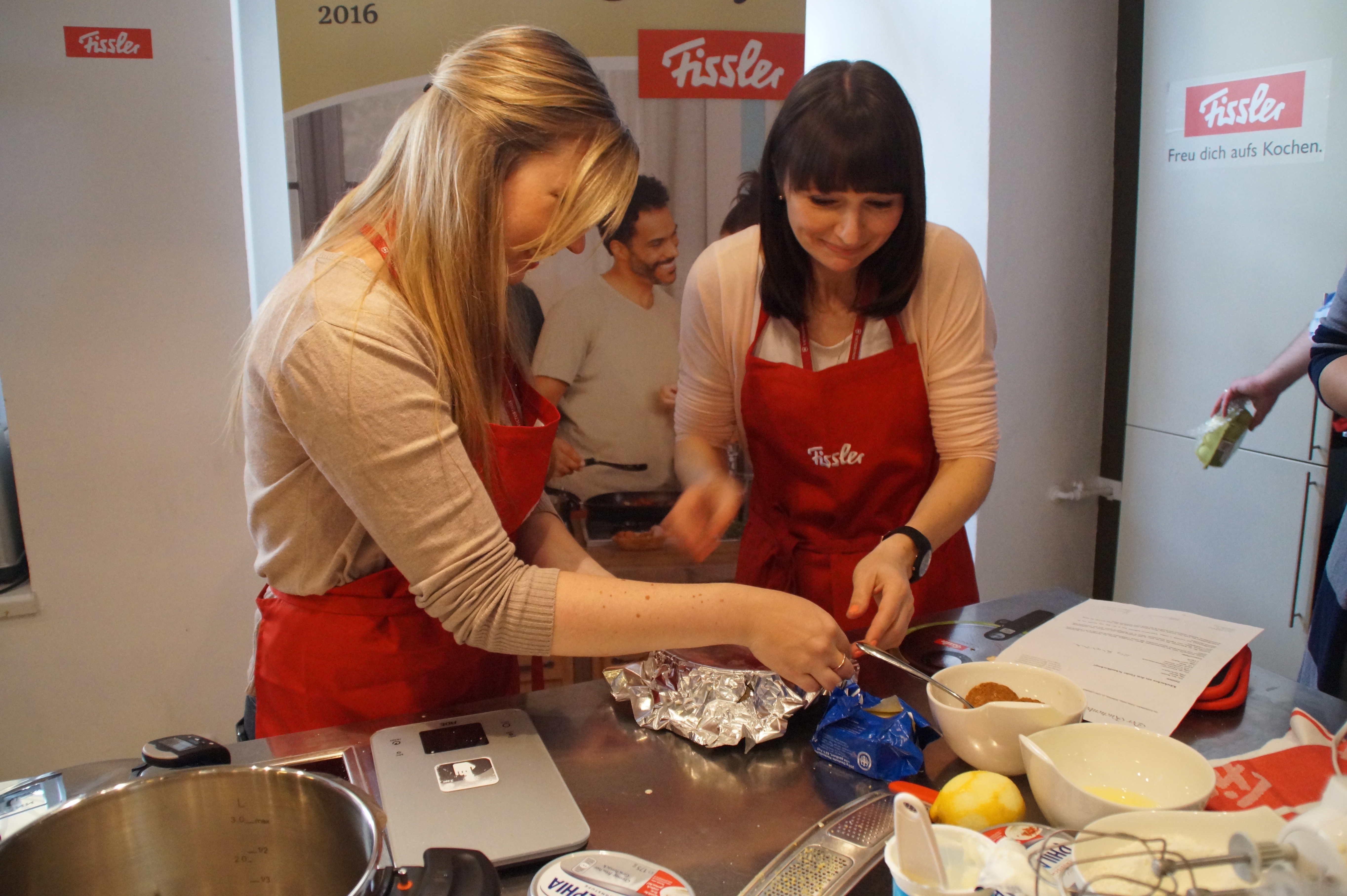 Bei dieser ersten Runde lernte ich die zwei Mädels Mona und Fabienne von rEAT a book aus Stuggi kennen und gemeinsam zogen wir los zu den Workshops in der Innenstadt. Die beiden besuchten einen Workshop von Melitta und ich ging nebenan zum Workshop von Fissler und Tobias Müller, dem Kuchenbäcker. Dort lernte ich gleich noch einen Schlag nette Blogger kennen:u.a. Anna von Naschkatze auf Abwegen, Christina von Nekcab und Julia von Julias Delicious Stories. Im Workshop wurden zwei Cheesecakes im Schnellkochtopf von Fissler gebacken, nach einem Rezept vom Kuchenbäcker. Julia und ich bildeten spontan eines der beiden Backteams und arbeiteten etwas chaotisch, da wir irgendwie nur die Zutatenliste durchgingen und nicht die Anleitung 😉 Es kam trotzdem ein Kuchen zustande. Höhö! Wir durften dann die Cheesecakes mit leckerer Karamellsauce und Sauerkirschen genießen. Herrlich! Ich bin ja kein eingefleischter Fan von Käsekuchen… aber DER war superlecker!!!Und ich werde demächst den Schnellkochtopf meiner Mama „ausleihen“ und mal damit arbeiten!