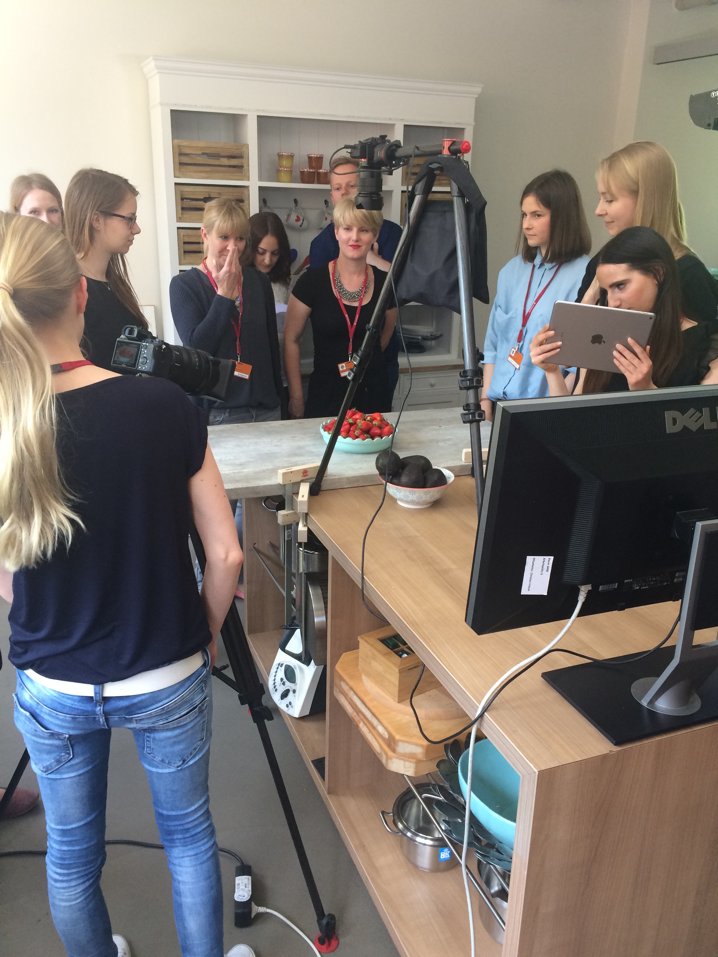 Workshop zwei war schon im Gange als Anna und ich eintrudelten. Dieser war etwas überfüllt, was es eher schwierig machte über die ganze Zeit dabeizubleiben. Im Videoworkshop mit Franziska Schaper von meinkochrezept.de wurde eine Anleitung für ein Avacado-Erdbeereis gedreht. Es war interessant zu beobachten, vor allem, was alles beachtet werden muss für ein gutes Video. Wir bekamen ein Storyboard und viele Tipps. Allerdings waren die 90 Minuten dann doch etwas zäh, da nur 6-8 Teilnehmer aktiv beteiligt waren und ich nicht dazu zählte. Aber für eine Erkenntnis sorgte auch dieser Workshop: Videos werde ich nicht in Erwägung ziehen. Zum einen ist es waaaahnsinnig zeitaufwendig und zum anderen nicht ganz billig. Allein ein spezielles Stativ liegt schon bei knapp 200 Euro. Und da mein Blog ja mein Hobby ist, wird er wohl ohne Videoanleitungen bleiben. Es gibt ja auch genügend tolle Videos 🙂