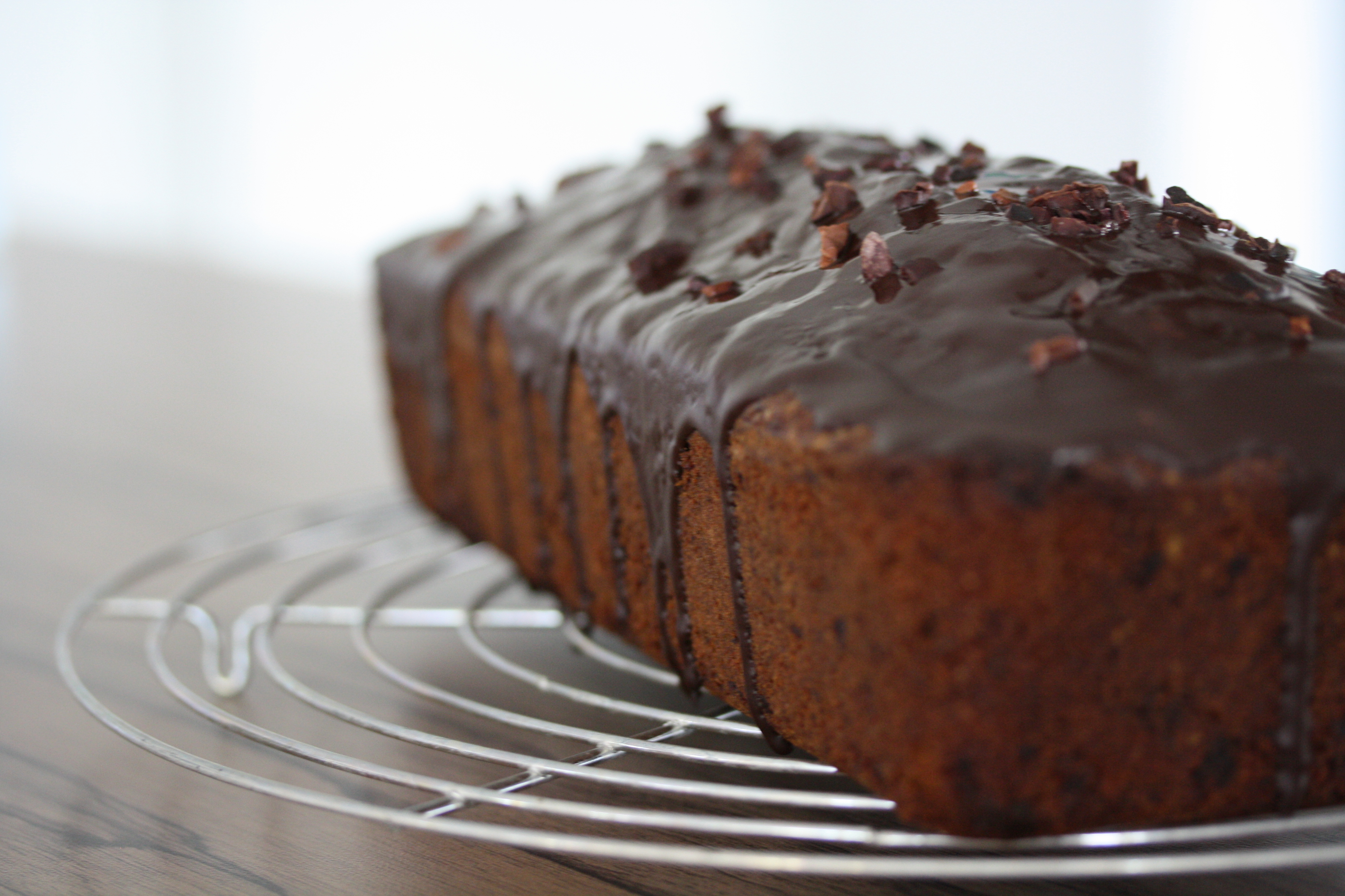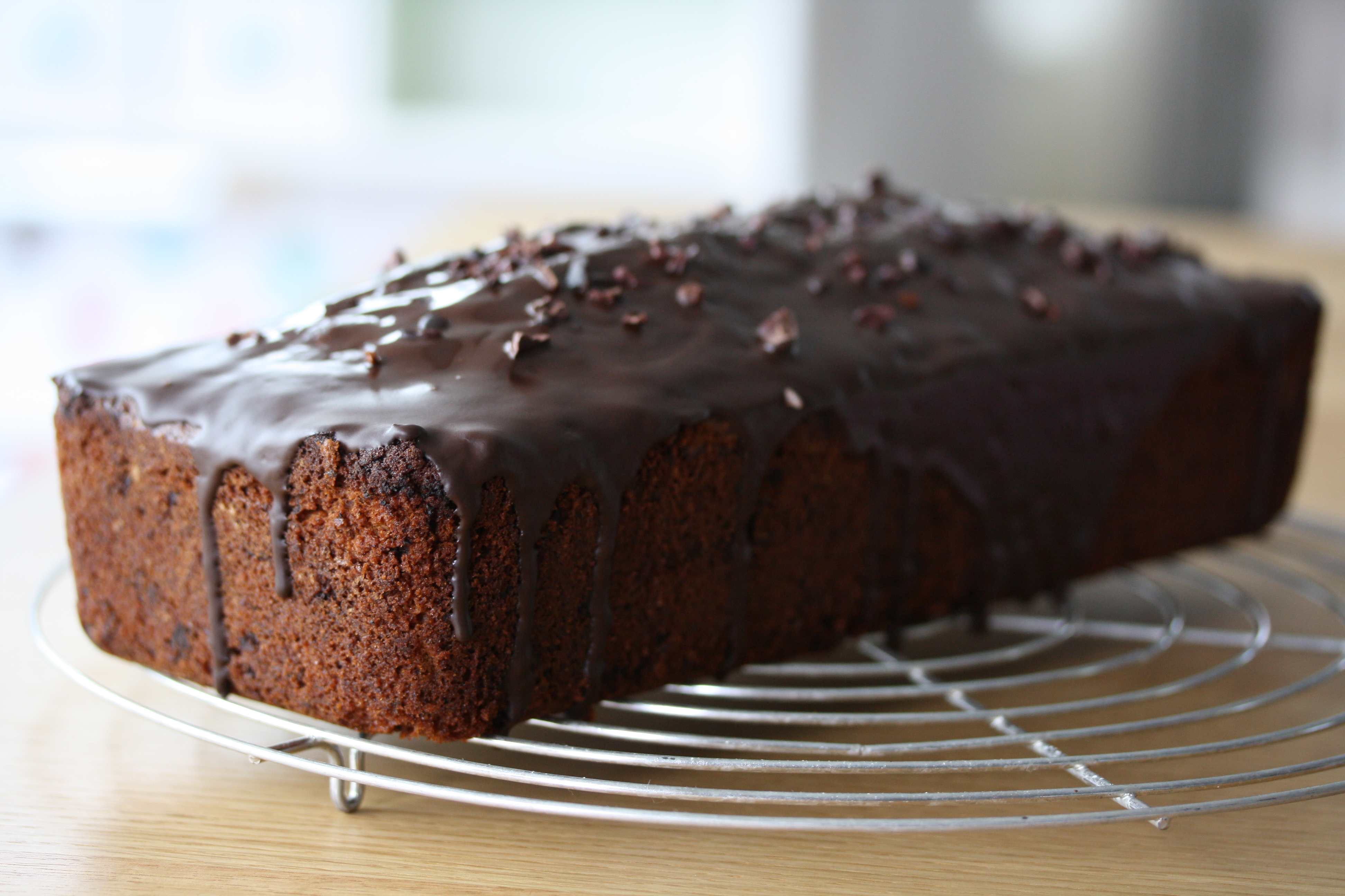 Den Kuchen kurz abkühlen lassen und aus der Form lösen. Ich überziehe ihn immer mit einer Schokoladenglasur, dadruch hält er auch länger feucht. Wem das zu viel ist, der nimmt Puderzucker…wobei zu viel Schokolade geht ja eigentlich nicht 🙂