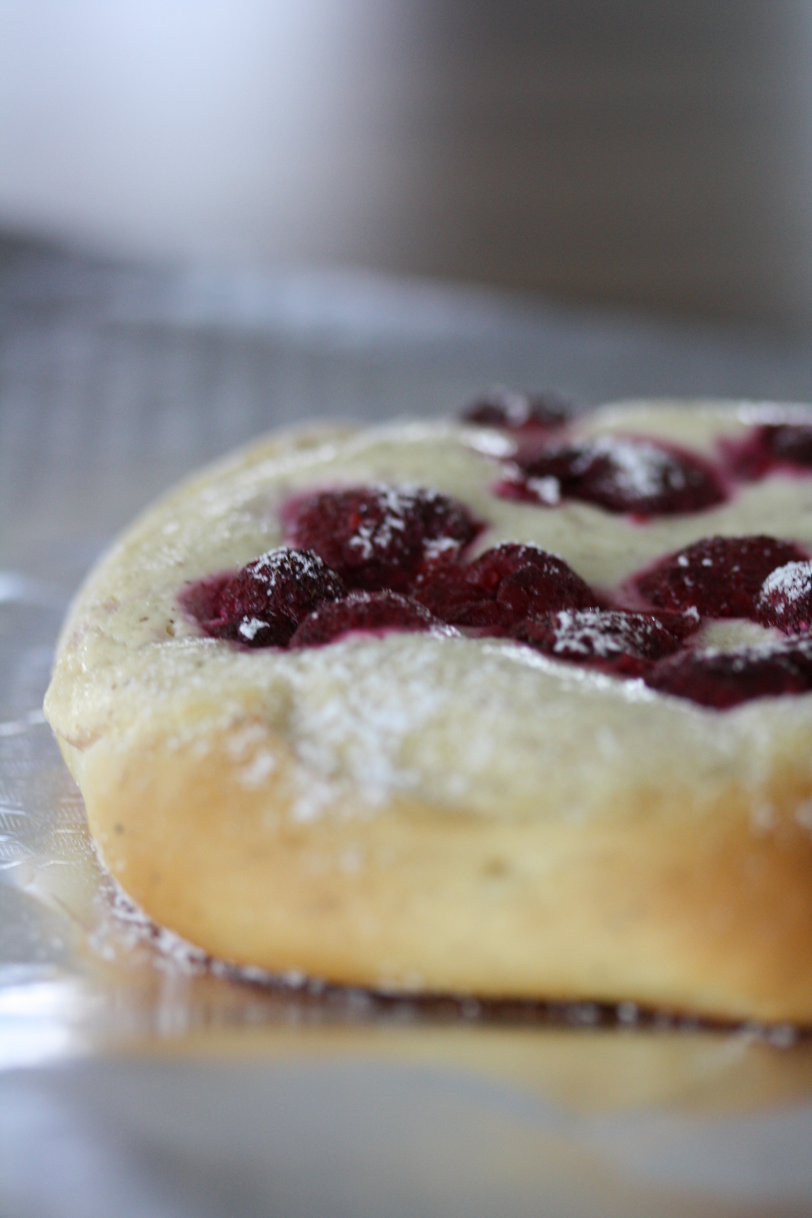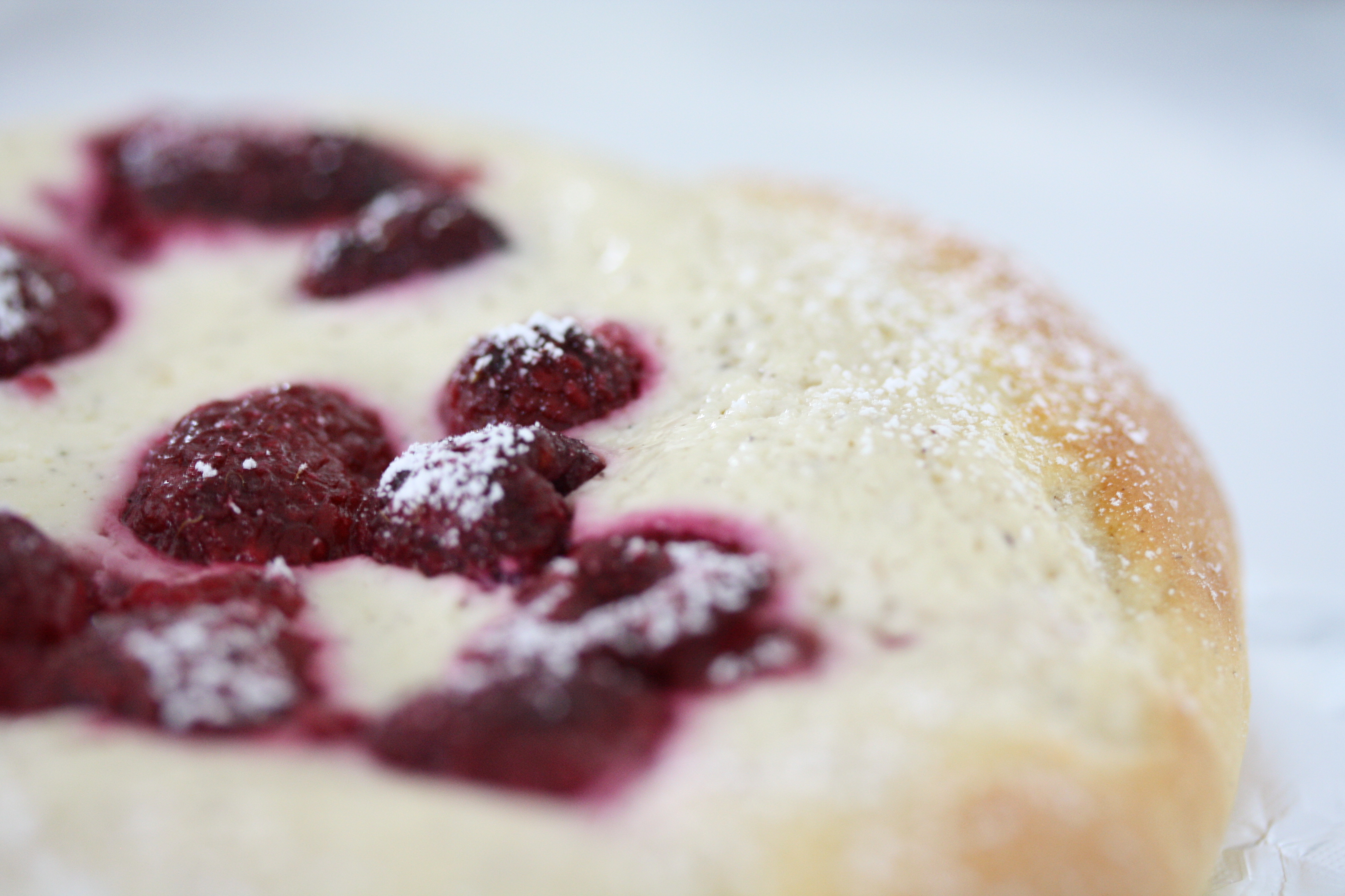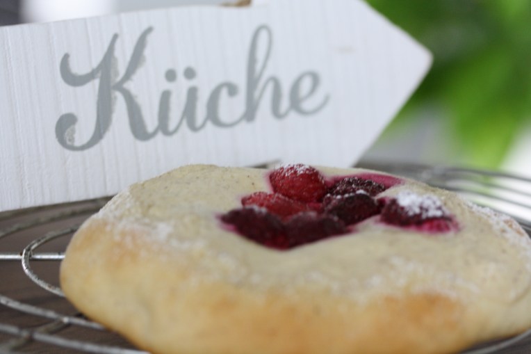 Das Gute daran, dann hab ich schon mehr Zeit zum Backen, denn aufm Spielplatz ist nur Matsch und Dreck 🙂 Und gestern hatte ich so Lust auf was Süßes zum Kaffee, aber ich wollte ein süßes Stückle und keinen richtigen Kuchen. Also saß ich da und überlegte und grübelte… normale Schneckennudeln, Hefezopf, Nutellakringel, … und dann schaute ich in unseren Kühlschrank und entdeckte den Quark. Quark auf Hefeteig, warum denn nicht. Leider fand ich keine Aprikosen oder Mandarinen mehr im Vorratskeller, aber Himbeeren im Gefrierschrank. Und dann gings auch direkt los. Hefeteig machen, Quarkmasse abschmecken, Himbeeren holen… Und das kam dabei raus: