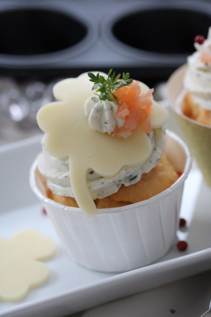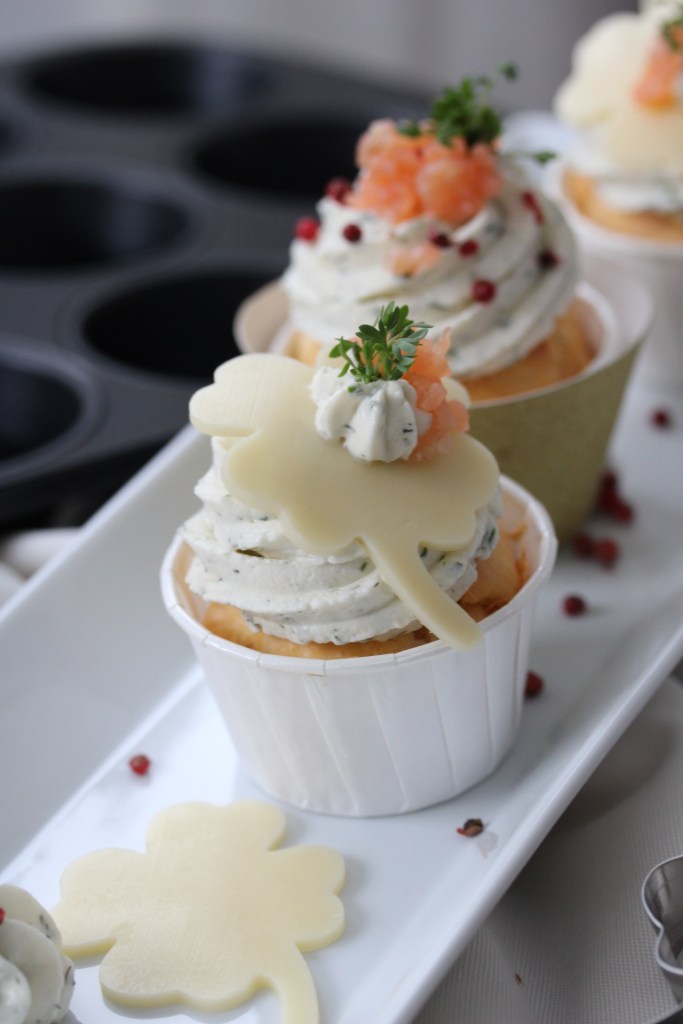 - Topping auf die gefüllten Muffins auftragen und mit den Kleeblättern garnieren. Auf die Kleeblätter einen weiteren Klecks Topping und ein klein wenig Räucherlachs auftragen und mit Kresse oder Dill und roten Pfefferbeeren verzieren.
