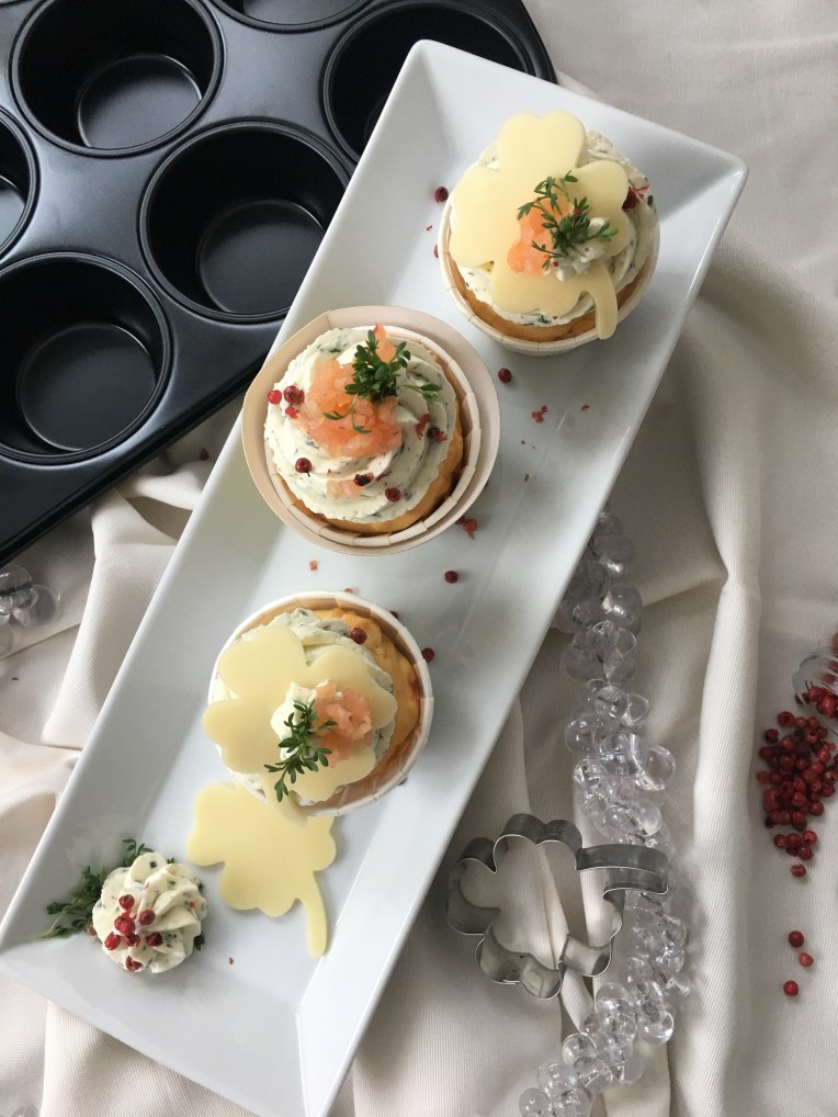 Wir feiern jedes Jahr mit Freunden und mittlerweile einigen Kindern bei einer Familie zu Hause und kochen einen Teil selbst und bestellen den Hauptgang in einem Restaurant. Es soll ja entspannt und lecker sein. In diesem Jahr steht bei uns aber ein besonderes Silvester an, da mein Papa an diesem Tag seinen 70. Geburtstag feiert und wir diesen mit der ganzen Familie feiern wollen. Drum hab ich mir auch ein Rezept überlegt, das man gut vorbereiten und zu einer Feier mitnehmen kann: Herzhafte Cupcakes mit Räucherlachs und einem Topping aus Kräutern und Frischkäse. Und als kleines Silvester-Highlight ein Glückskleeblatt aus Käse ❤