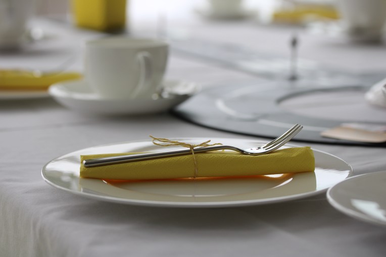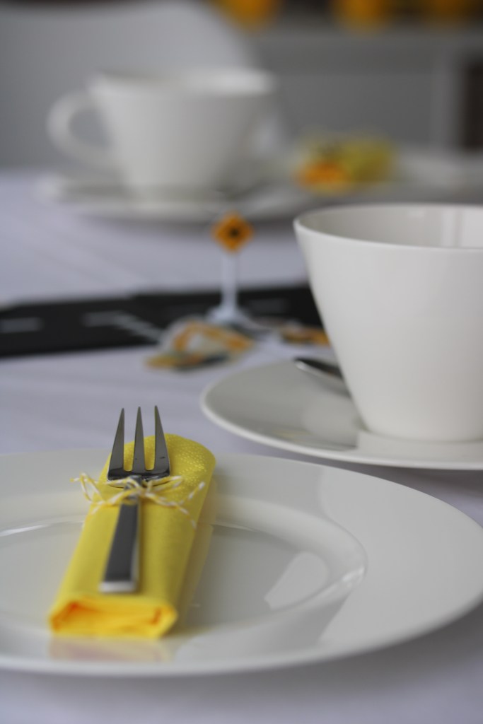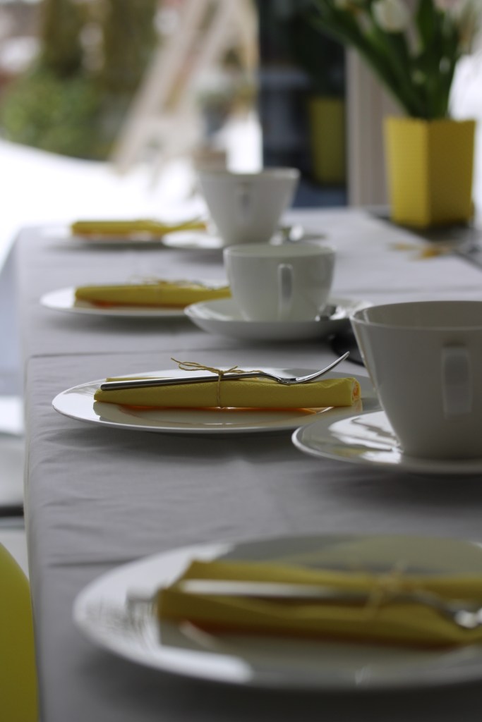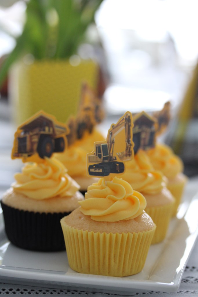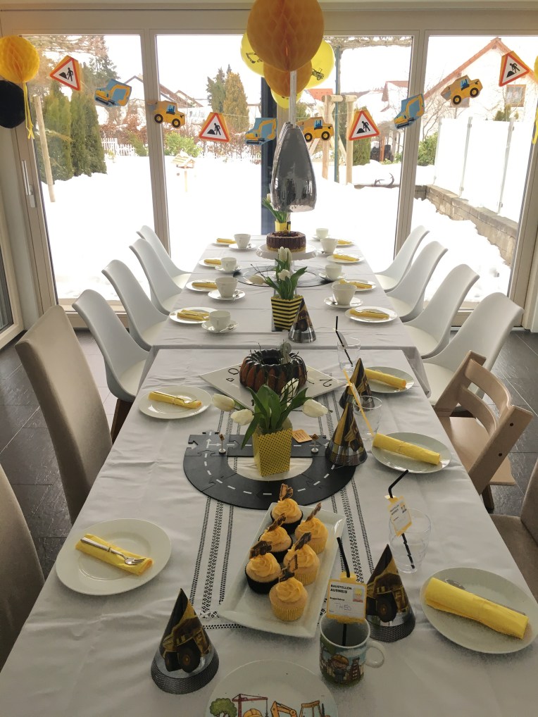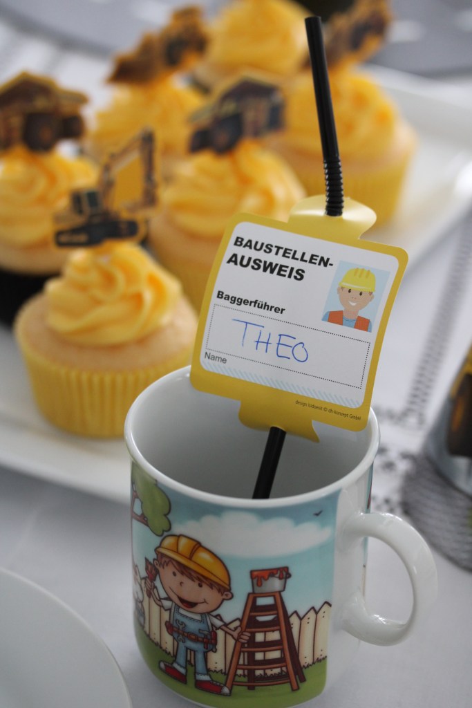 Der Tisch wurde mittags mit leuchtend gelben Servietten und Bakers Twine dekoriert. Die Kinder hatten die tollen Strohhalme mit Namensschild in ihren Gläser. Und wer mal mehrere Kinder zu Besuch hatte und die Gläserverwechslung auch satt, der wird auch begeistert sein von den Strohhalmen. Und die Riesenkonfetti in Bagger- und Baustellenform gefielen den Kids auch super.
