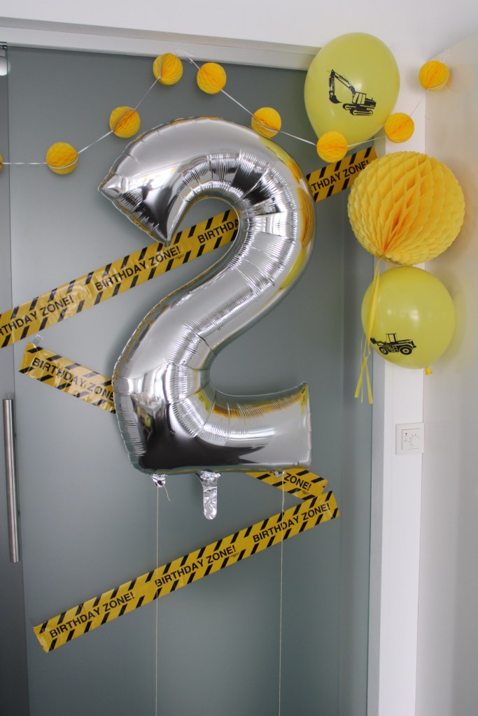 Die schönen Wabenbälle und Ketten in Gelb, Schwarz und Weiß machen für mich immer den Partylook zum Partylook. Ich liebe diese Wabenbälle wie auch die Fächer oder Pompoms! Luftballons dürfen eh auf keiner Party fehlen und wenn dann noch ein Bagger drauf ist, was will man mehr! Außerdem gibts keine Party ohne Partyhut, und selbst die gibt es passend zum Motto.