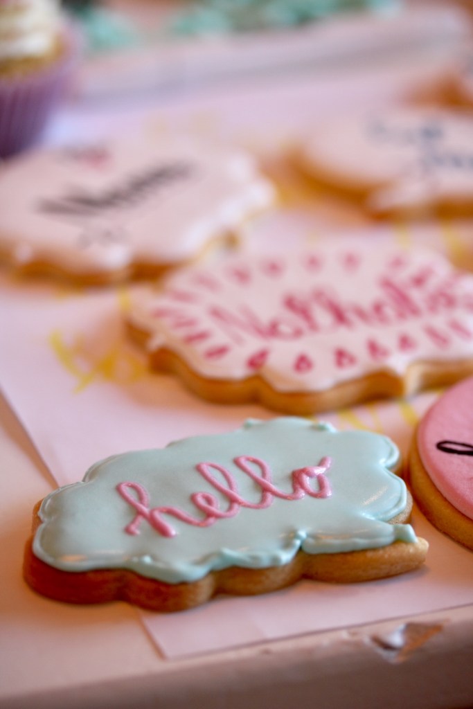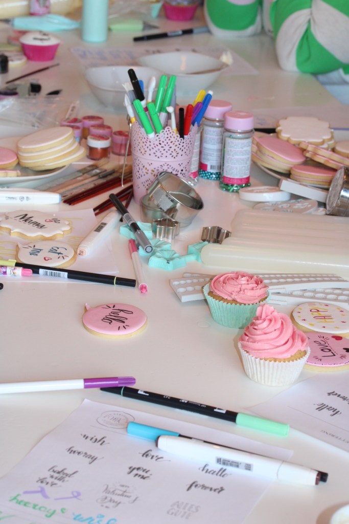 Danach übten wir uns im Cakelettering. Die Meisten erstmal auf dem Papier und die Mutigen direkt auf den vorbereiteten Keksen. Es wurde gemalt, geschrieben und dabei immer gelacht und geredet – die Stimmung im Kurs war wirklich entpannt, lustig und angenehm.