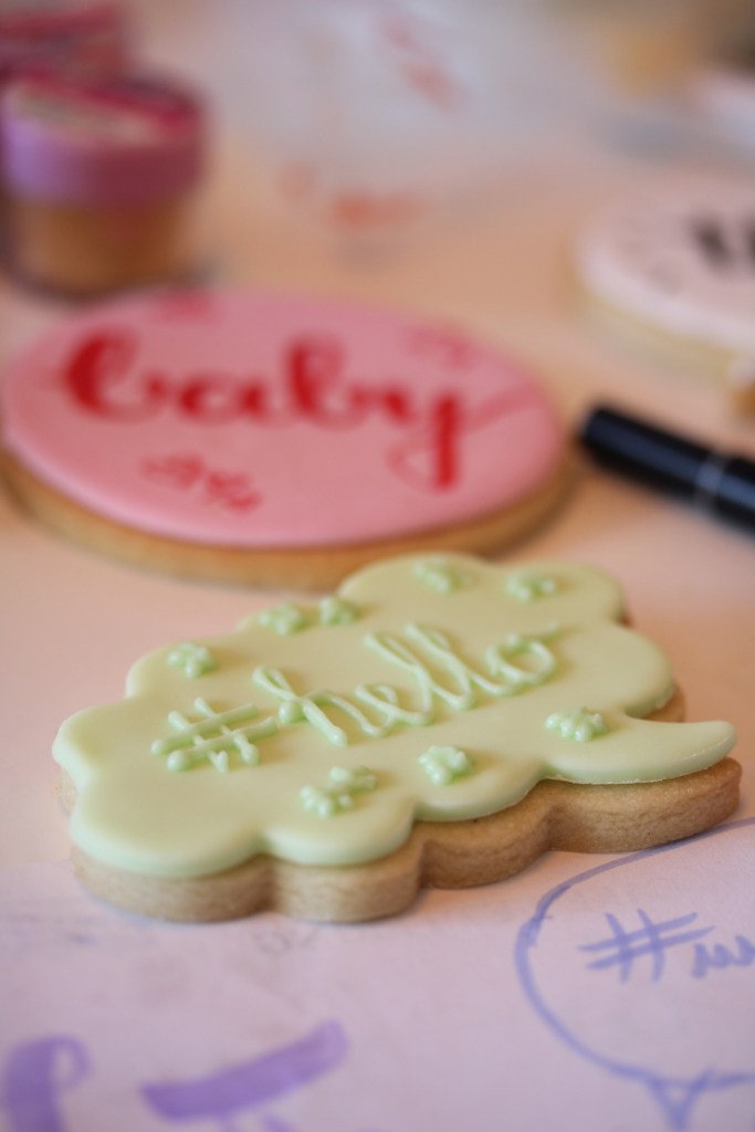 In der zweiten Hälfte des Kurses konzentrierten wir uns auf das Cakelettering. Bedeutet: Wir schauten erstmal dem Profi zu, wie sie auf Fondant und Royal Icing letterte. Egal ob mit Lebenmittelstiften, der Spritztülle oder mit Pinsel und Pulverfarbe – zack zack entstanden bei Stephanie kleine Kunstwerke und die „Ohhhh“s und „Aaaaahhhh“s hörten kaum mehr auf.