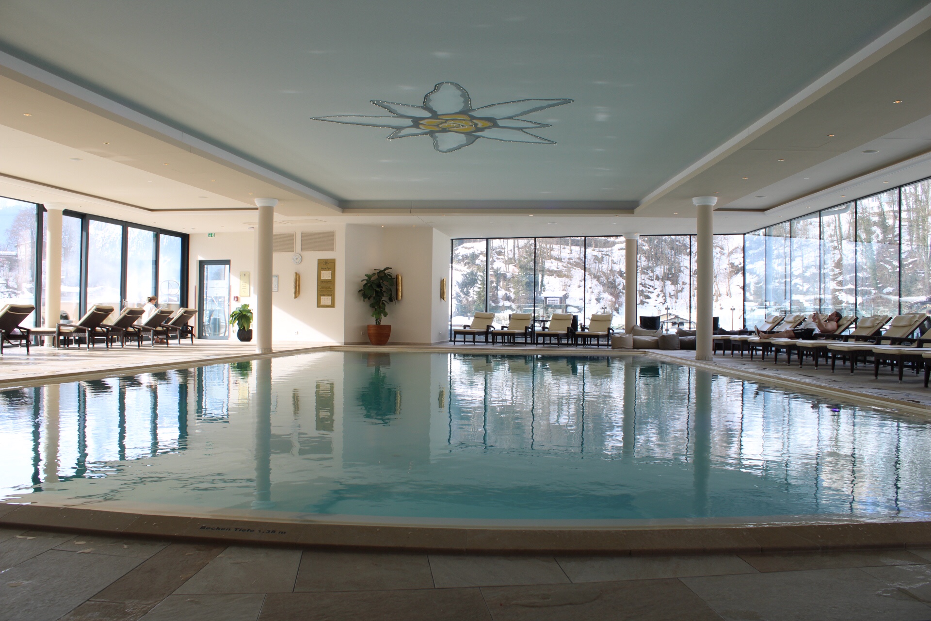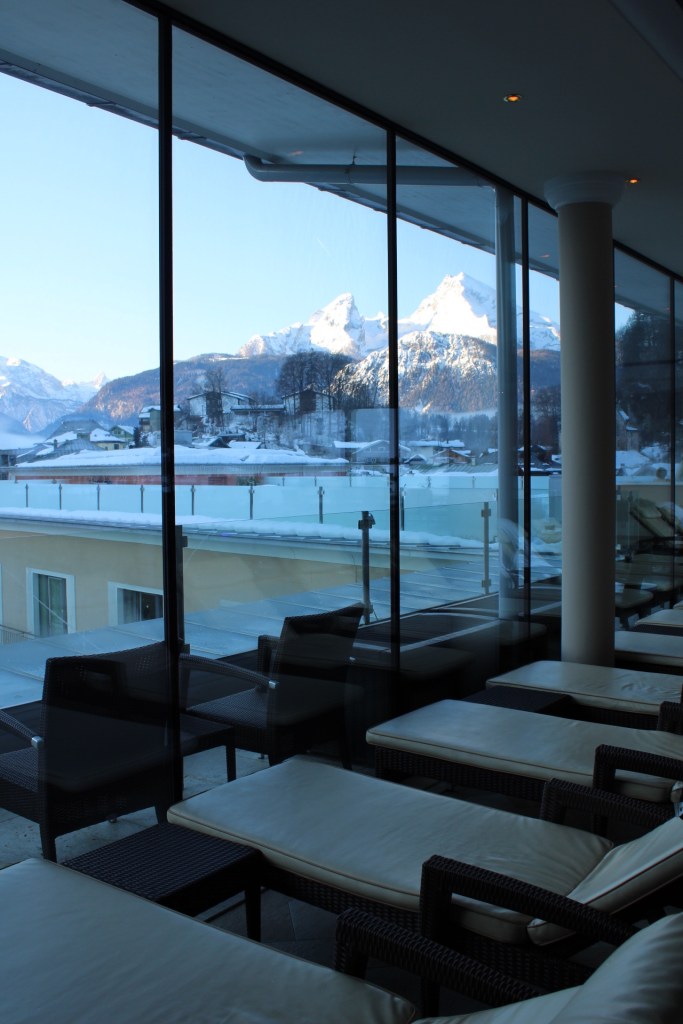 Das Schwimmbad ist abends immer wunderschön beleuchtet in wechslenden Farben und ist herrlich warm. Das absolute Highlight dort oben ist aber der Whirlpool auf der Dachterrasse, wo man im Sommer auch im Liegestuhl verweilen kann. Im Winter dagegen dampft der warme Whirlpool herrlich und der Ausblick ist eine Wucht. Ich glaube, ich find ihn im Winter sogar noch toller als im Sommer. Die schneebedeckte Terrasse, der Blick über die Stadt zum Watzmann und zu den umliegenden weißen Bergen. Dazu das sprudelnde Wasser und die wohlige Wärme. Traumhaft!