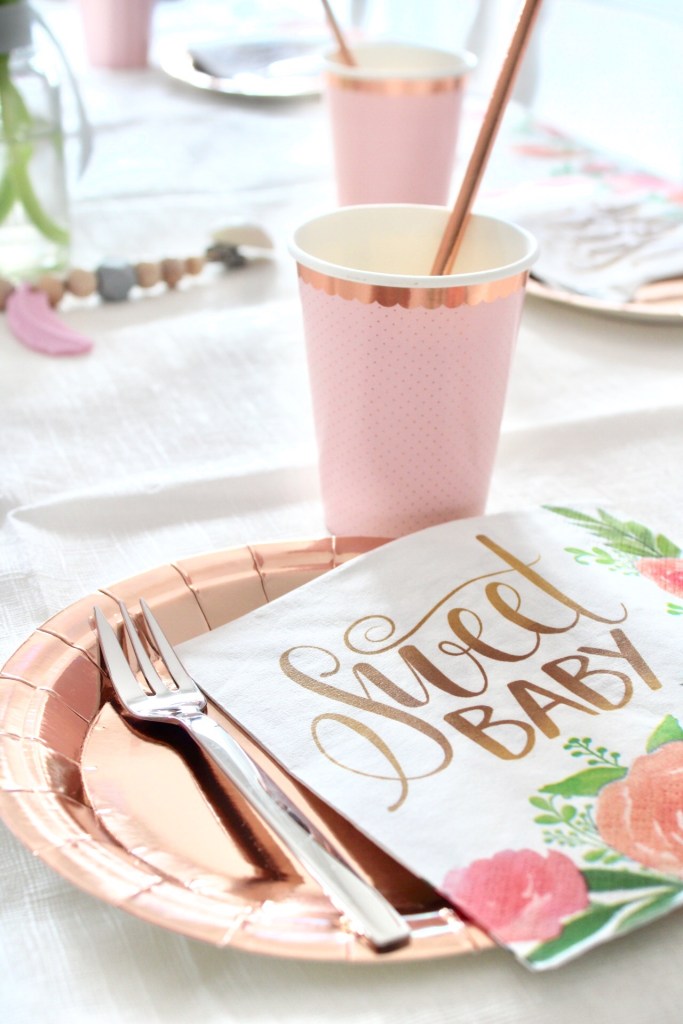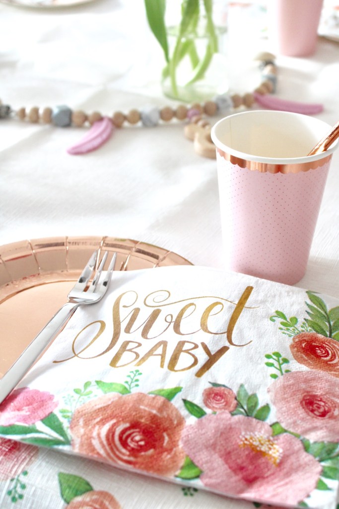 Auch auf dem Tisch bauten wir eines der Geschenke für die werdende Mama ein. Ein Kinderwagenkette wie sie schöner nicht sein könnte! Mit einzelnen Marmor-Hexagon-Perlen, rosa Federn und einem kleinen Holzanhänger – die Ketten und ganz vieles mehr bekommt ihr bei meiner Freundin Beryll, die einen Onlineshop und auch einen IG-Account besitzt! An der Stelle sag ich danke für deine Unterstützung meine Liebe!! (Werbung, unbeauftragt, weil sie meine Freundin ist!)