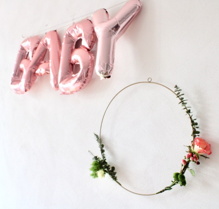 Als Schriftzug an der Wand hatten wir eine kleine Ballongirlande mit dem Schriftzug „Baby“ und noch einen „Floral Hoop“ – schlicht und schön!