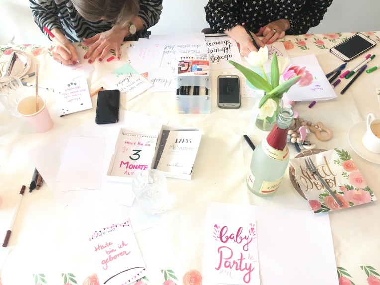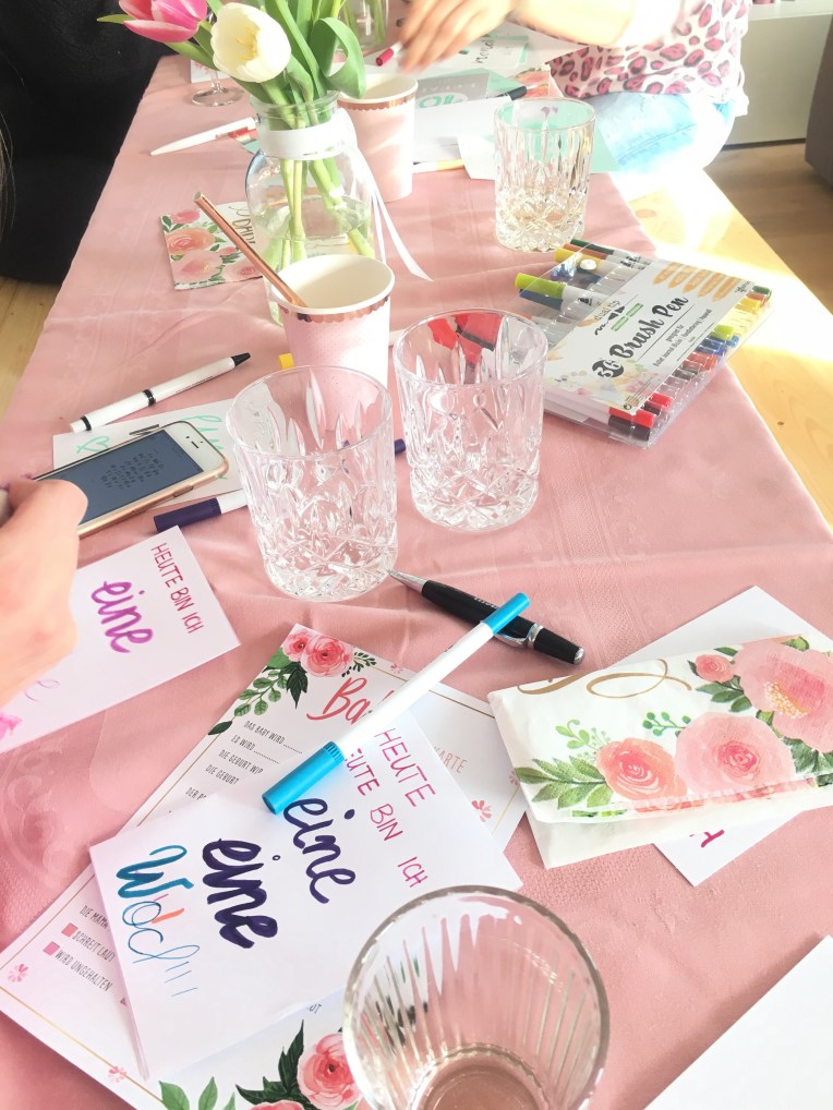 Das „Programm“ gestalteten wir auch so, dass es gut zu Bell passte. Seit Ende letzten Jahres fand sie Gefallen am Handlettering, also wurde das eingebaut. Die liebe Ramona (,die dann leider an der Party krank war) hatte dann die grandiose Idee Meilensteinkarten zu lettern. Unser Standardprogramm war sonst Body oder Lätzchen zu bemalen – daher war das mal was ganz Neues. Und: es war anfangs kurz schwierig, aber dann machte es den meisten Spaß und das Ergbnis ist der Hammer! Wir hatten eine Serie Karten als Vorlage und der Rest wurde frei und individuell gestaltet. (Stifte und Blankopostkarten mit 300g Papier gibts bei nem großen Onlineversand, der schnell liefern kann.)