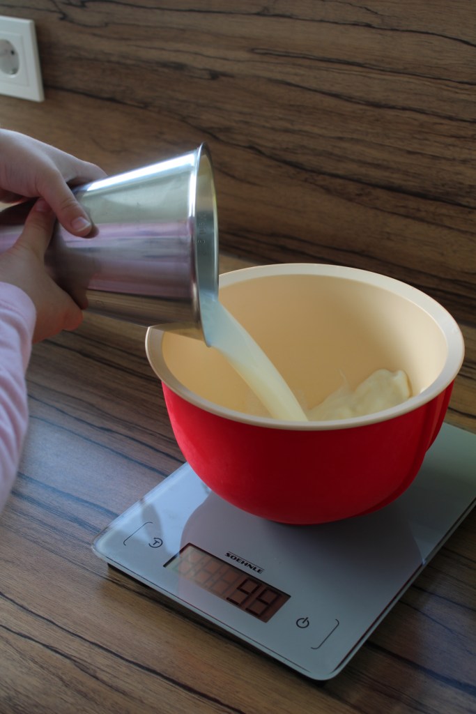 - Die Milch leicht anwärmen (37 Grad sind perfekt) und zusammen mit Hefe, Zucker und Vanillezucker verrühren.