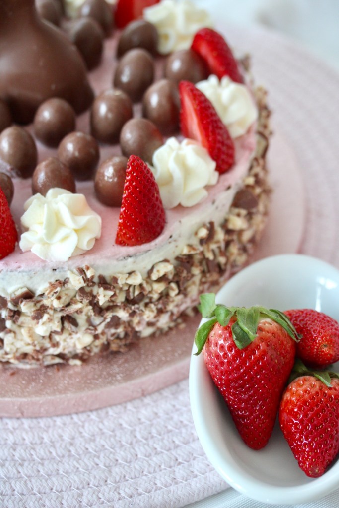 Wenn die Masse festgeworden ist, die Sahne mit dem Sahnesteif (und wer mag nochmals Vanillezucker) steif schlagen und das Törtchen damit einstreichen. Ca. 15 Schokobons mit einem scharfen Messer kleinhacken und außen mit einer Teigkarte auf die Sahneschicht drücken . Mit den restlichen Schokobons und (an Ostern) mit einen Schokohasen das Törtchen dekorieren und die restliche Sahne als Tupfer aufspritzen. Dazwischen halbierte Erdbeeren setzen. Fertig 🙂