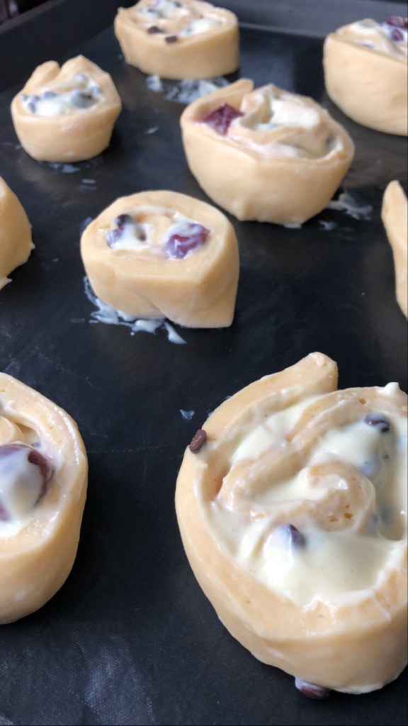 Nun wird der Teig aufgerollt, hier immer den Teig leicht anheben und locker wickeln, da sonst die Kirschen rutschen (Tipp 2). Von der Teigrolle werden jetzt ca. 3 – 4 cm dicke Scheiben geschnitten. Vorsichtig schneiden und wenig drücken, da sonst die Füllung rausdrückt. Tipp: Das Messer nach jeder Schnecke mit einem Zewa abputzen! Die Schnecken auf ein Blech mit Backfolie setzen und dort nochmal etwas zurechtrücken, wenn sie verzogen sind. Alles halb so wild 🙂