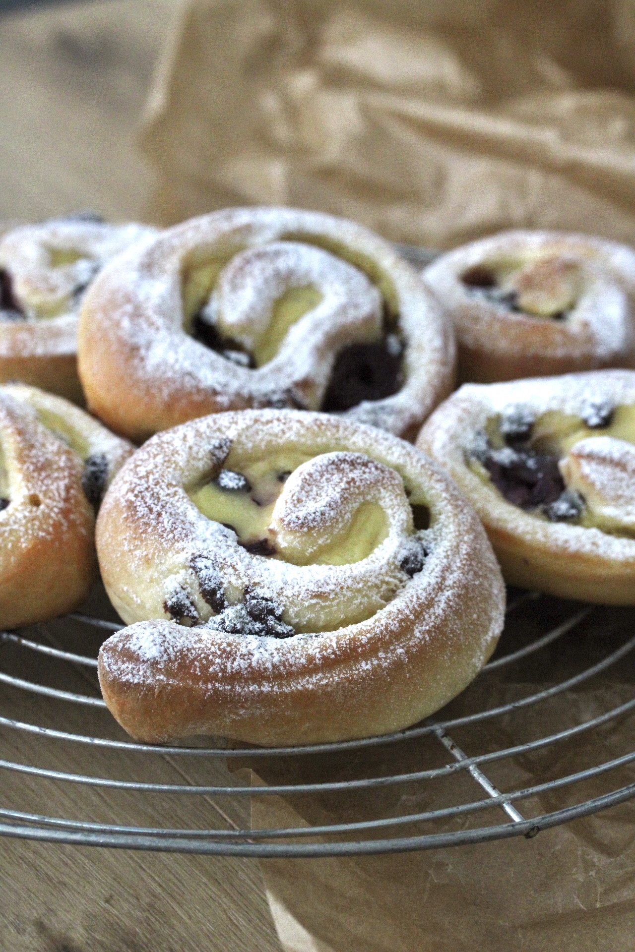 Die ausgekühlten Schnecken könnt ihr mit Puderzucker bestäuben oder mit Zitronenguss (Saft einer halben Zitrone/ 100g Puderzucker) einpinseln.