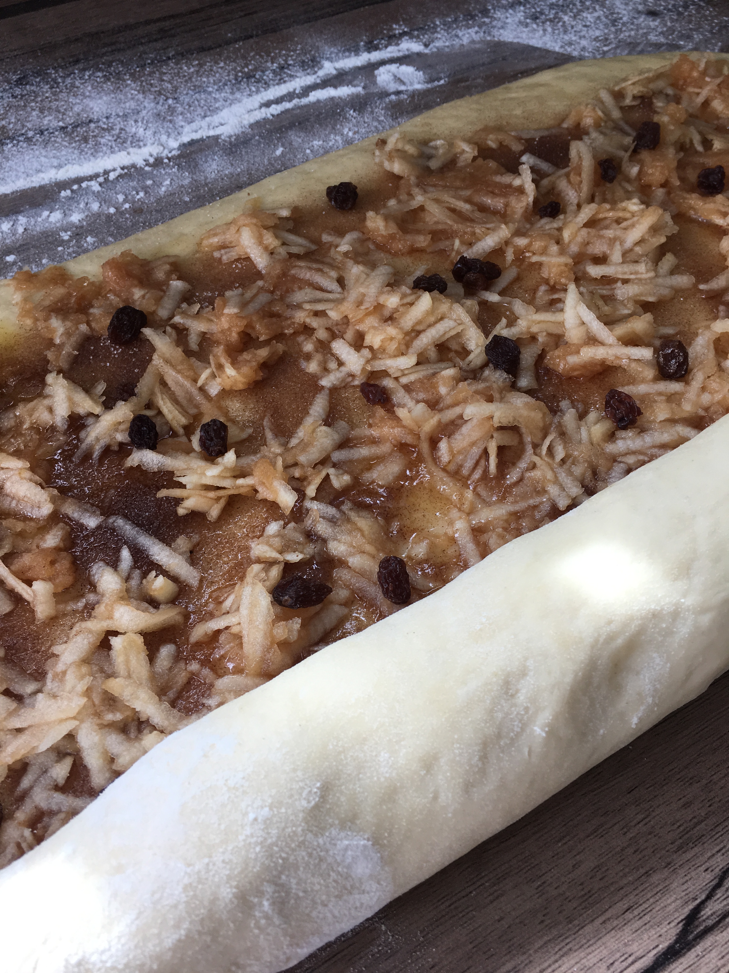 - Die geraspelten Äpfel und die Rosinen darauf verteilen.