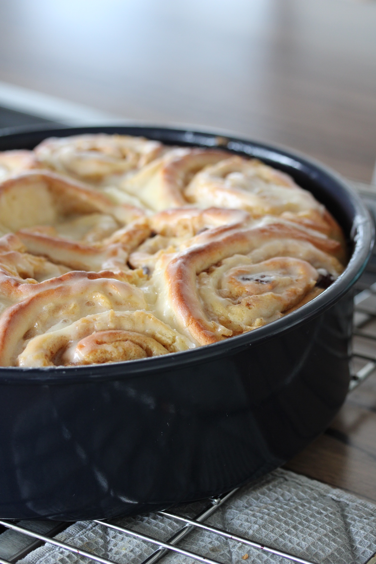 Tipp: Ihr könnt die Schnecken auch in mehreren Blechen (2mal 20cm) backen oder in einer Auflaufform. Entsprechend könnt ihr die Backzeit etwas verkürzen oder erhöhen.