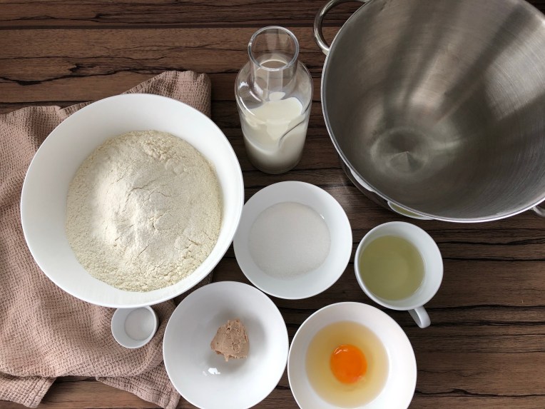 - Milch erwärmen auf ca. 40 Grad und mit Hefe, Öl, Zucker und Vanillezucker verrühren.