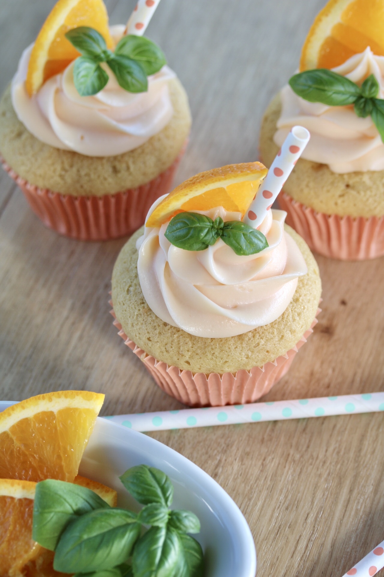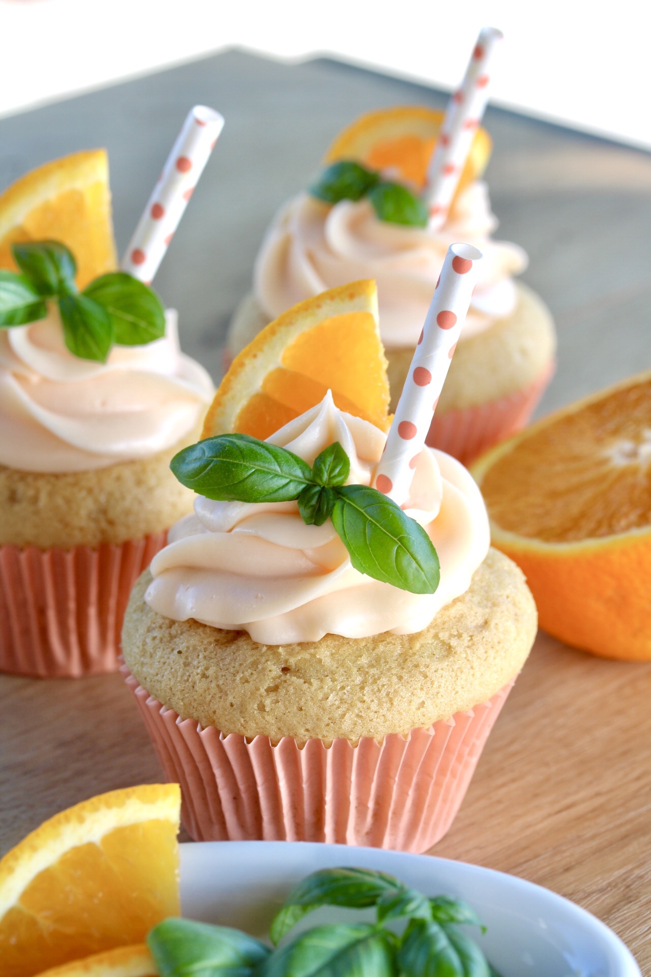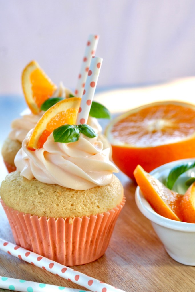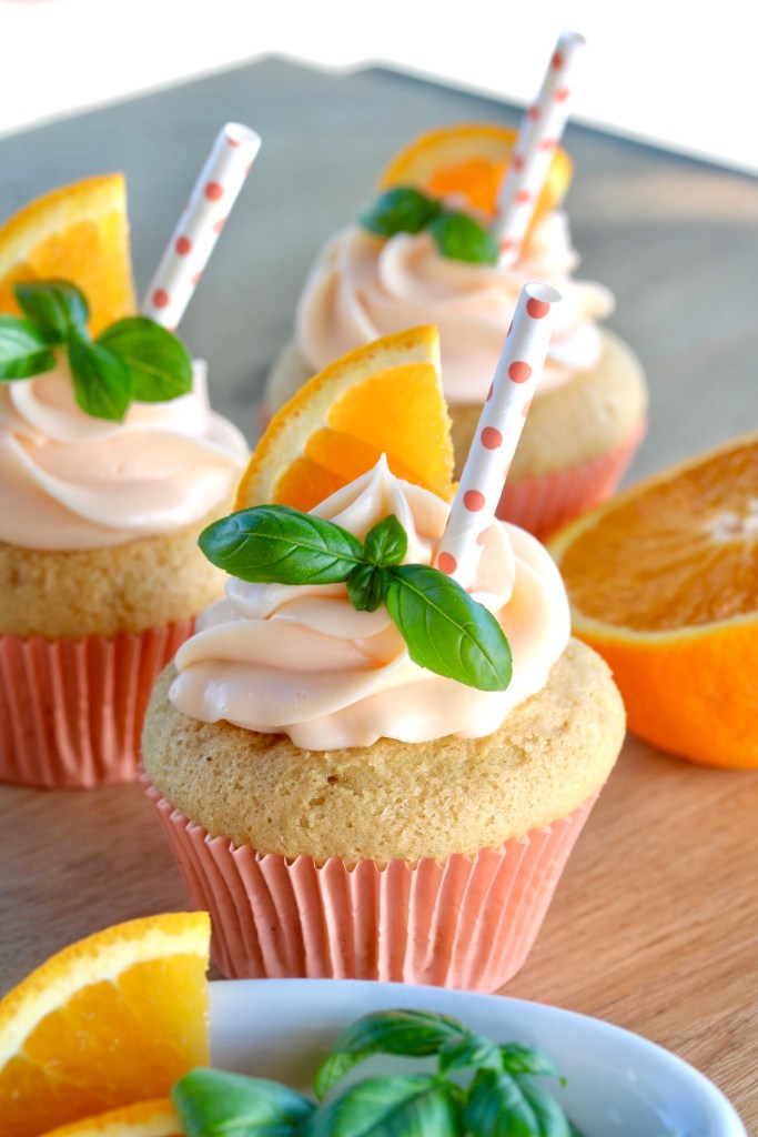 In jeden Cocktail gehört ein Strohhalm. Also Strohhalm ins aufgespritze Frosting stecken, ein Stück Orange und etwas Basilikum dazu – wie beim echten Drink ❤