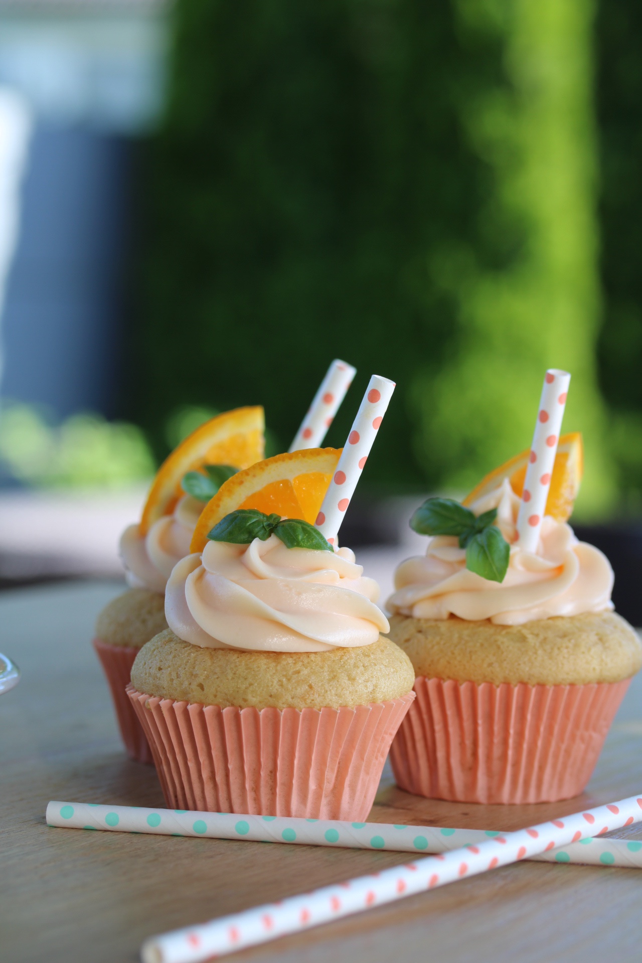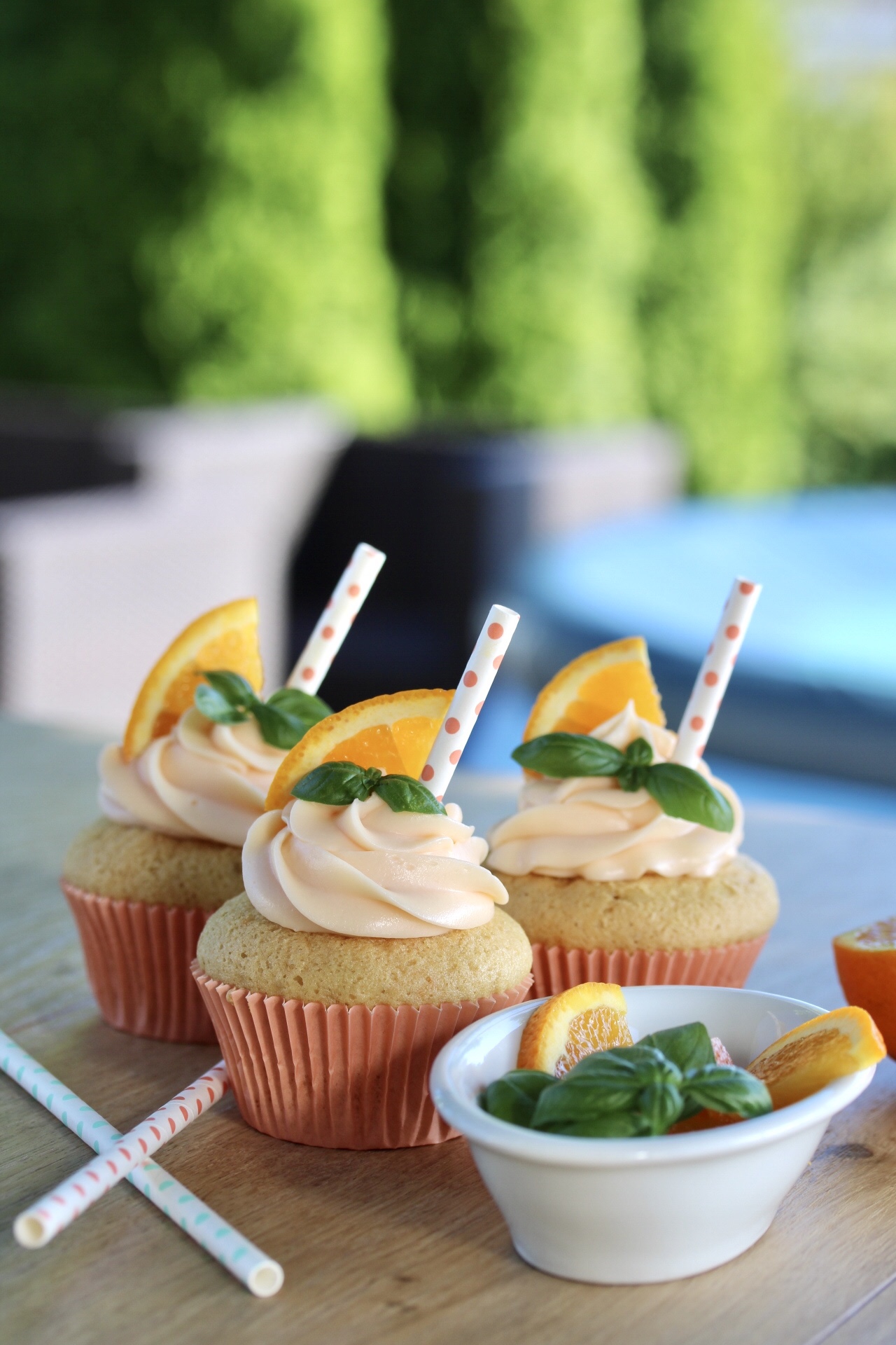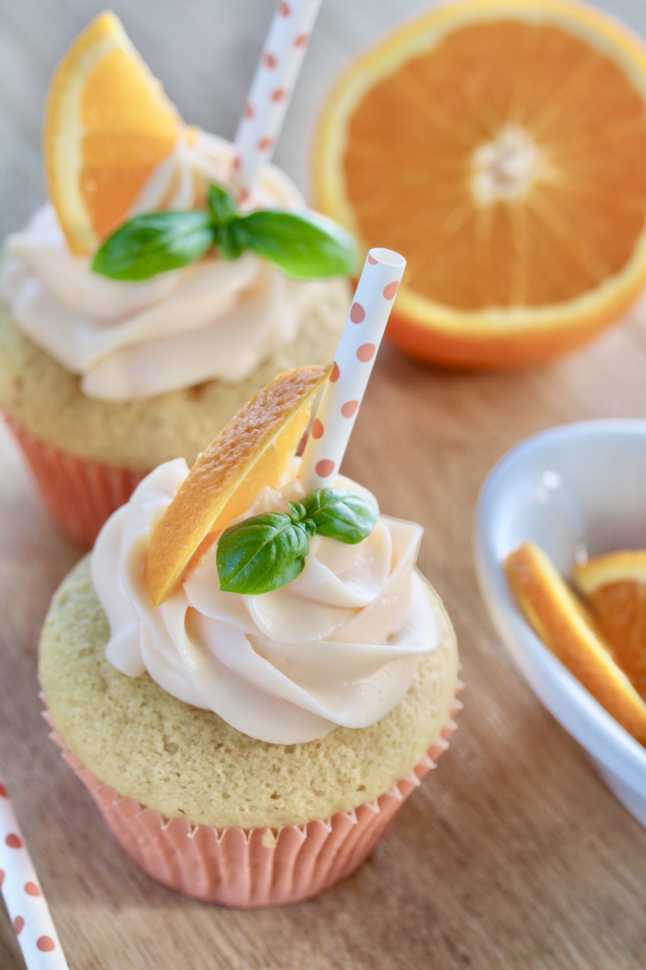 In jeden Cocktail gehört ein Strohhalm. Also Strohhalm ins aufgespritze Frosting stecken, ein Stück Orange und etwas Basilikum dazu – wie beim echten Drink ❤