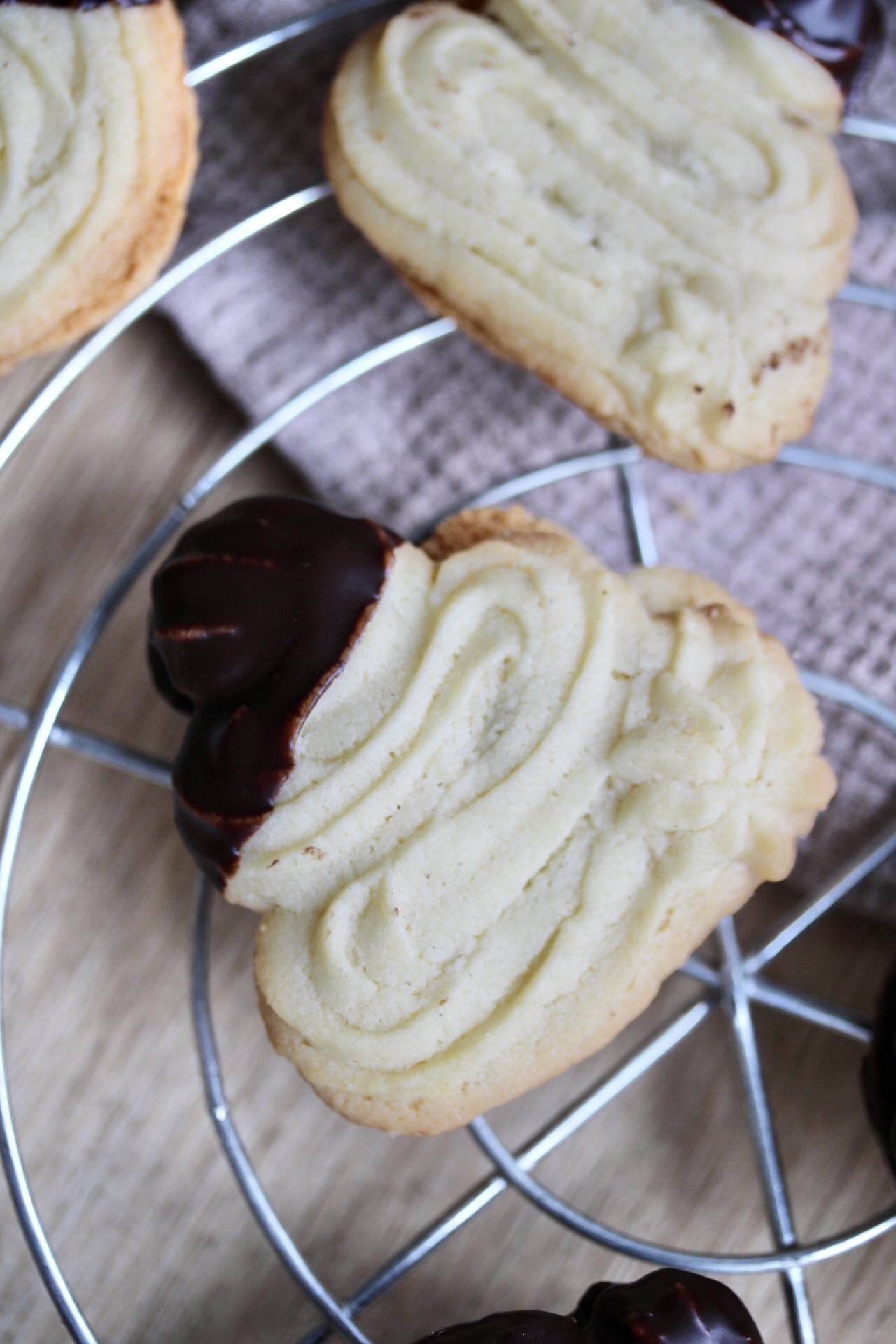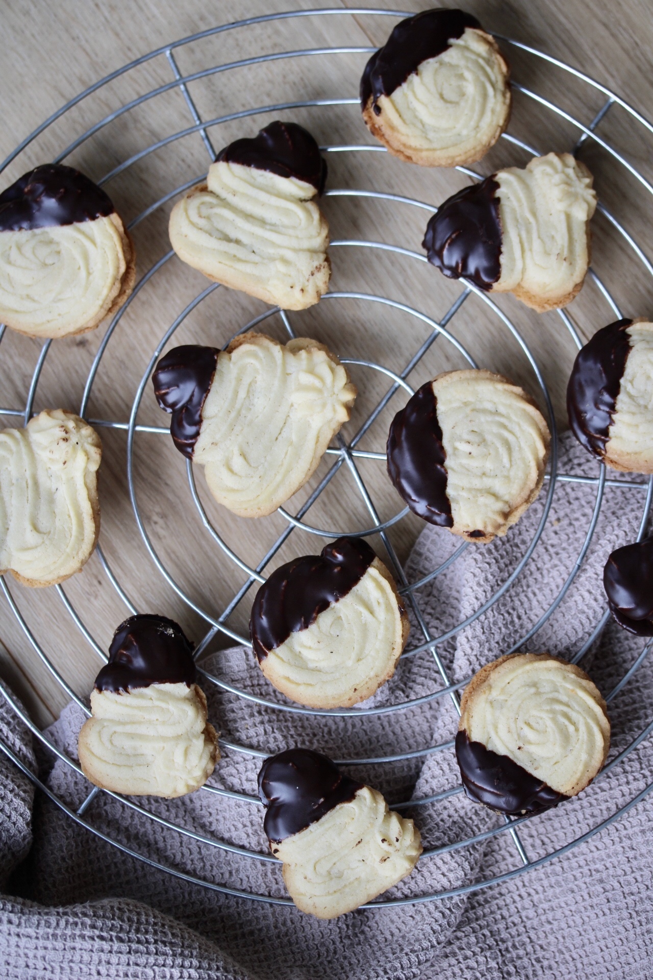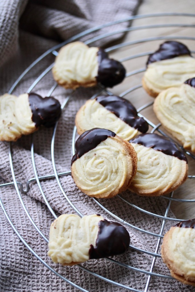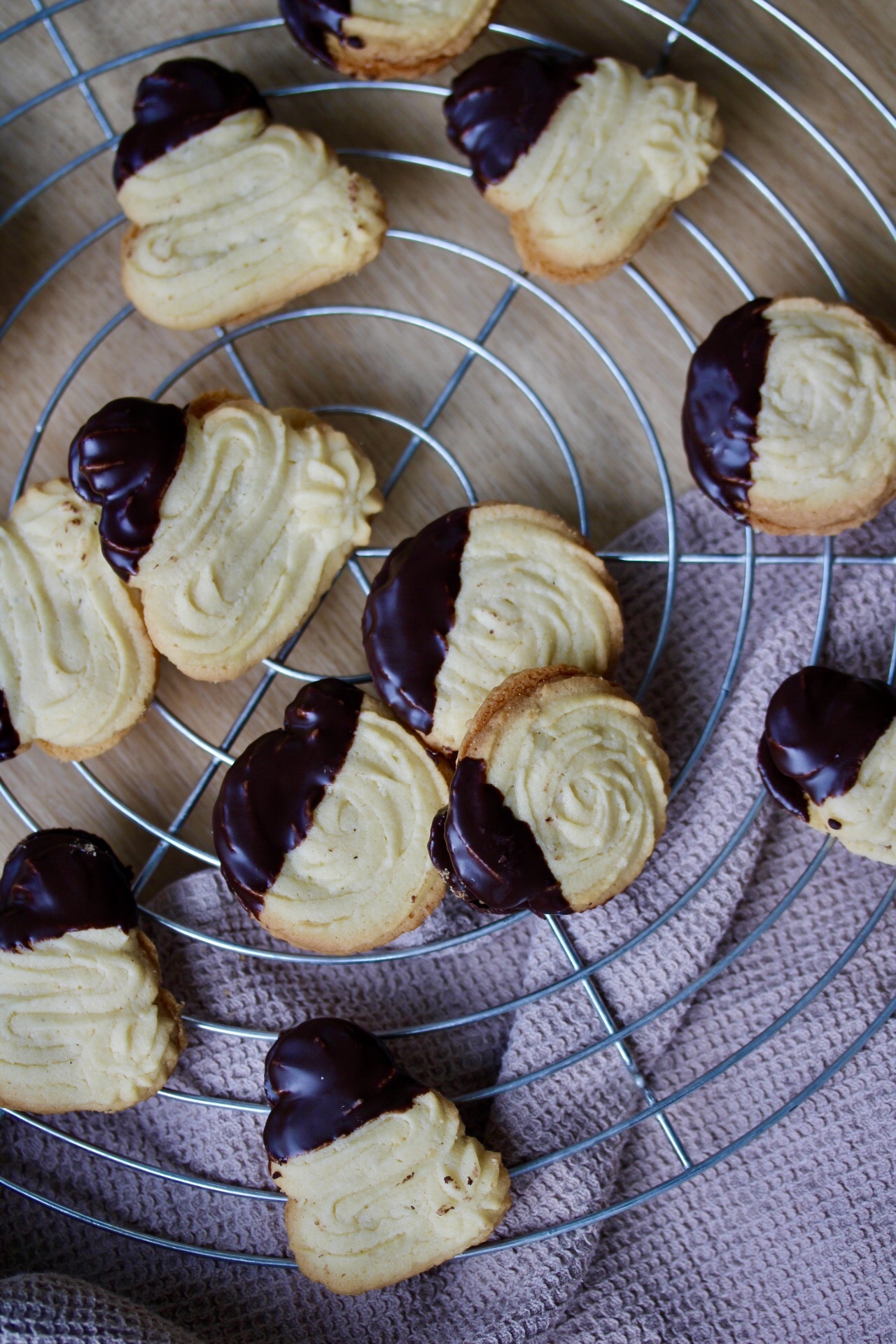 Gebacken werden sie bei 180Grad Ober/Unterhitze im vorgeheizten Backofen. Je nachdem wie groß ihr sie spritzt (nochmal zur Sicherheit: Platz lassen, sie verlaufen etwas) brauchen sie ca. 8 Minuten bis 12 Minuten. Fertig sind sie, wenn der Rand leicht braun ist.