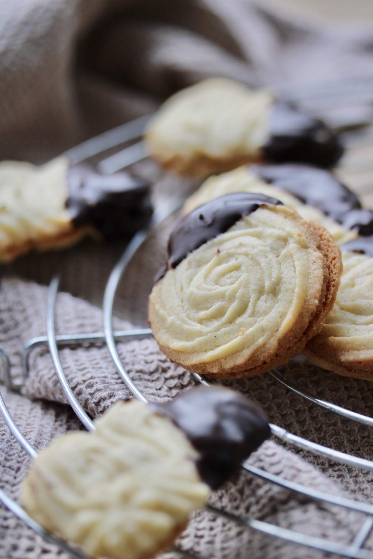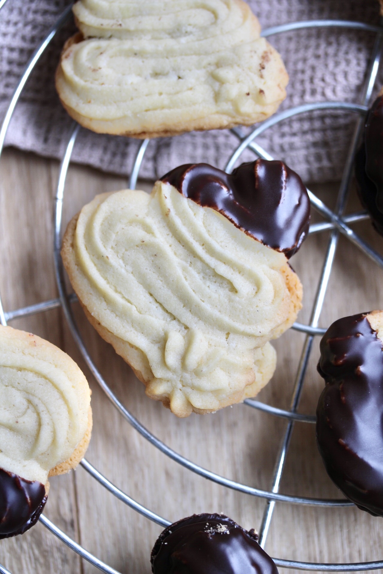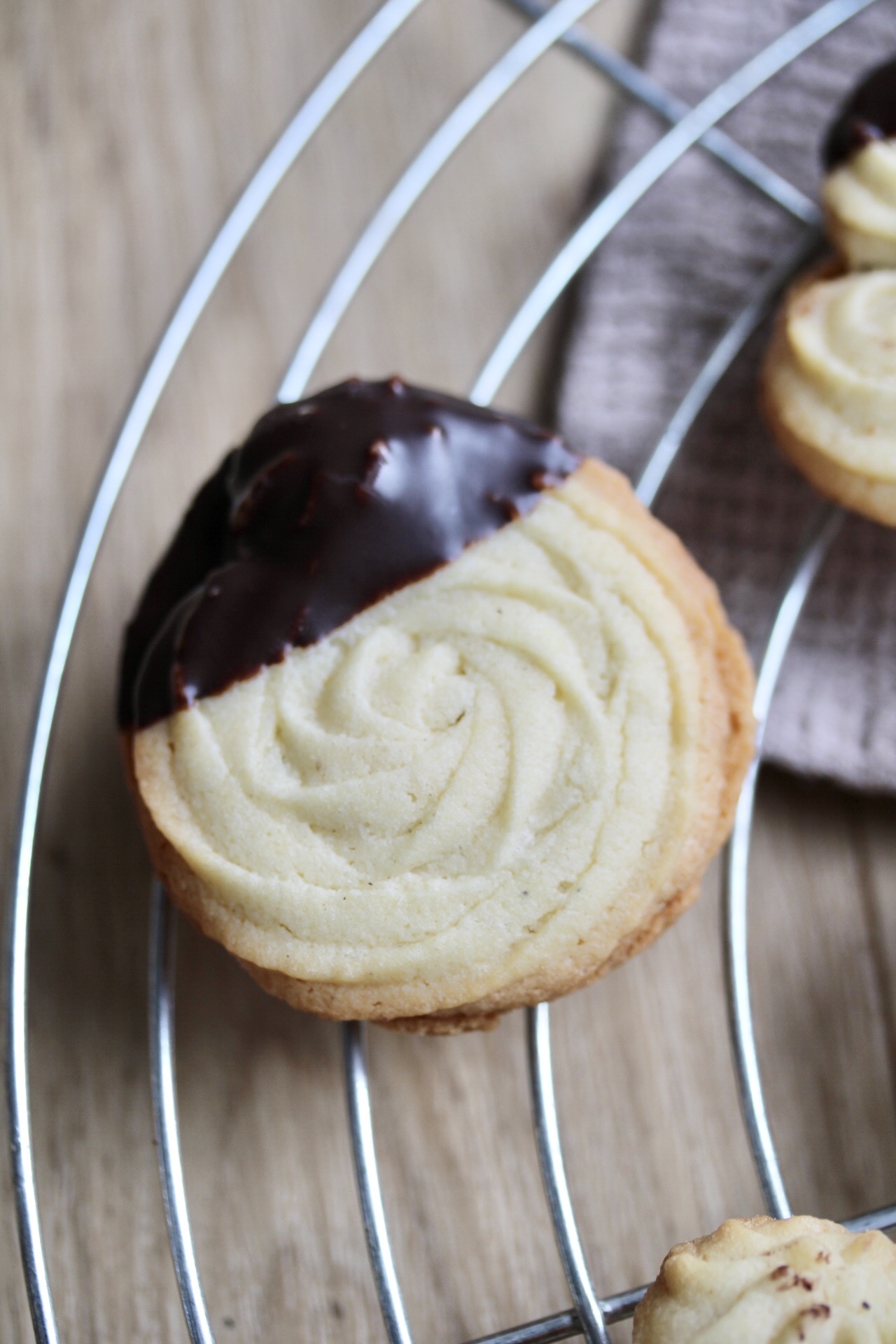 Gebacken werden sie bei 180Grad Ober/Unterhitze im vorgeheizten Backofen. Je nachdem wie groß ihr sie spritzt (nochmal zur Sicherheit: Platz lassen, sie verlaufen etwas) brauchen sie ca. 8 Minuten bis 12 Minuten. Fertig sind sie, wenn der Rand leicht braun ist.