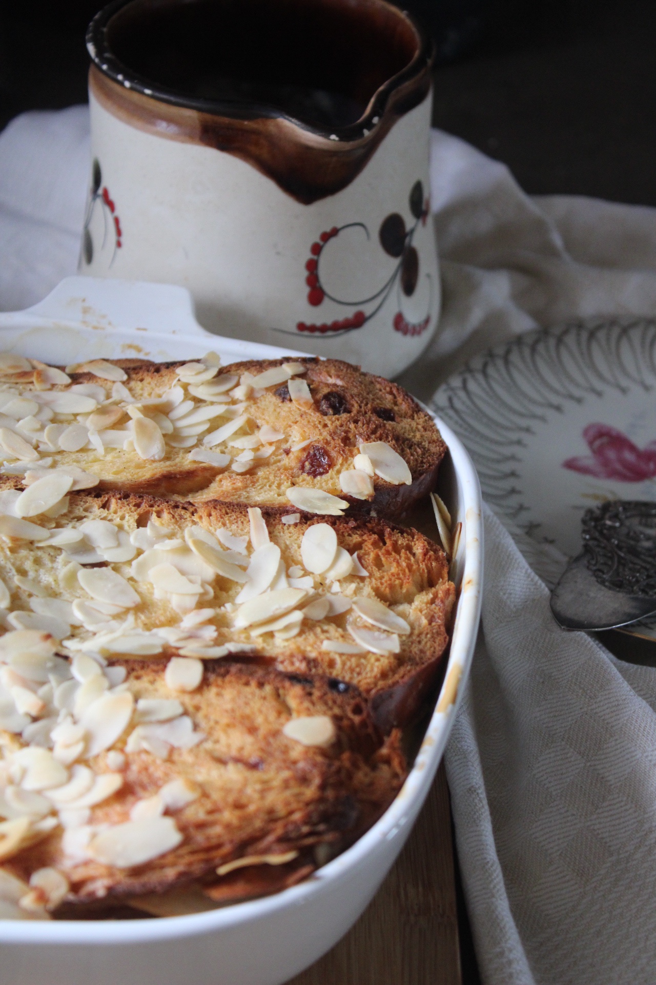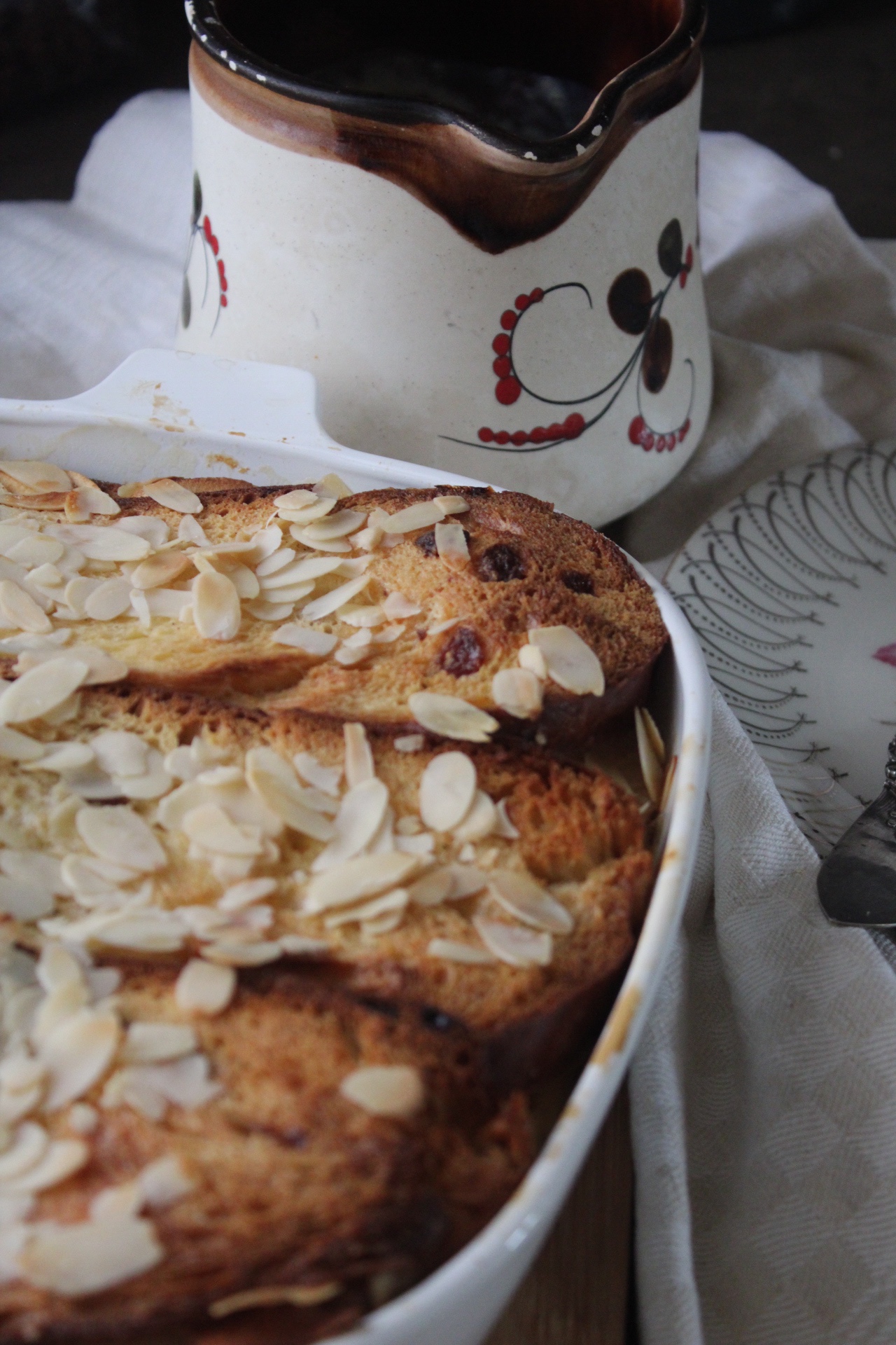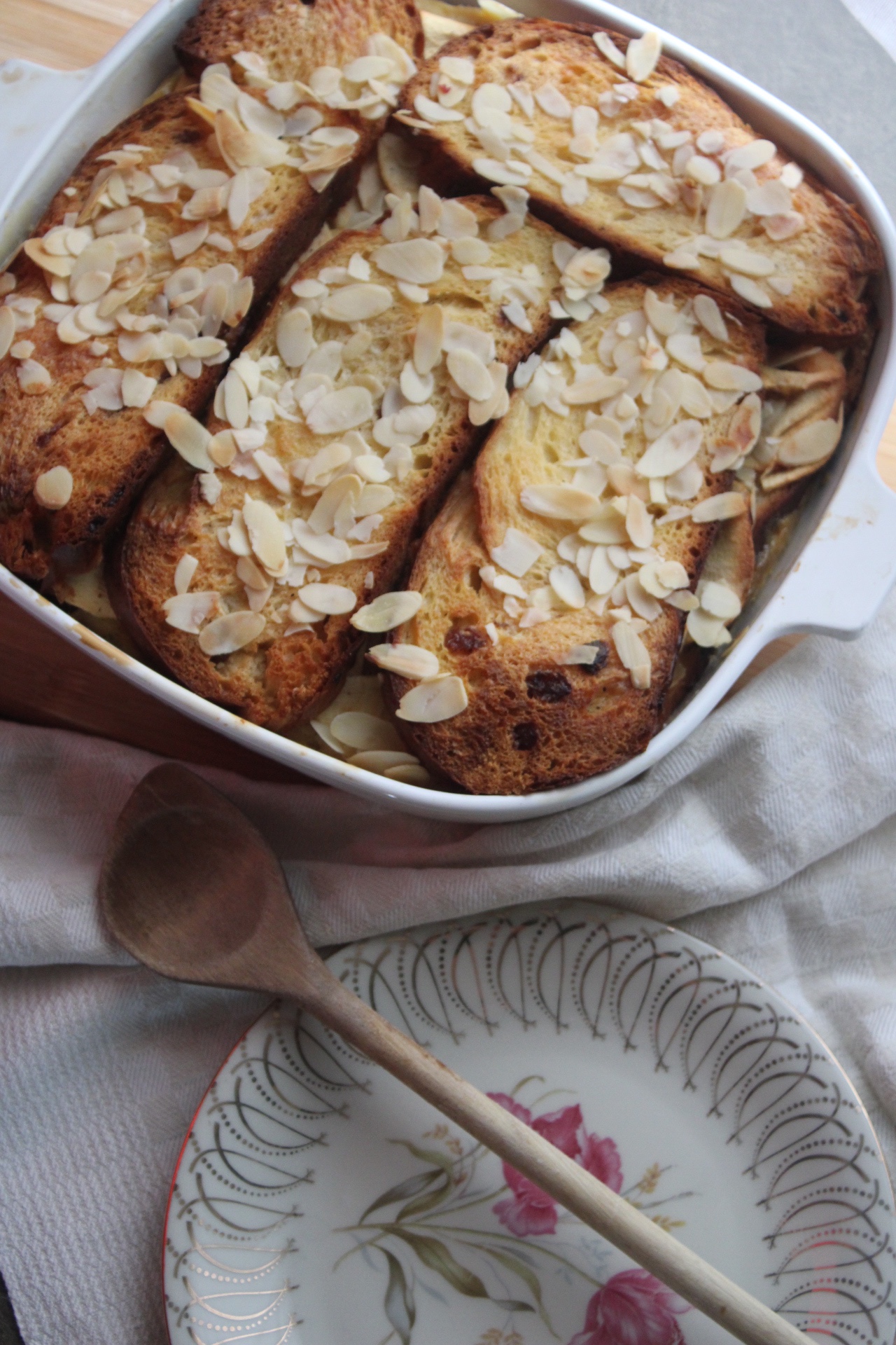 - Am Ende streut man die Mandelblättchen auf den Ofenschlupfer und setzt Butterflöckchen darauf.