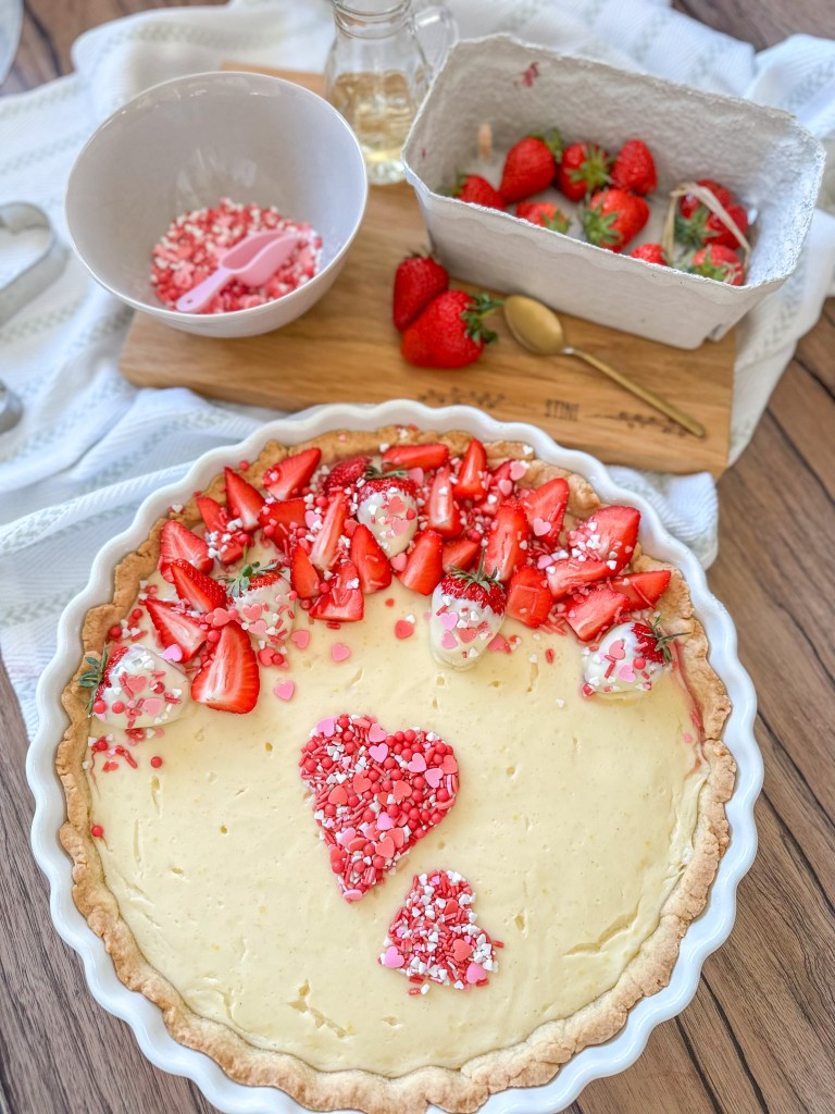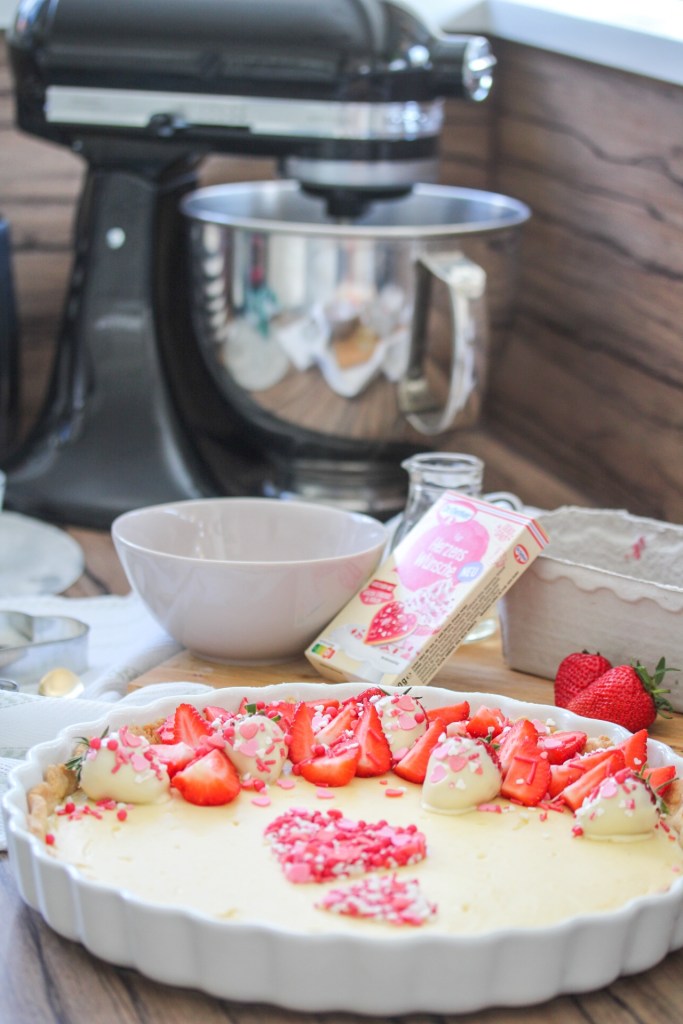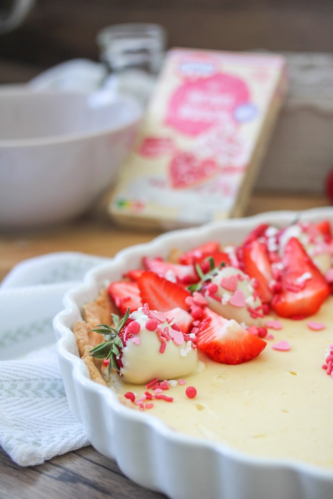 und aushärten lassen. - Die Tarte abkühlen lassen und nach Belieben mit Erdbeeren und Streuseln verzieren.