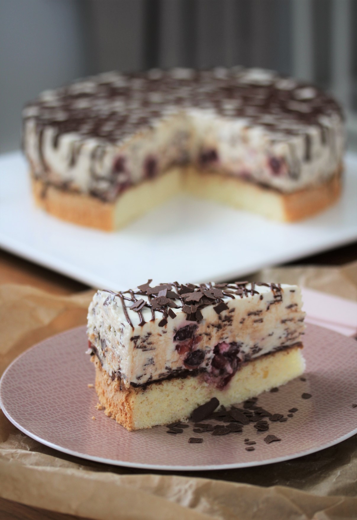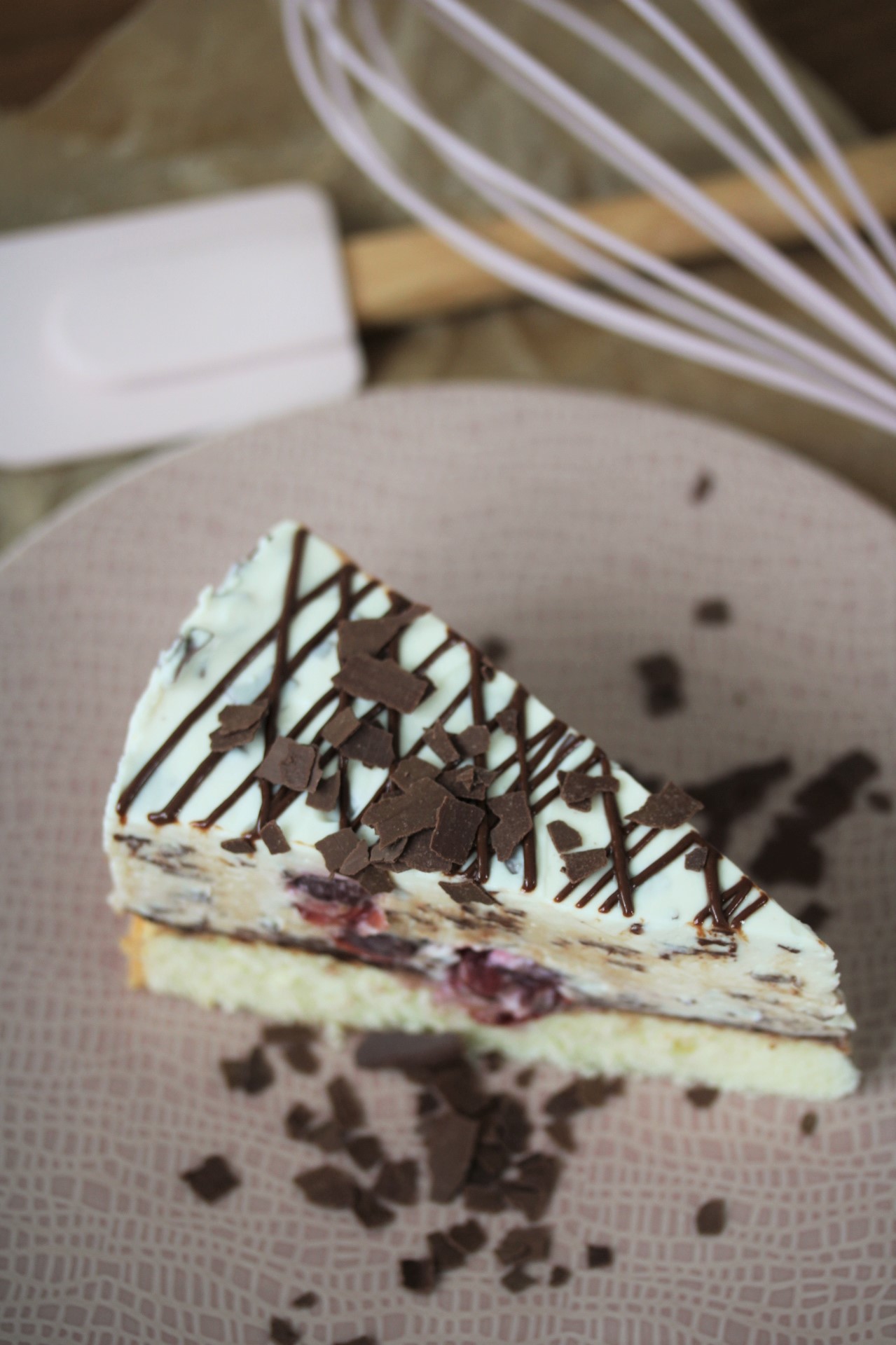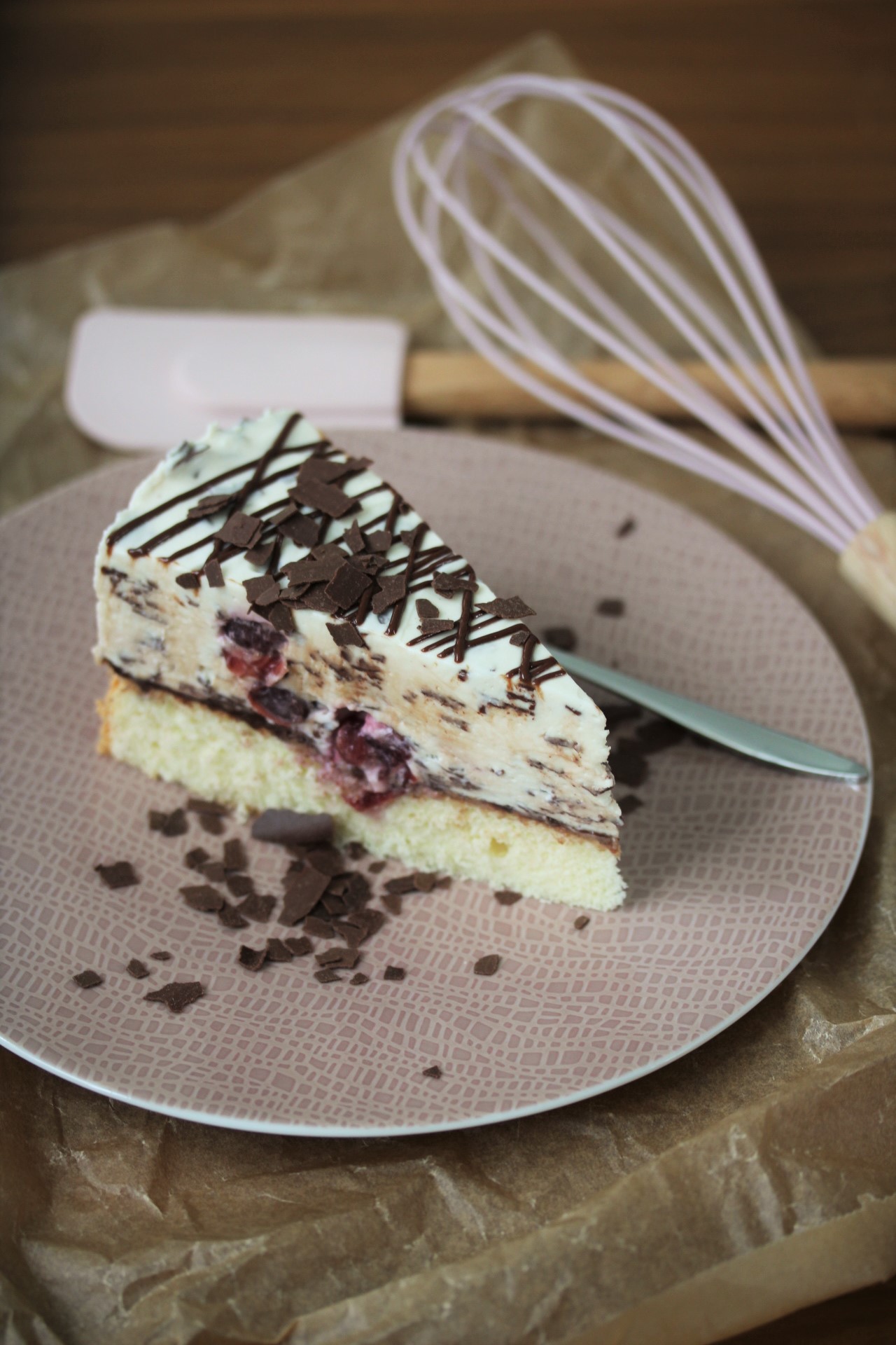 Nun die Sahne in die Masse einrühren, dann vorsichtig die geraspelte Schokolade und die Kirschen vorsichtig unterheben.